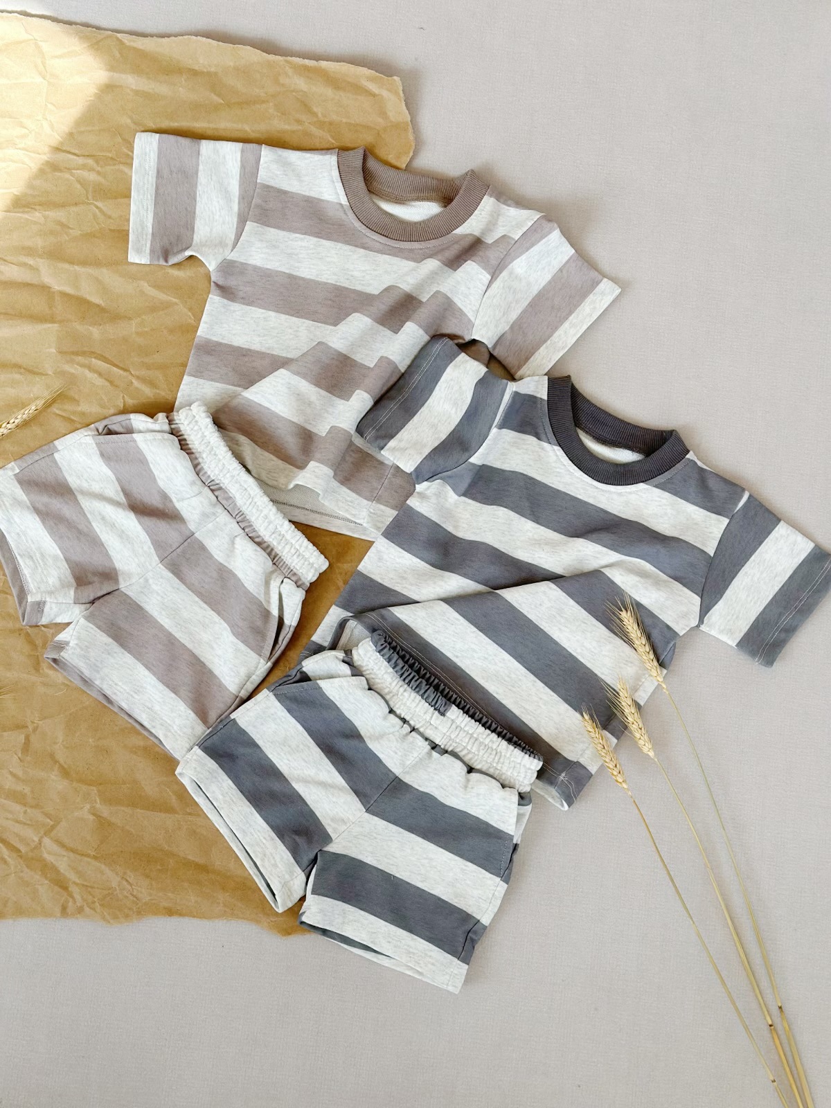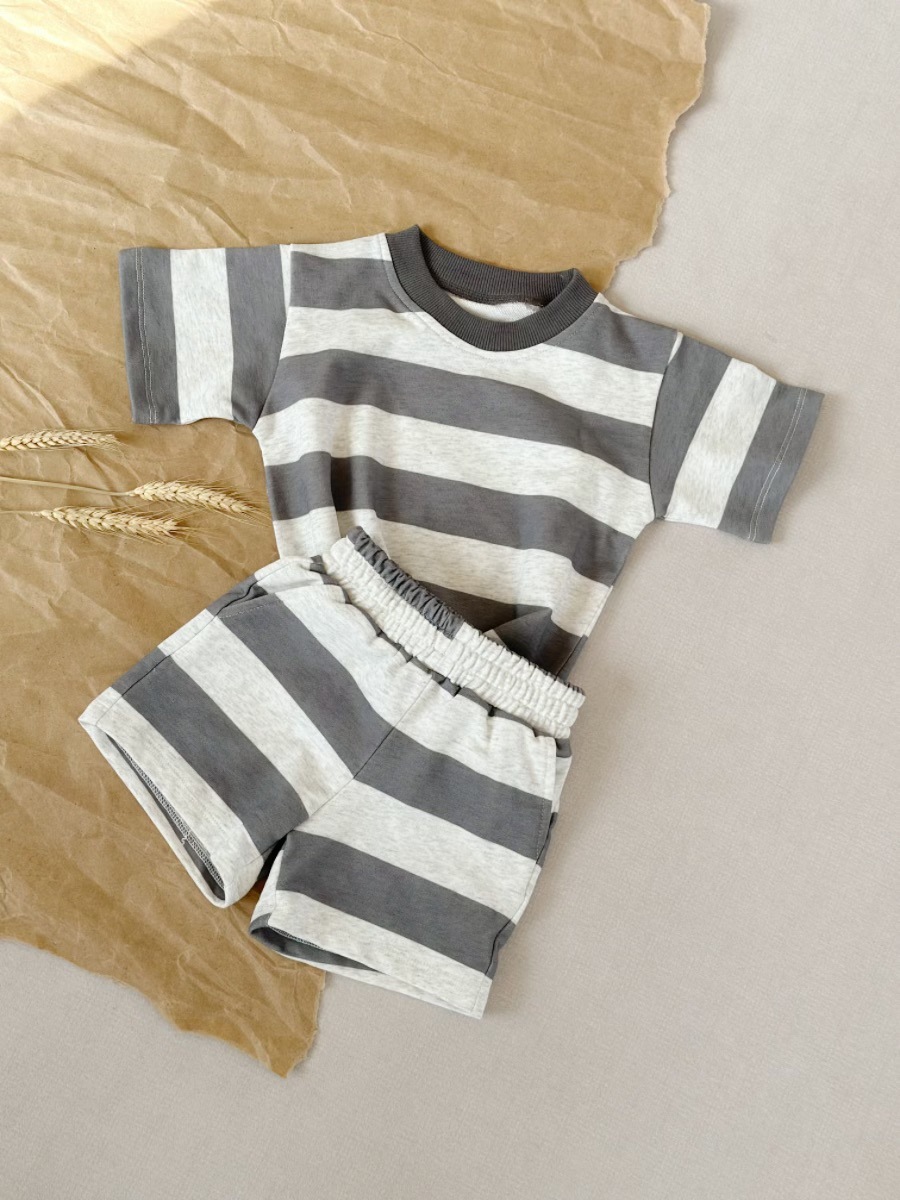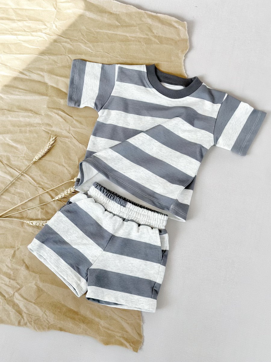 Ins 대외 무역 크로스 보더 소년 여름 어린이 정장 남성과 여성 베이비 스트라이프 반팔 다목적 티셔츠 반바지 투피스 세트
