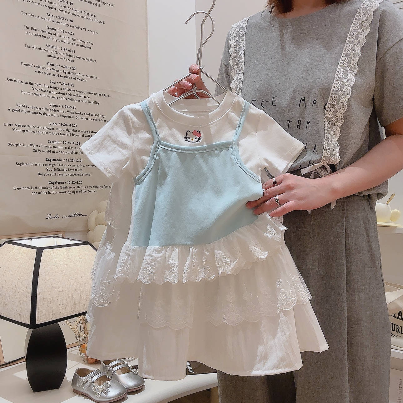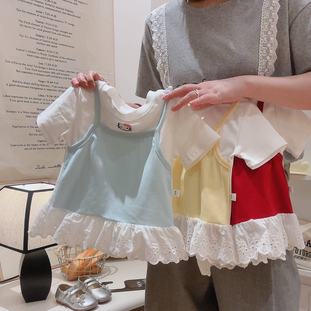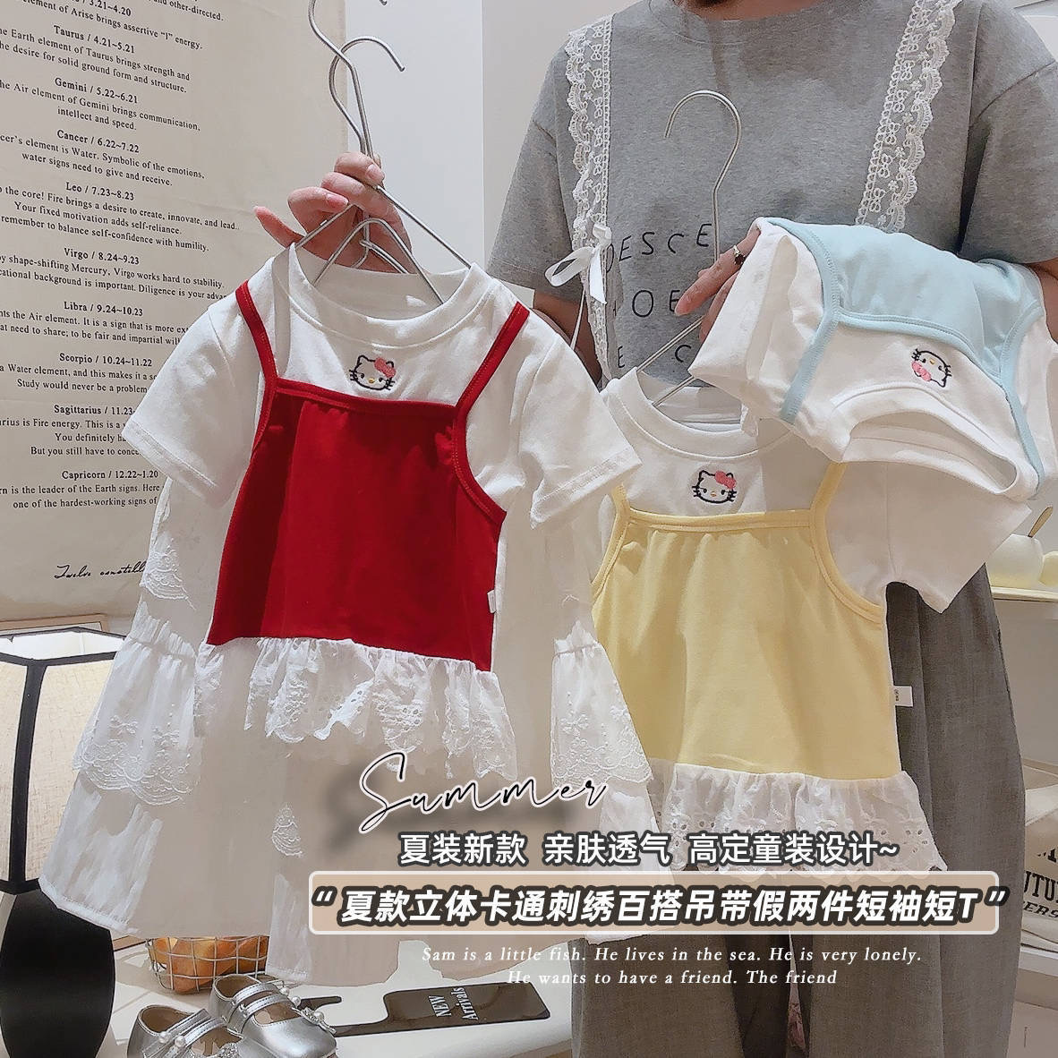 2025 여름 새 소녀 달콤한 가짜 투피스 자수 반팔 티셔츠 폭발성 코튼 탑스토어 가기
