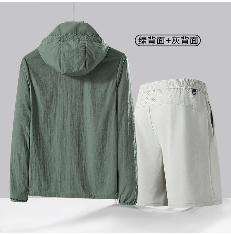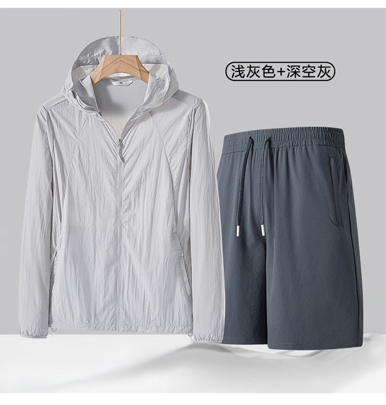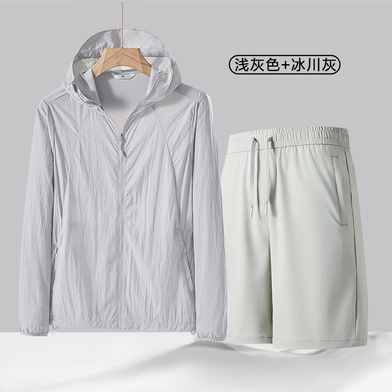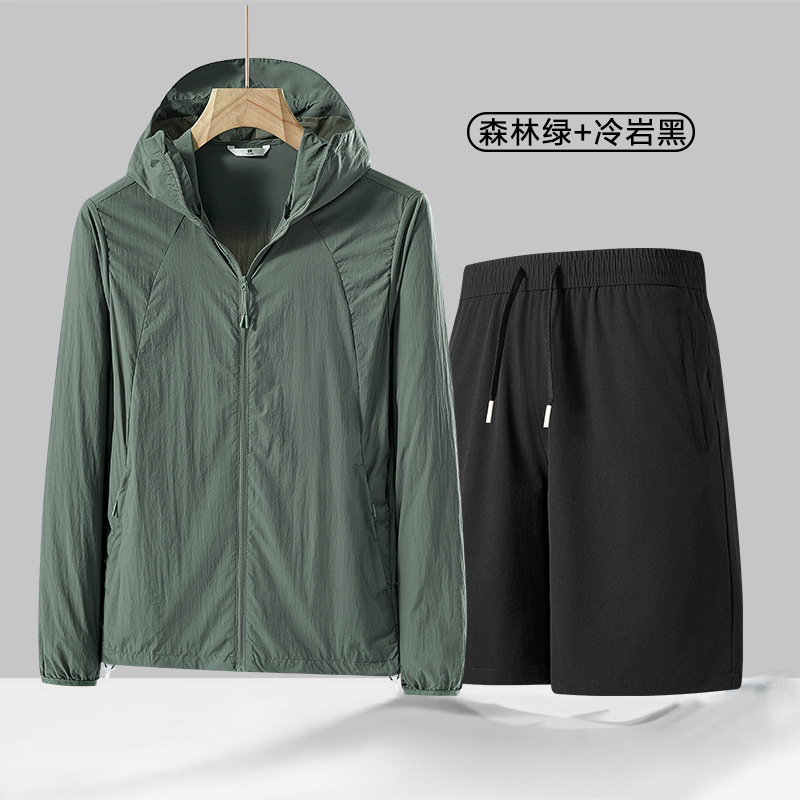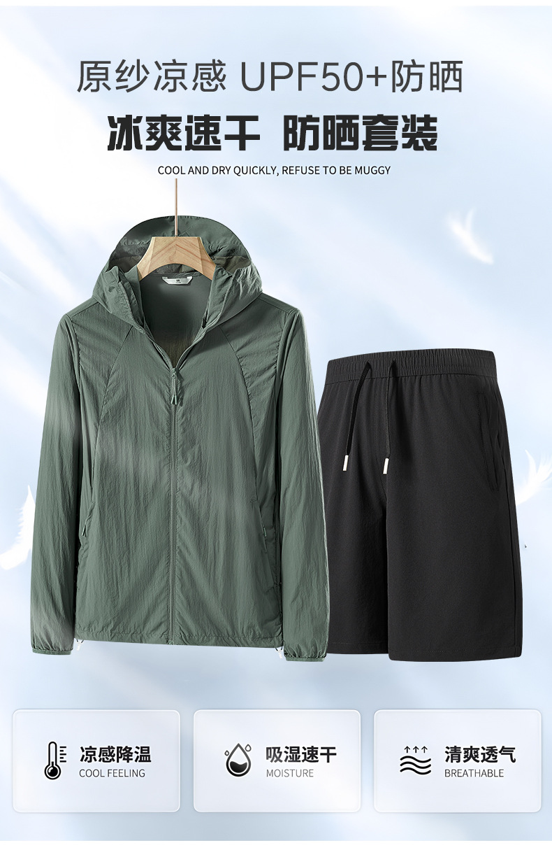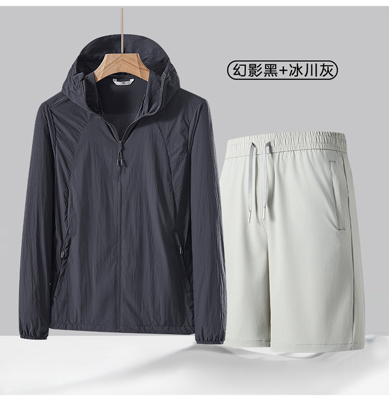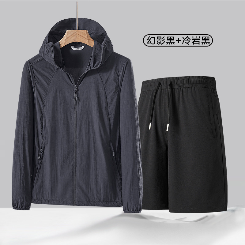 여름 얇은 UPF50 선 스크린 반바지 투피스 세트 남성 야외 안티 자외선 아이스 실크 후드 스포츠 세트스토어 가기
