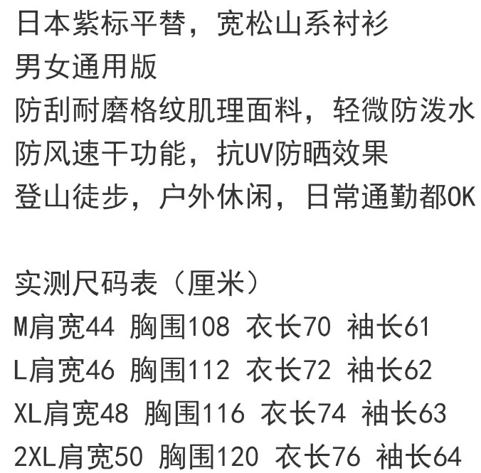 야외 산 스크래치 방지 내마모성 빠른 건조 발수성 느슨한 긴팔 셔츠가있는 남성과 여성을위한 보라색 표준 평면 일본어 버전