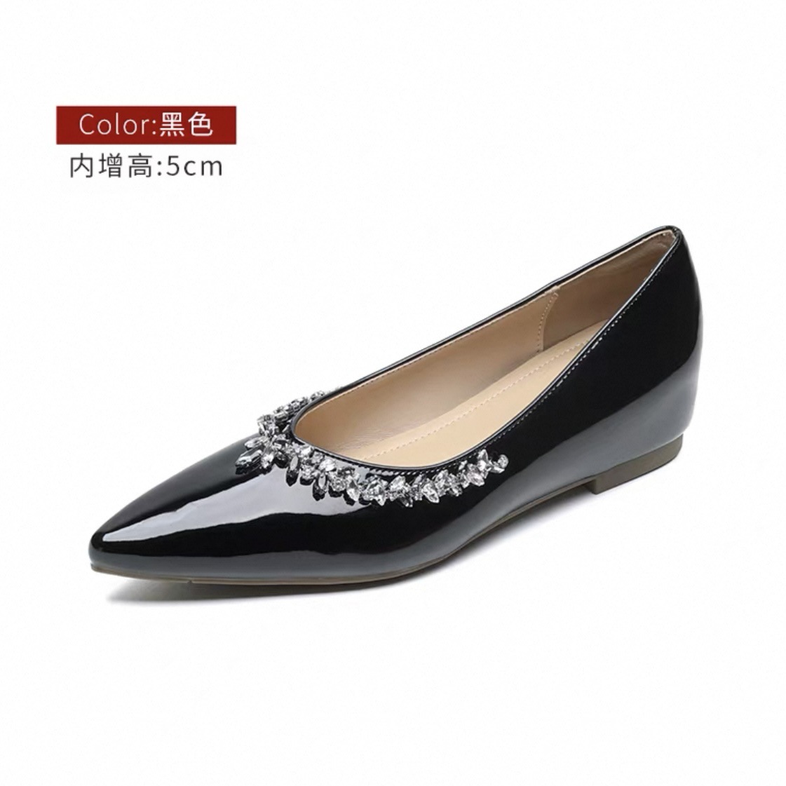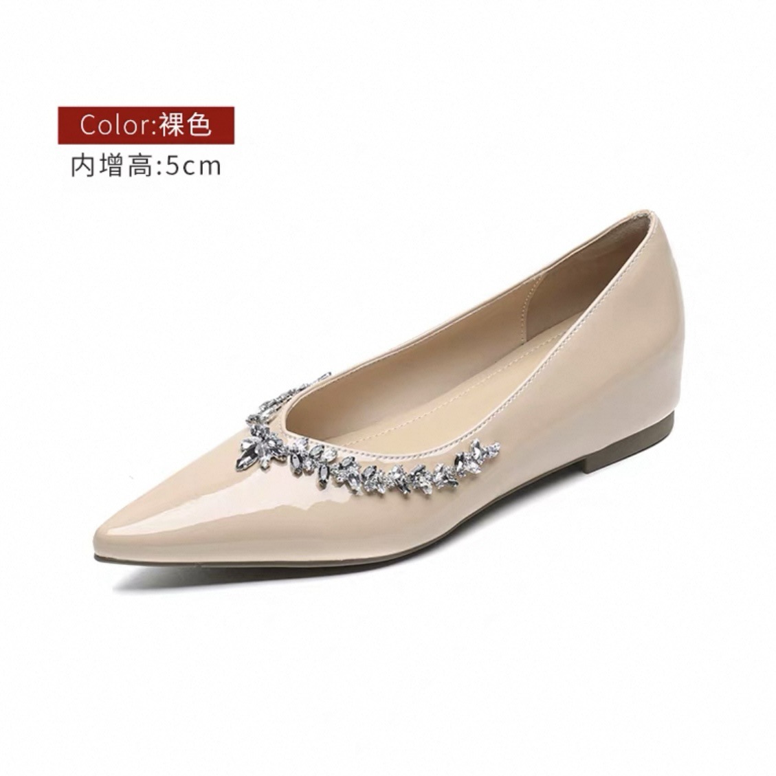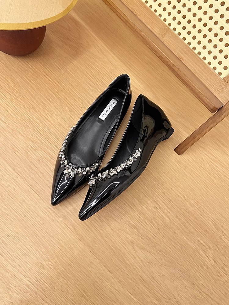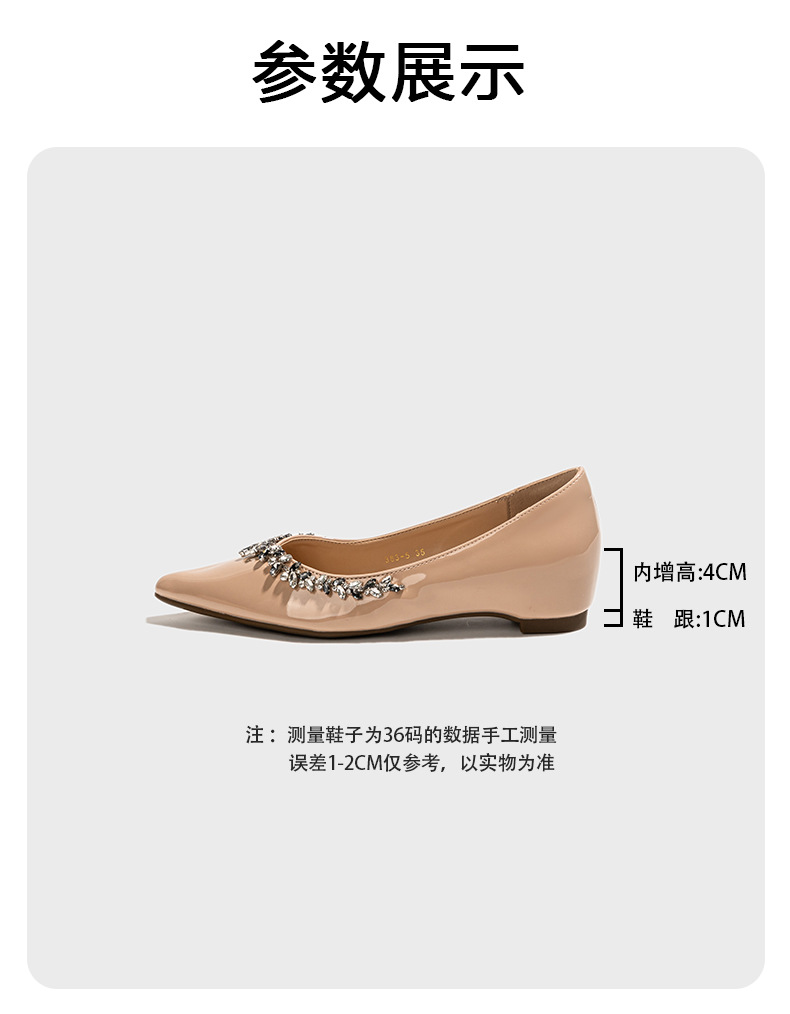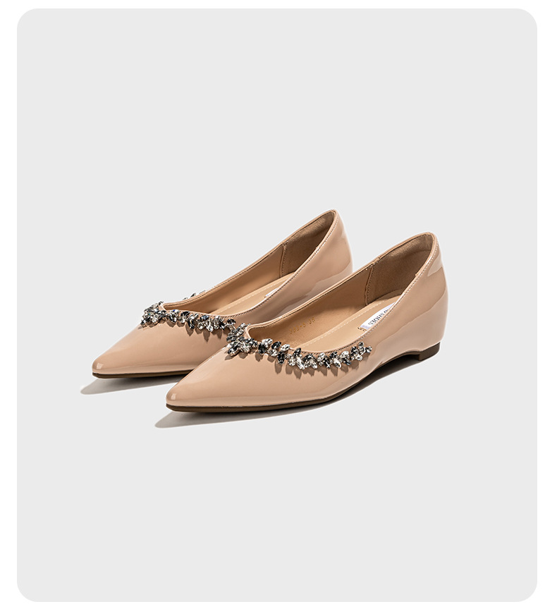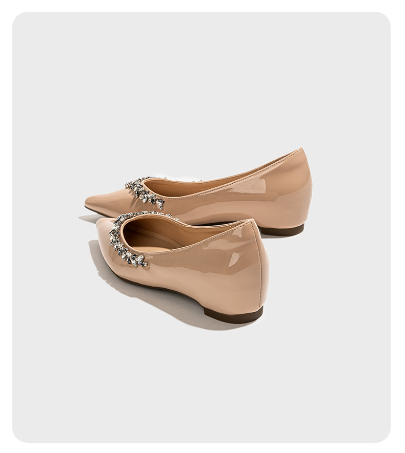 정품 가죽 ~ 프랑스 심야 스타일 라인스톤 포인팅 플랫 신발 여성용 얕은 입 내부 높이 증가 싱글 레이어 신발 통근 여성 신발 소프트 솔