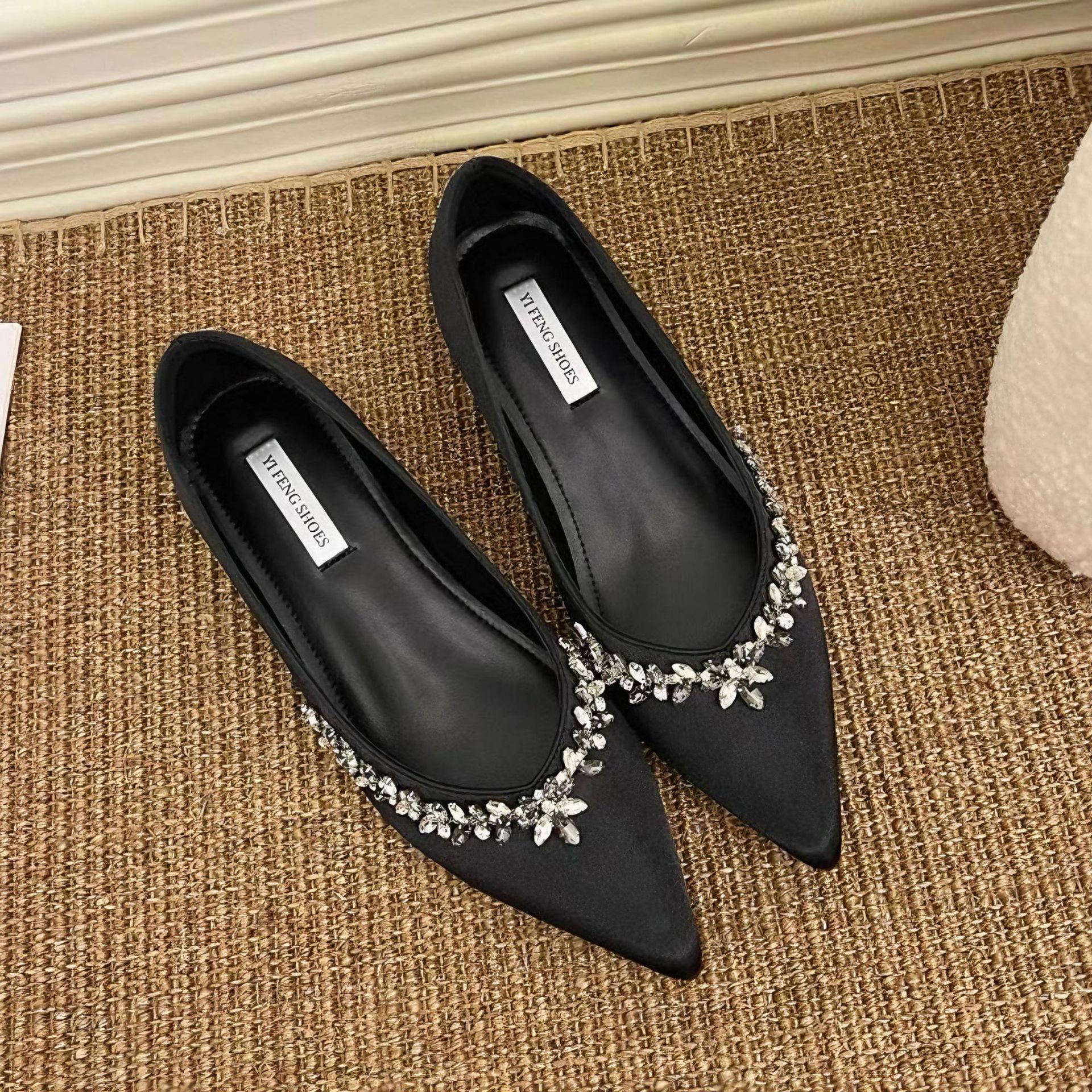 정품 가죽 ~ 프랑스 심야 스타일 라인스톤 포인팅 플랫 신발 여성용 얕은 입 내부 높이 증가 싱글 레이어 신발 통근 여성 신발 소프트 솔스토어 가기