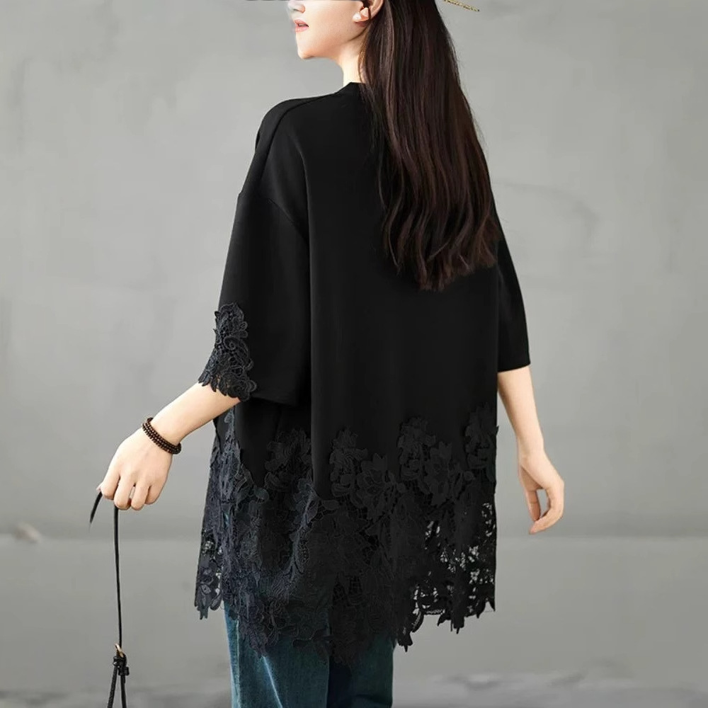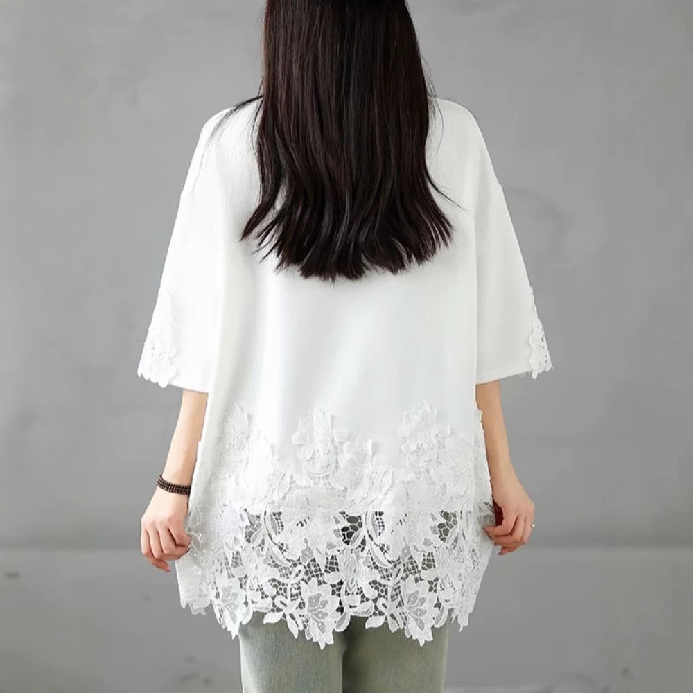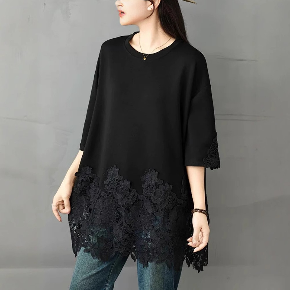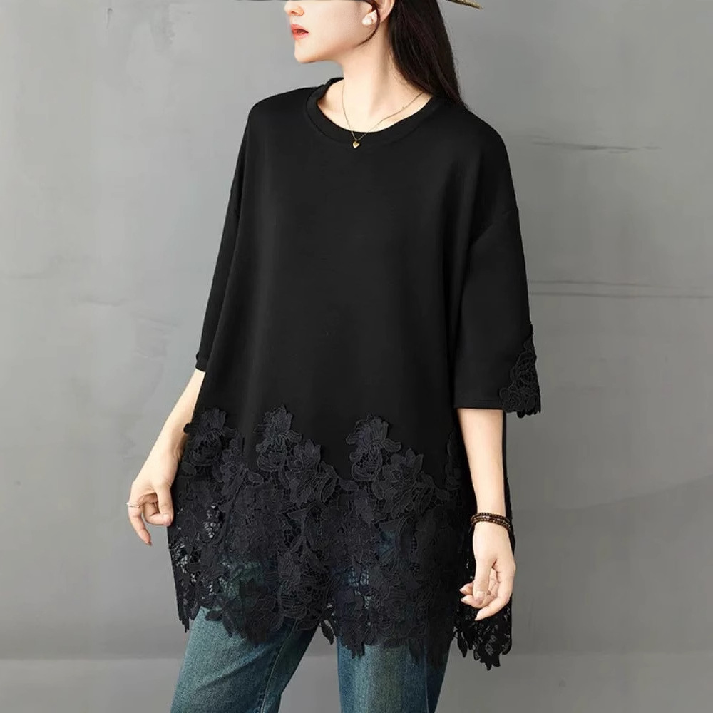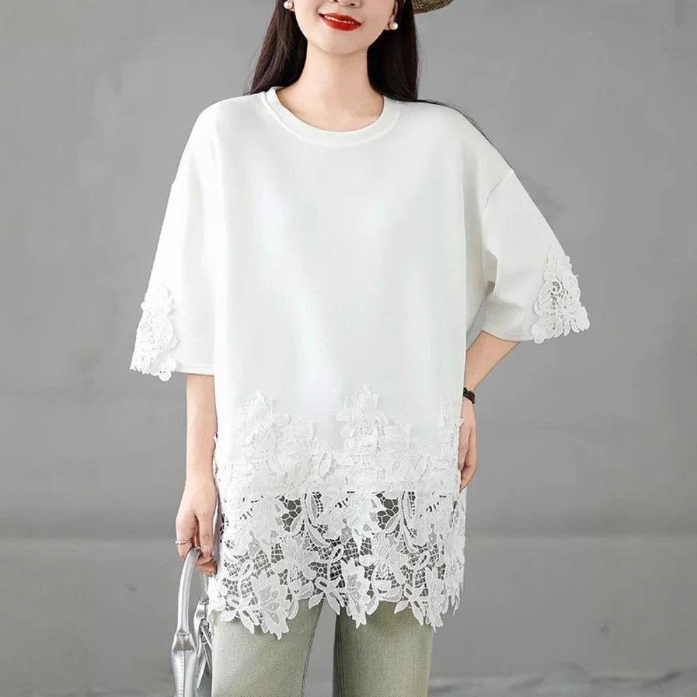 여름 하이 엔드 캐주얼 티셔츠 여성 플러스 사이즈 150.00kg 레이스 바느질 반팔 중간 길이 탑