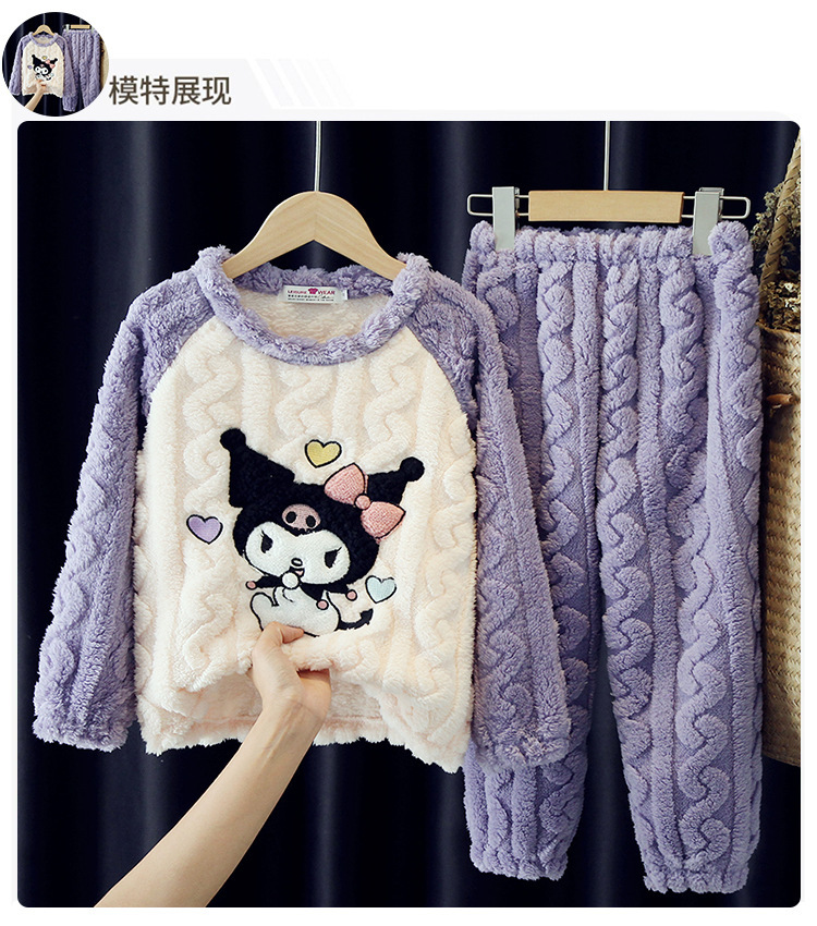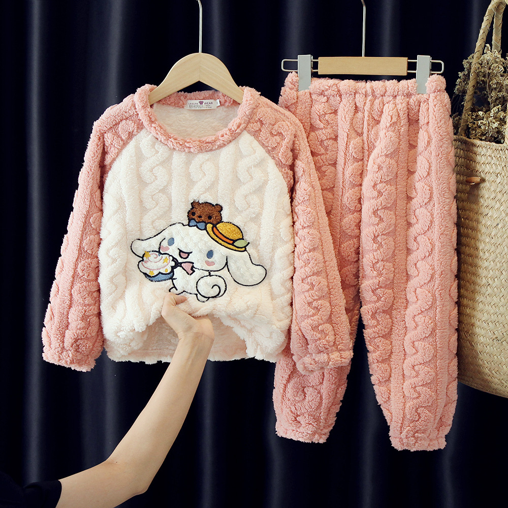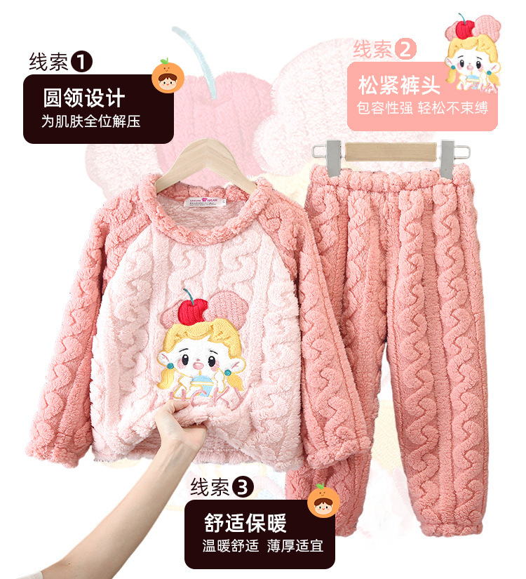 2024 새로운 어린이 잠옷 가을, 겨울 두꺼운 산호 벨벳 학생 소녀 플러스 벨벳 따뜻한 가정 의류 세트 라운드 넥