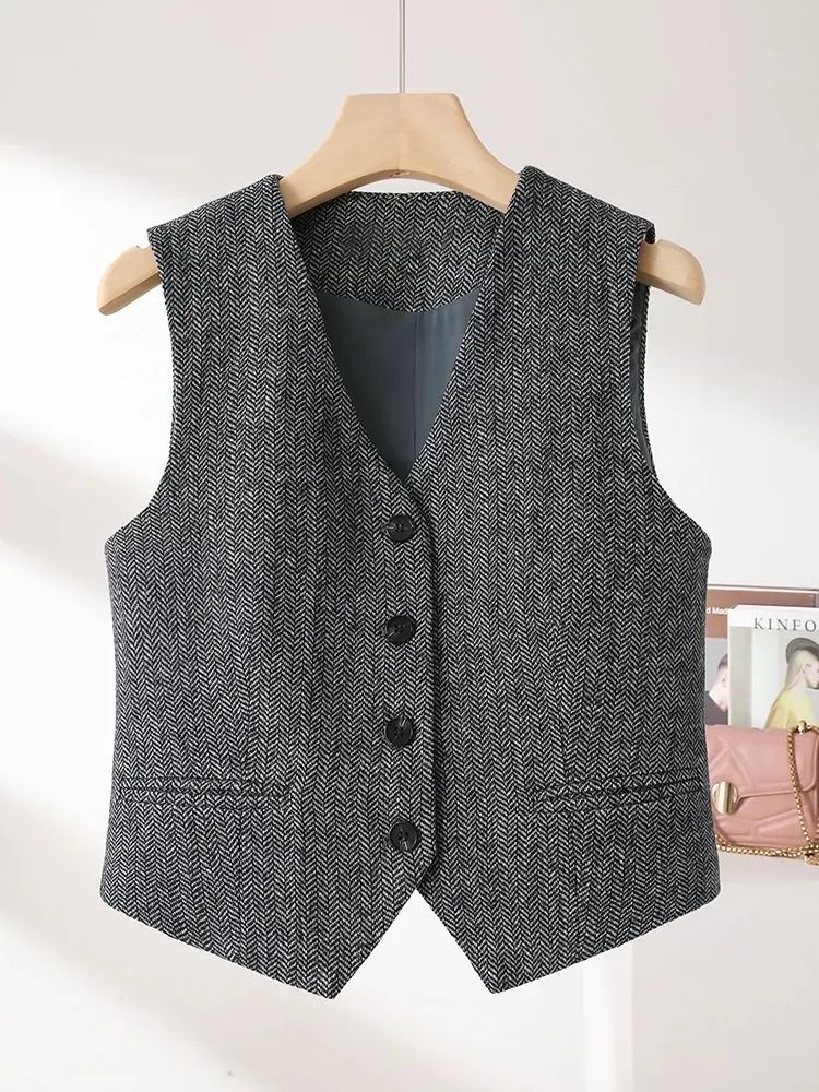 9366 새로운 봄, 가을 레이어링 영국 올드 머니 스타일 헤링본 모직 조끼 여성 가을, 겨울 민소매 심플 자켓