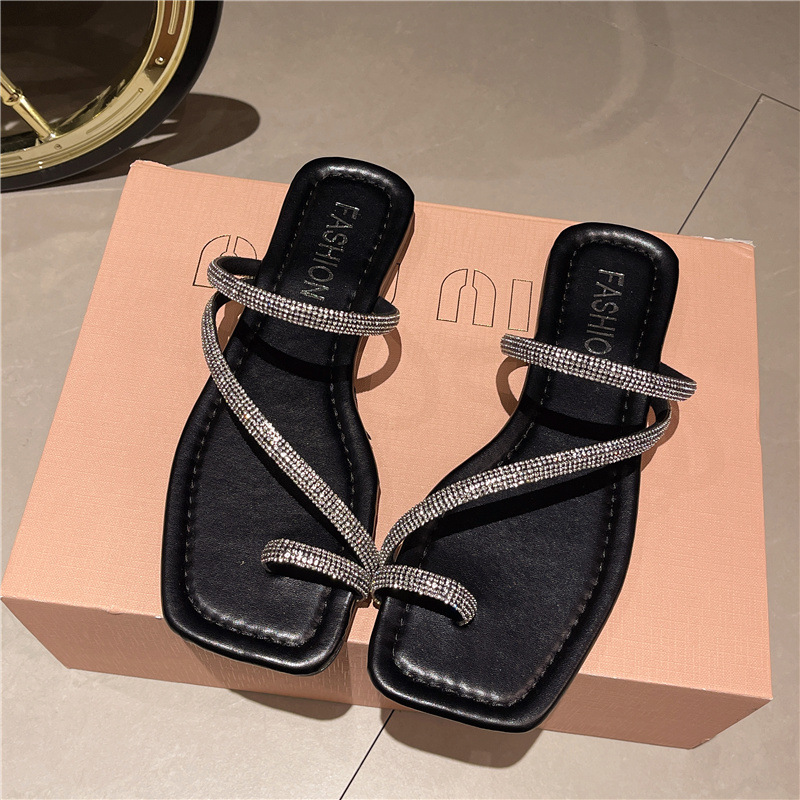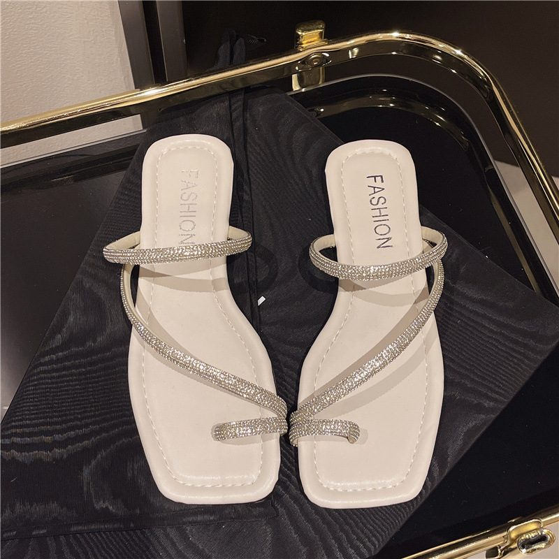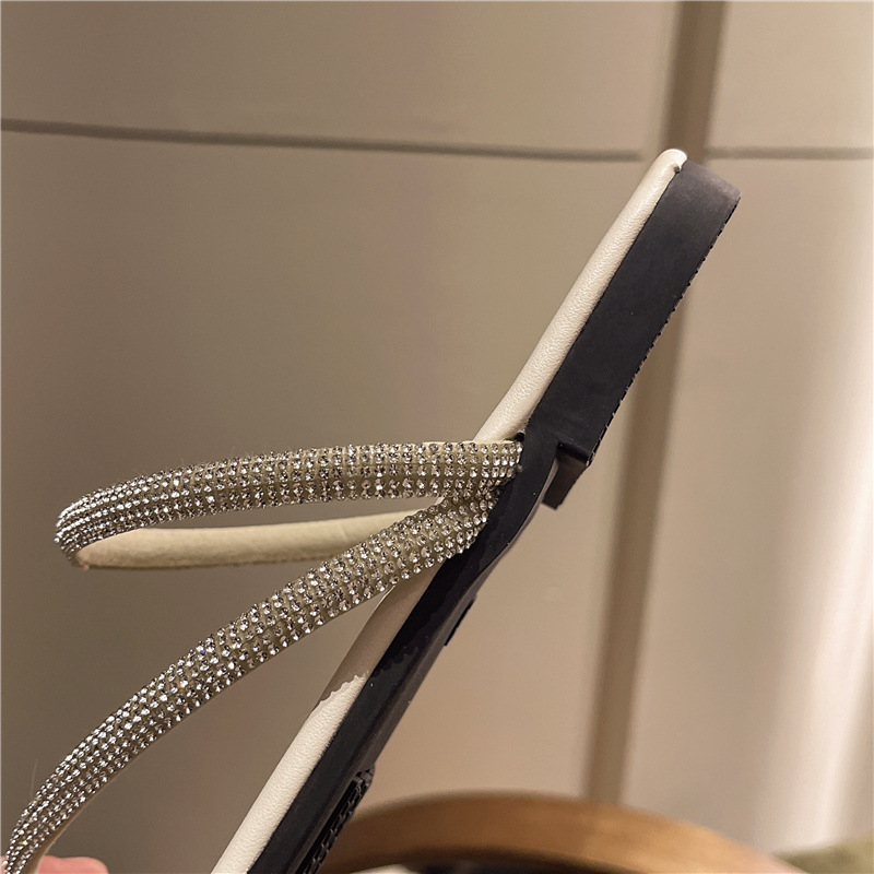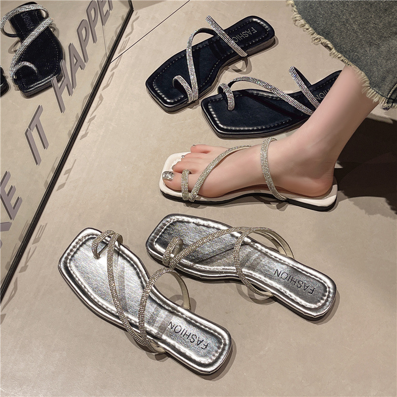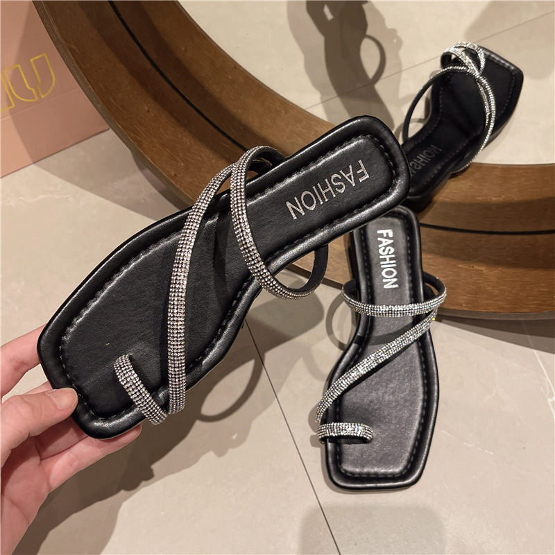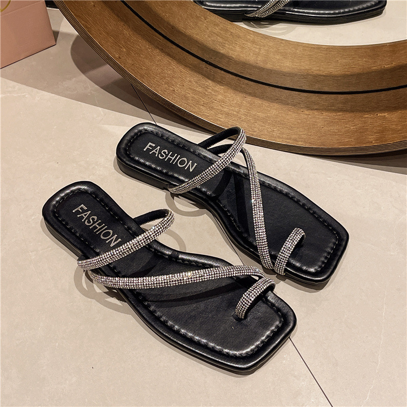 여름 아우터로 착용할 여성용 요정 스타일 라인스톤 샌들, 패셔너블한 슬립온 플랫 밑창, 휴가용 비치 샌들, 아름다운 샌들스토어 가기
