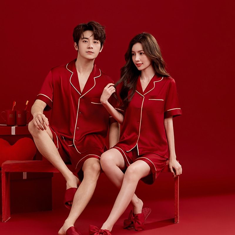 잠옷 웨딩 커플 하이 엔드 웨딩 여름 반팔 아이스 실크 레드 축제 한 남자와 한 여자 동반 세트