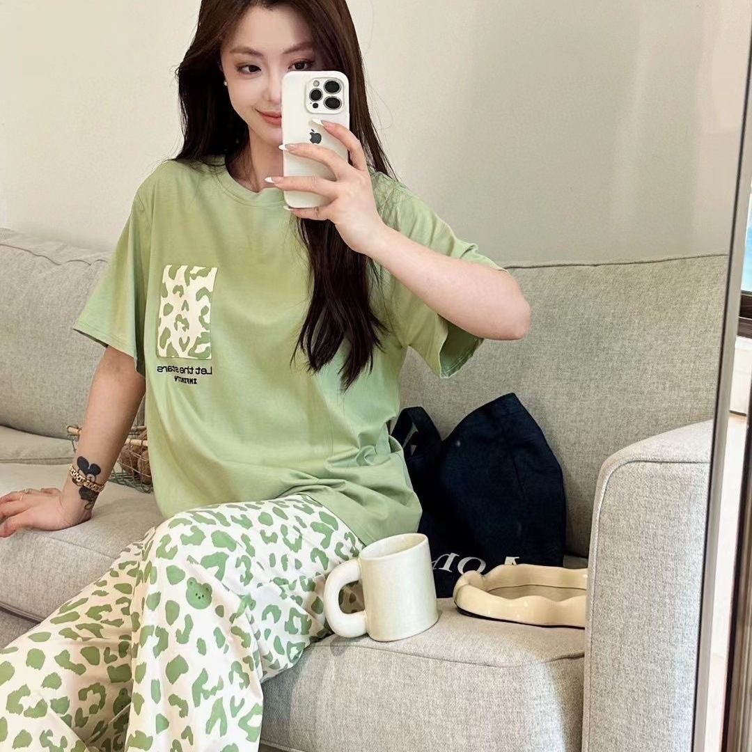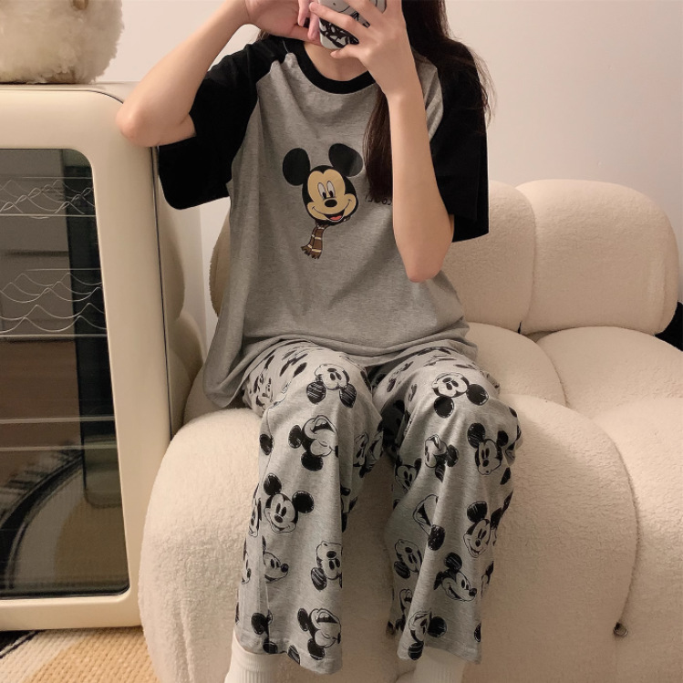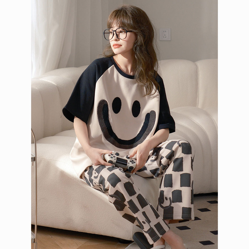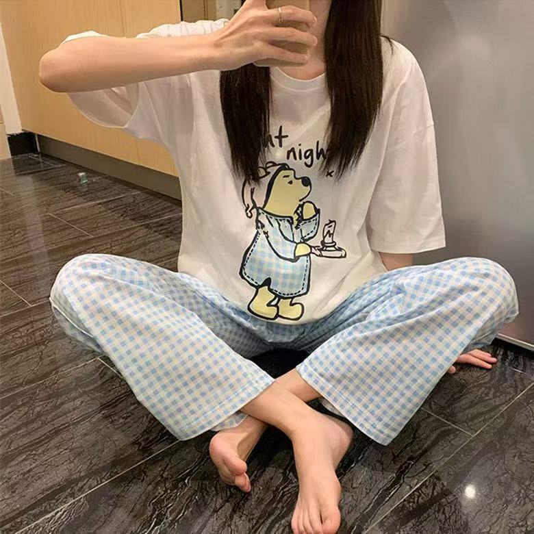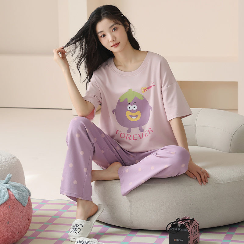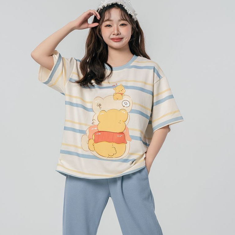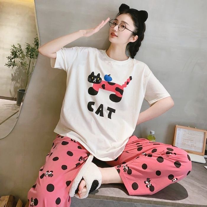 국경 간 대외 무역 봄과 가을 파자마 여성 반팔 바지 둥근 목 만화 느슨한 외부 착용 아카데미 스타일 홈 의류 여성 세트스토어 가기
