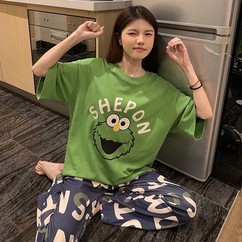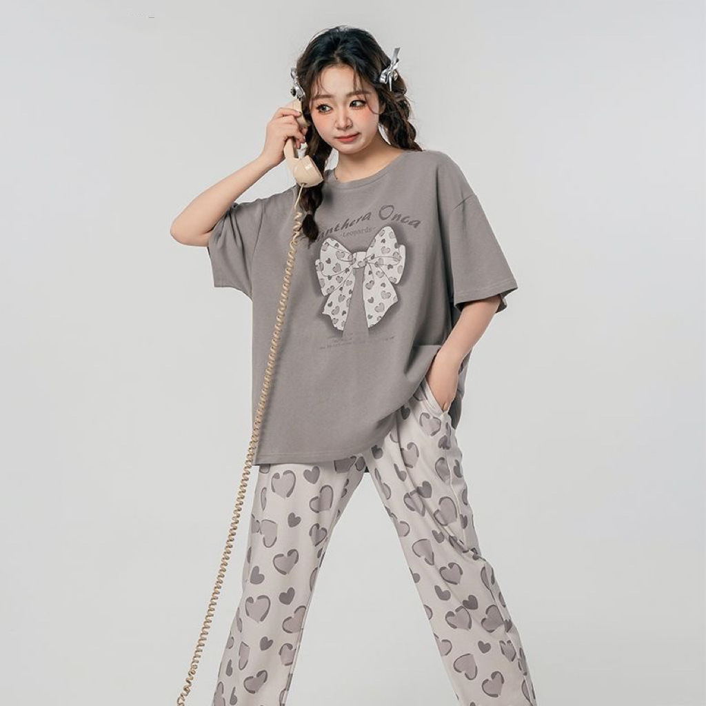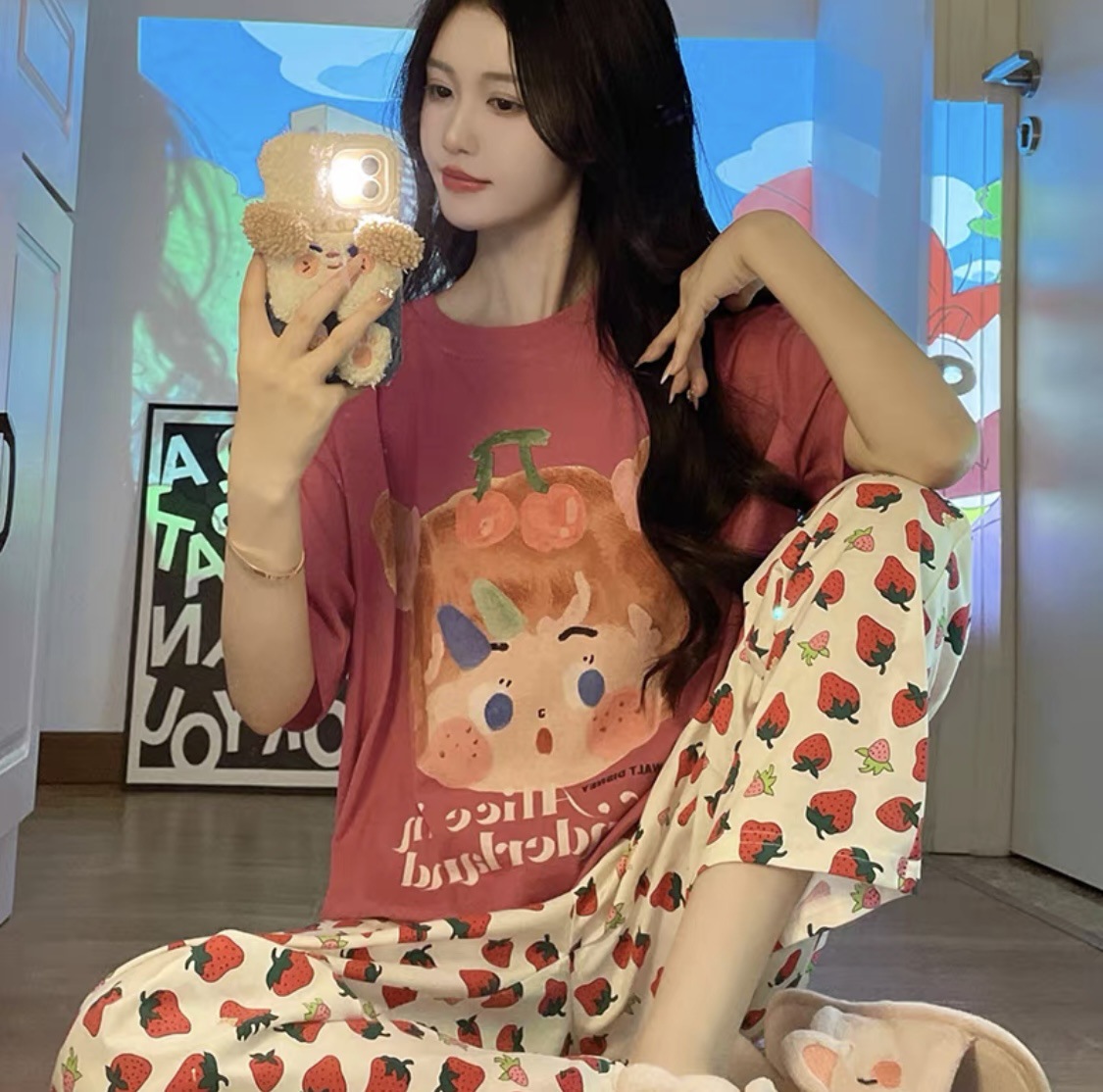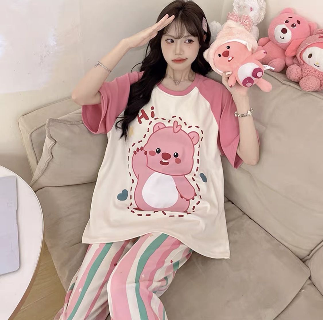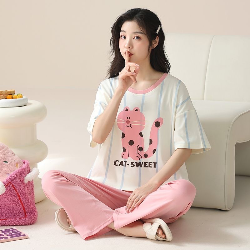 국경 간 대외 무역 봄과 가을 파자마 여성 반팔 바지 둥근 목 만화 느슨한 외부 착용 아카데미 스타일 홈 의류 여성 세트스토어 가기
