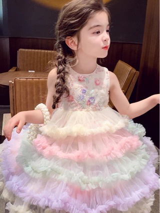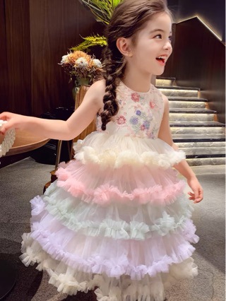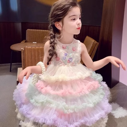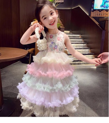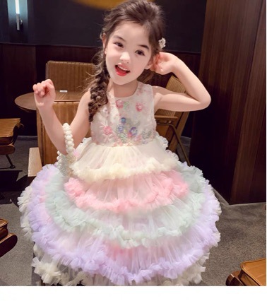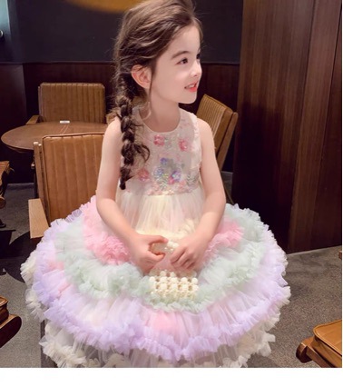2025 공주 원피스 소녀 여름 새로운 민소매 무지개 푹신한 원피스 중간 길이의 여성 보물스토어 가기