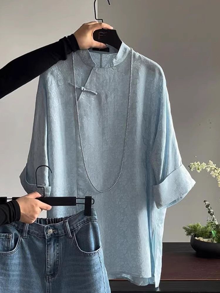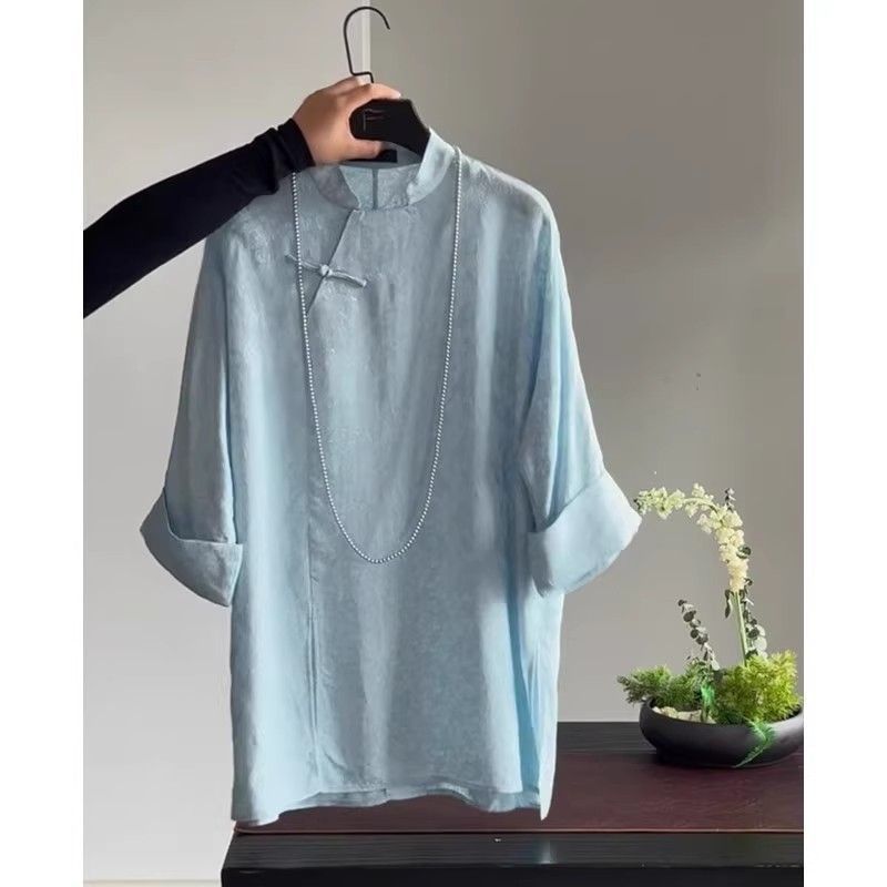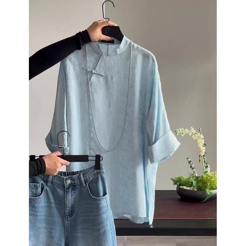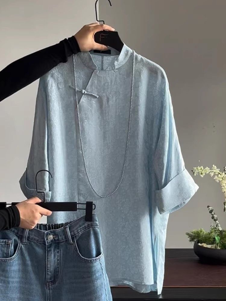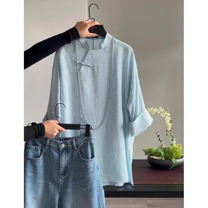 가벼운 Guofeng 수정 매우 간단한 중국 블루 탑 2025 여름 칼라 부분 플랩 버튼 여성용 셔츠 인쇄