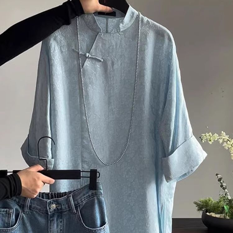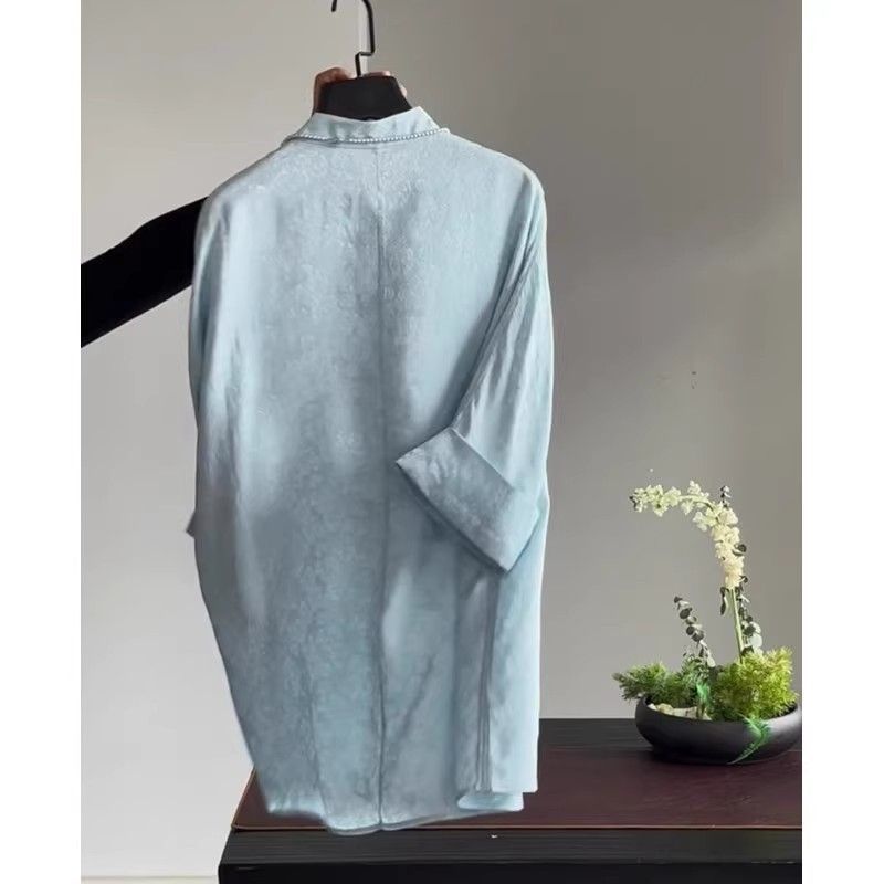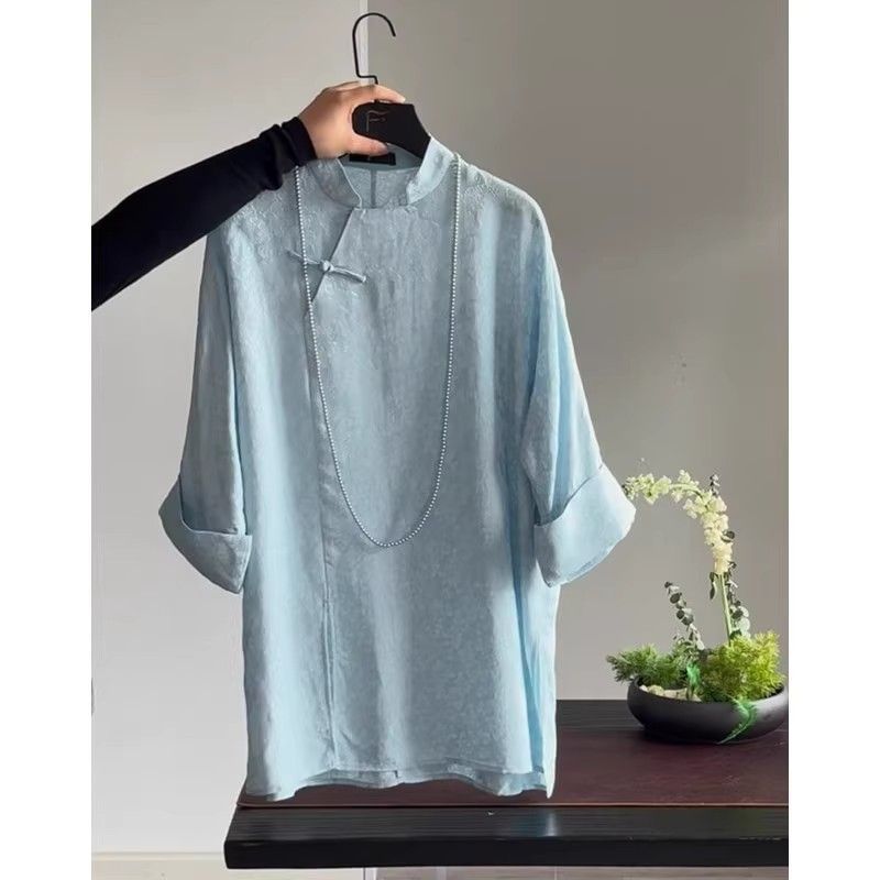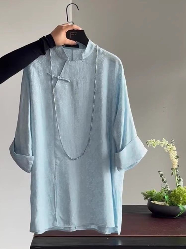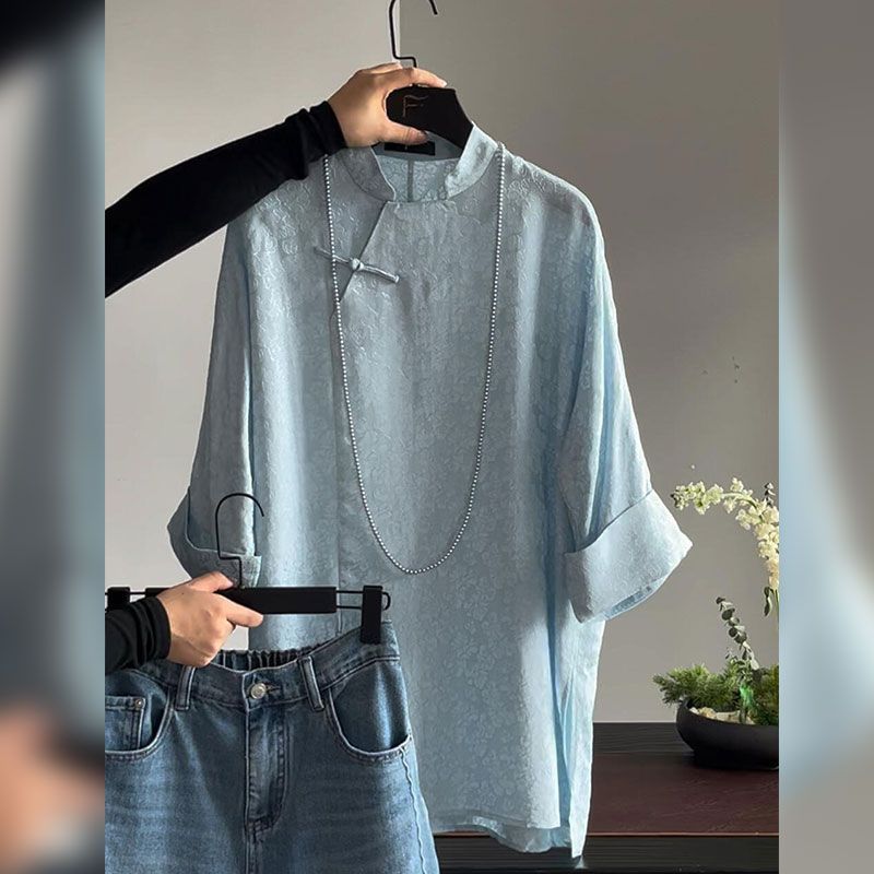 가벼운 Guofeng 수정 매우 간단한 중국 블루 탑 2025 여름 칼라 부분 플랩 버튼 여성용 셔츠 인쇄