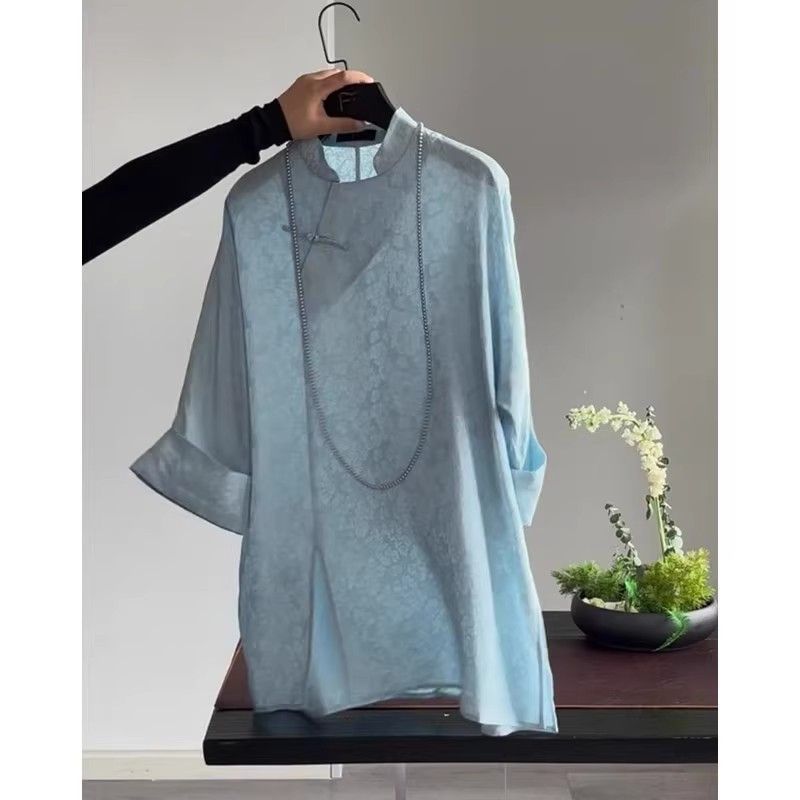 가벼운 Guofeng 수정 매우 간단한 중국 블루 탑 2025 여름 칼라 부분 플랩 버튼 여성용 셔츠 인쇄스토어 가기