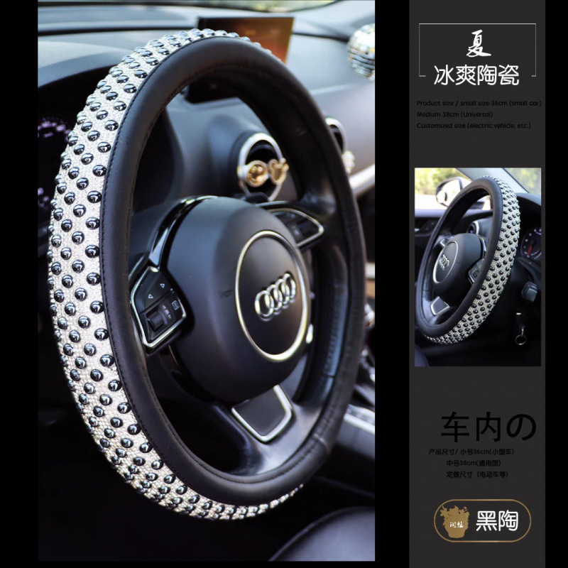 여름 고급스러운 스티어링 휠 커버, 럭셔리 여신 인터넷 연예인 세라믹 비즈, 여름 얼음처럼 시원하고 미끄럼 방지 및 땀 흡수 자동차 핸들