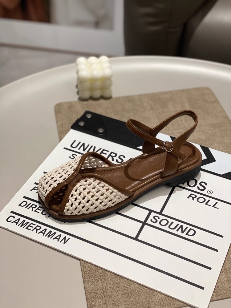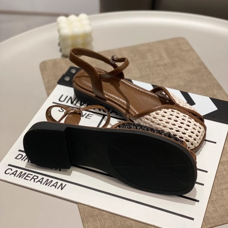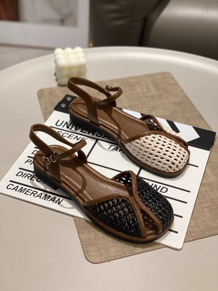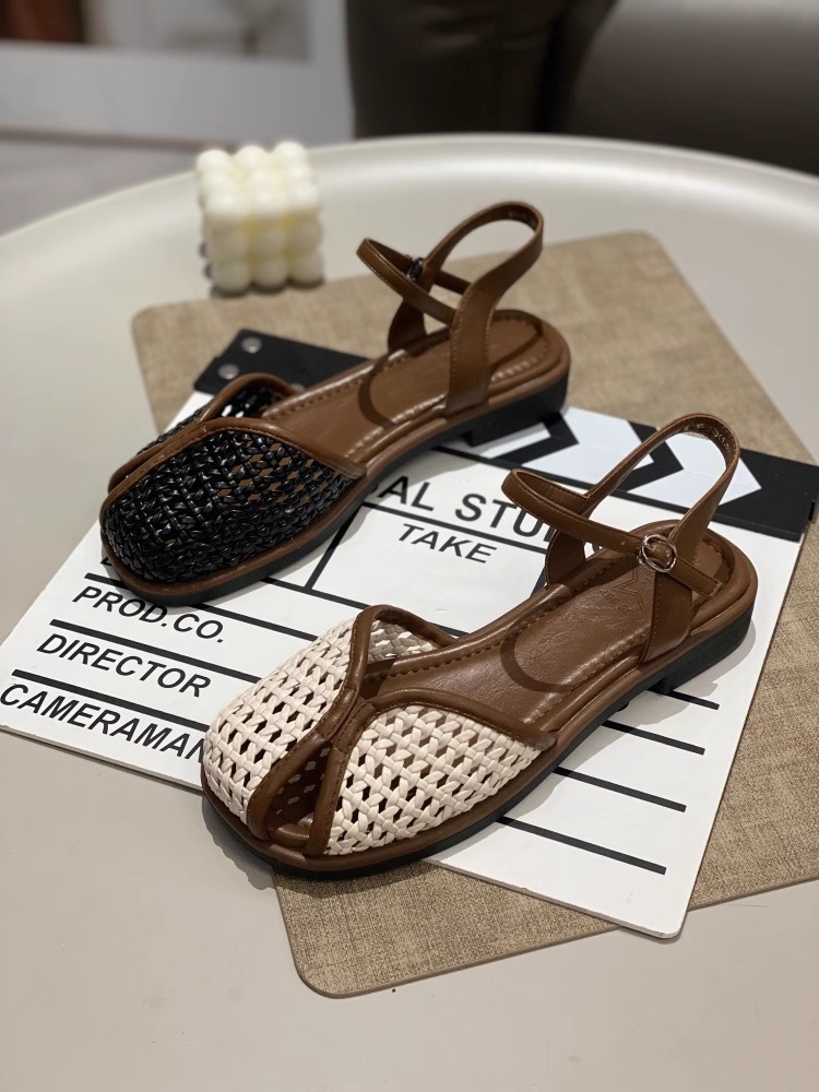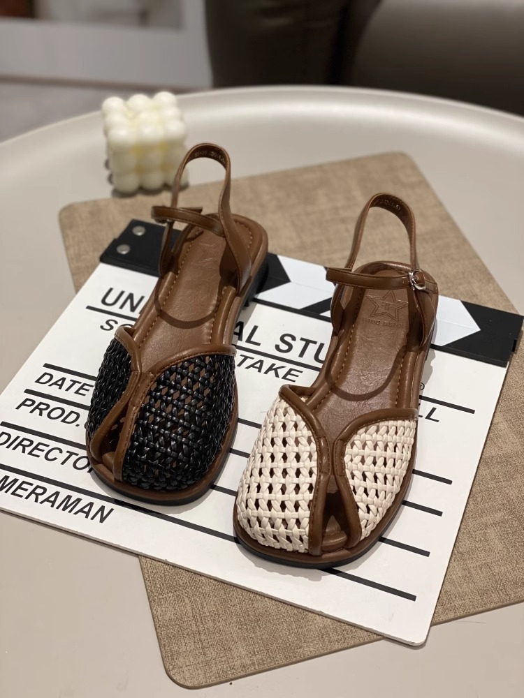 양가죽 짠 할로우 아웃 유행 발가락 플랫 여성 아우터웨어 2025 여름 새 라운드 발가락 프렌치 샌들스토어 가기