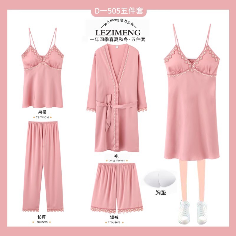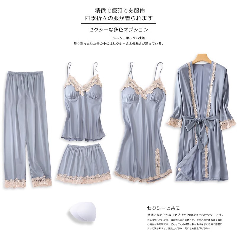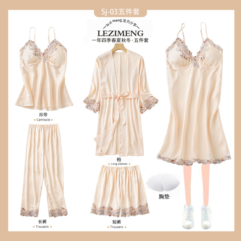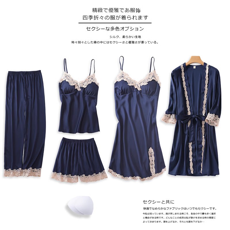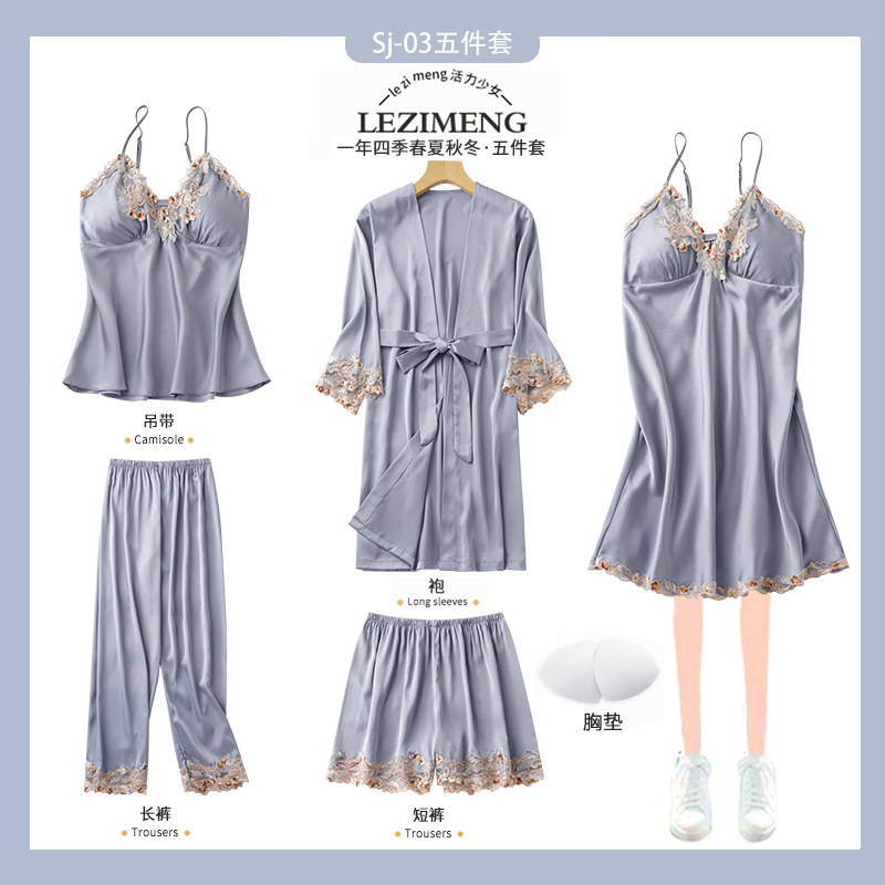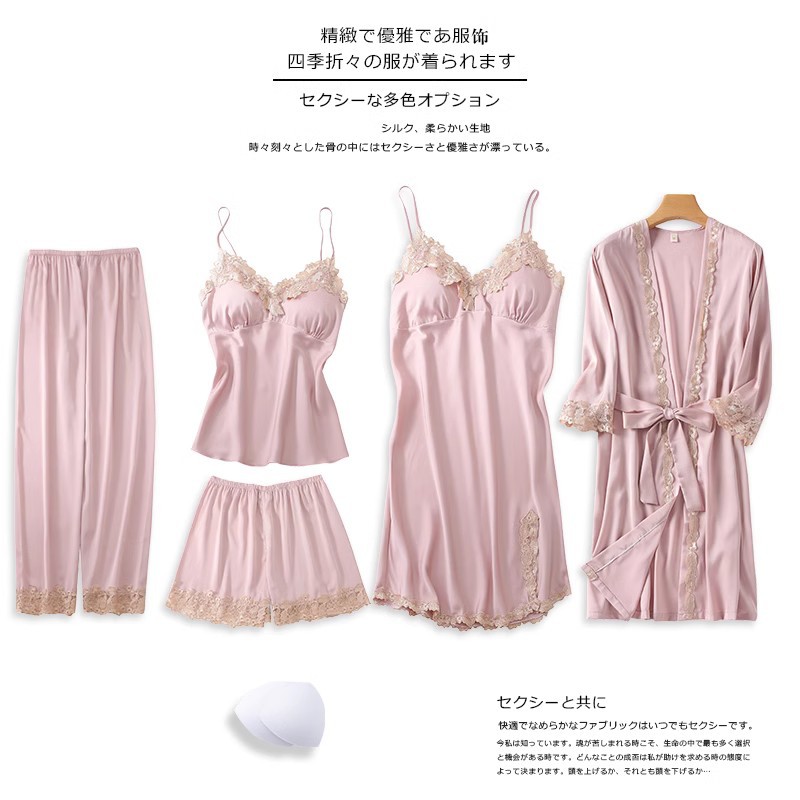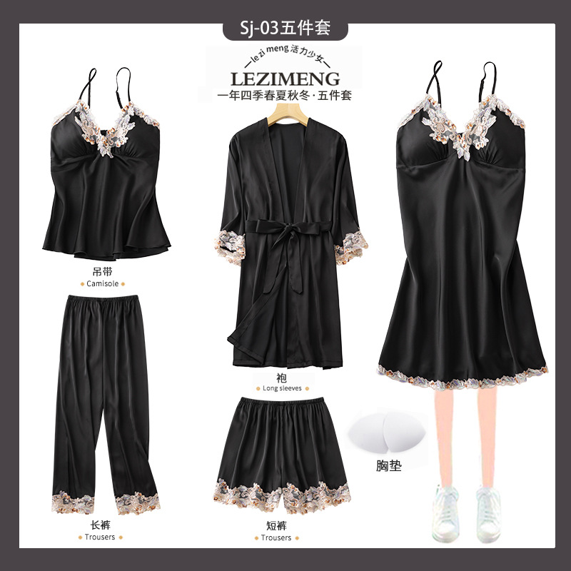 여성용 잠옷 봄, 가을 여름 얼음 실크 섹시한 5 피스 세트 가슴 패드가있는 고급 실크 홈웨어 세트스토어 가기