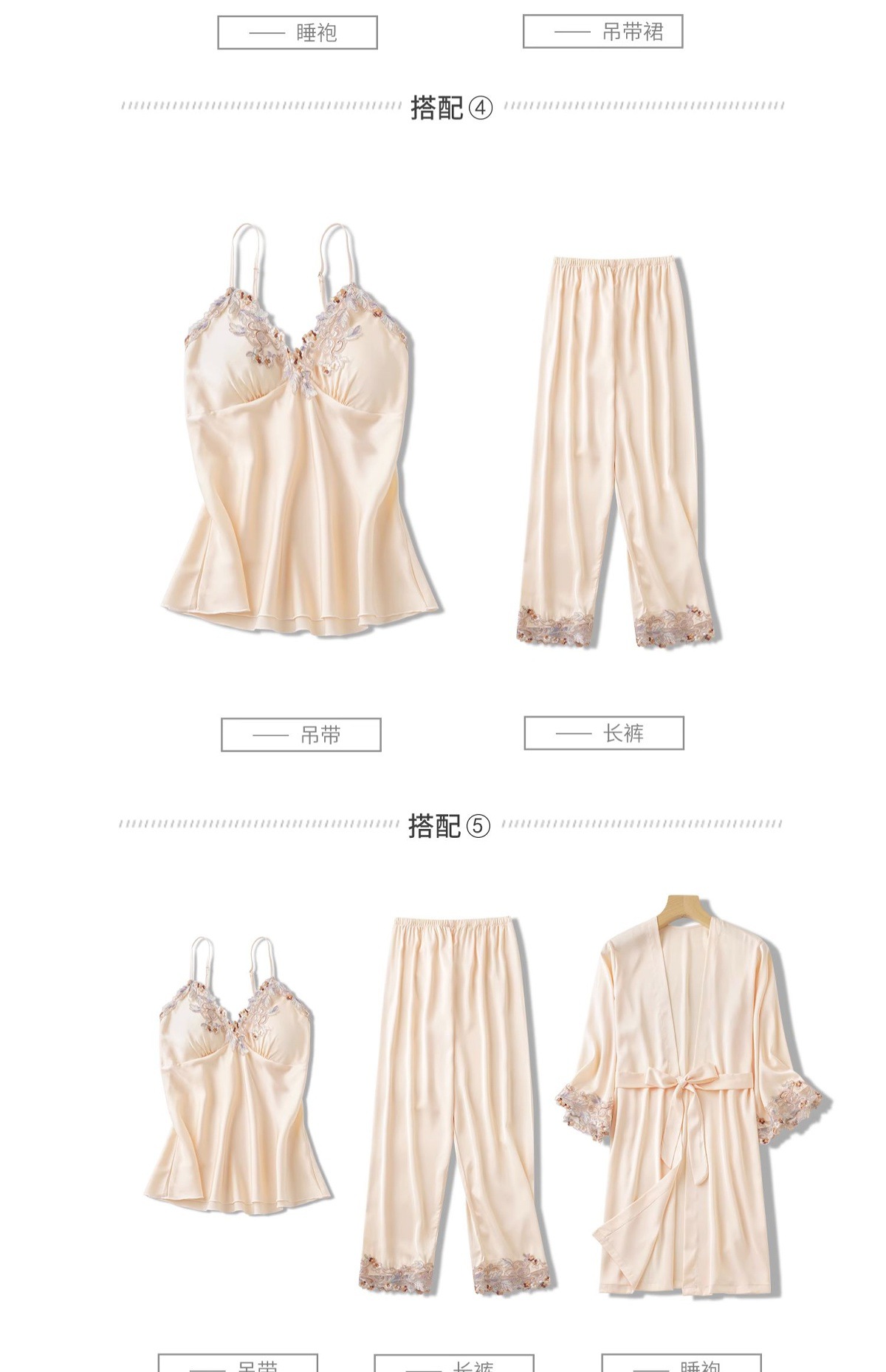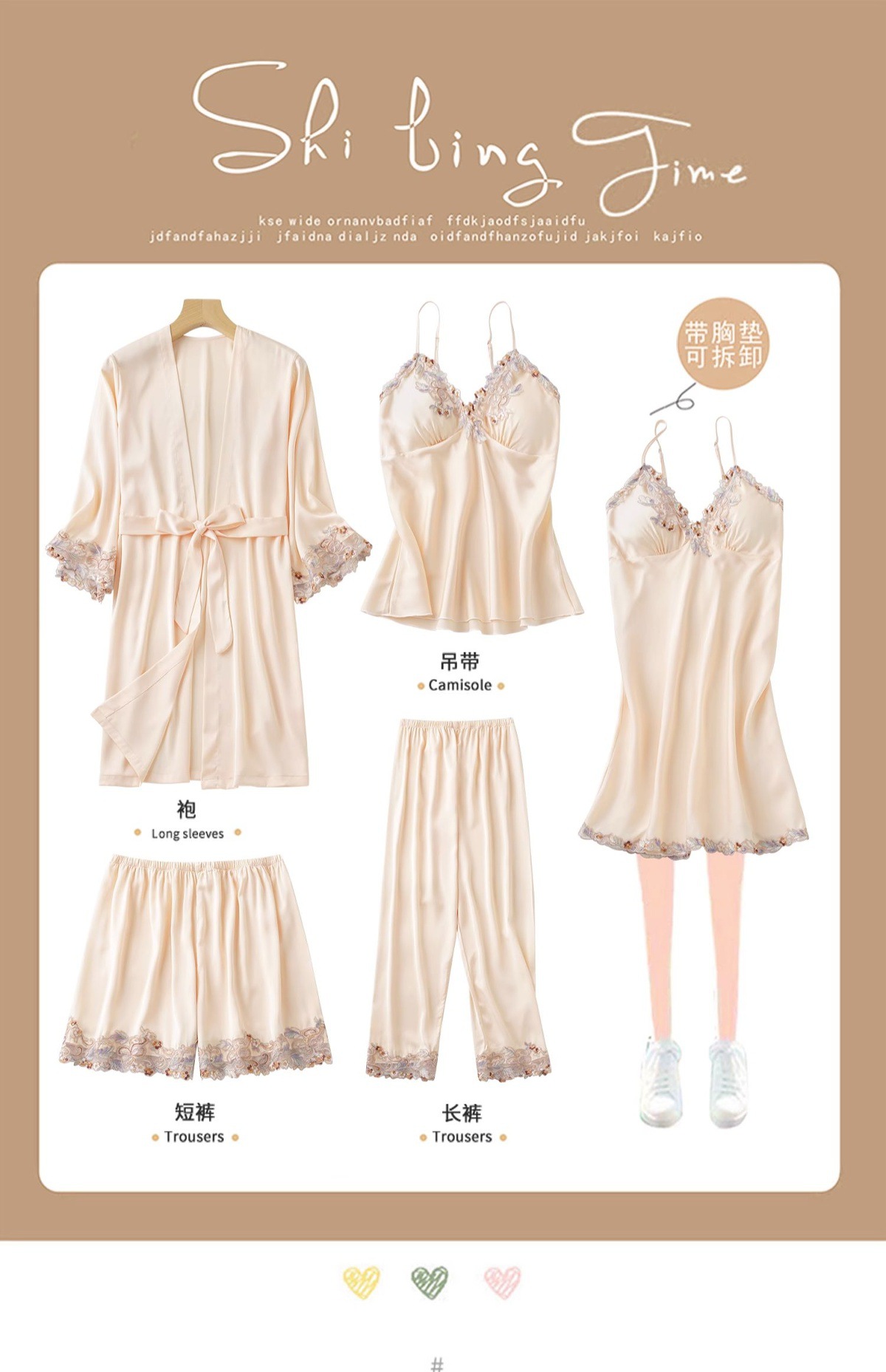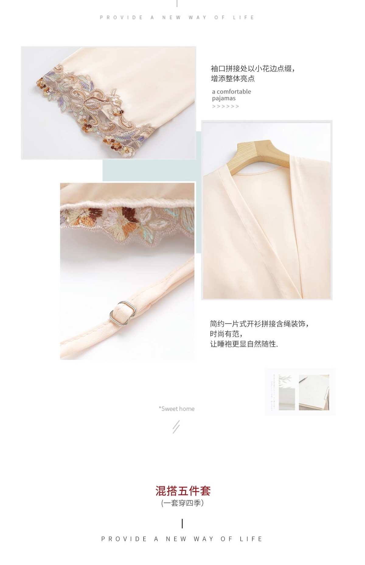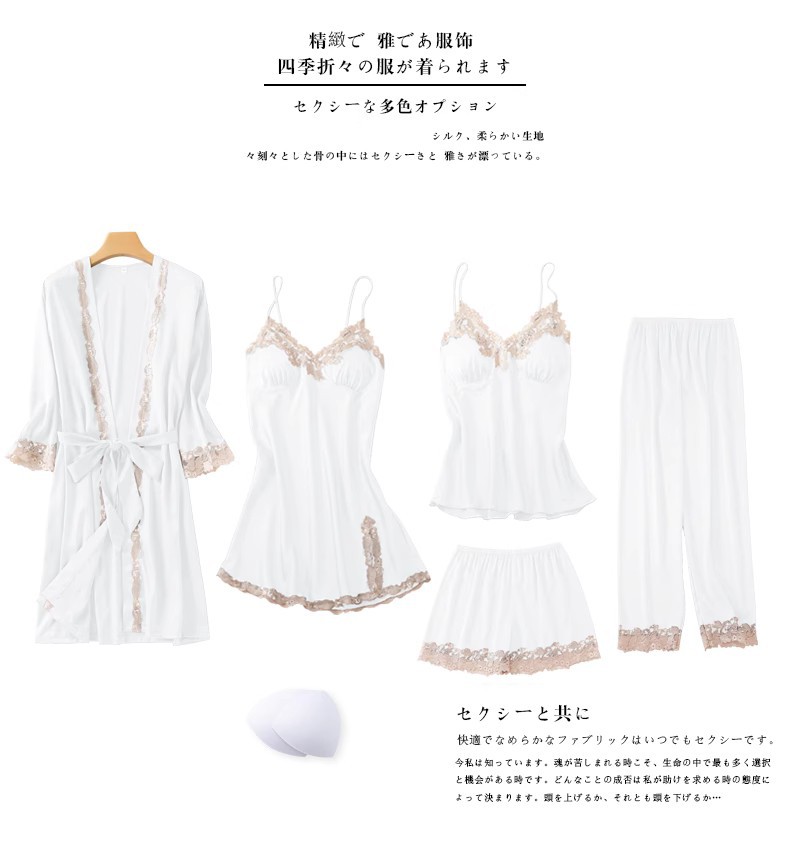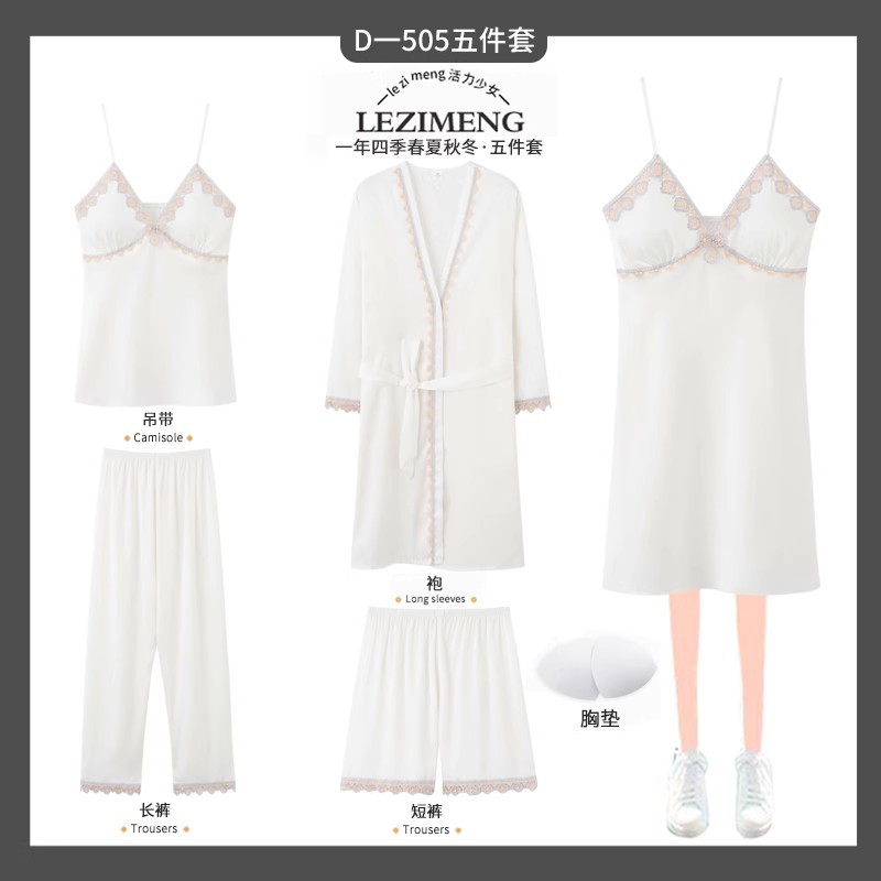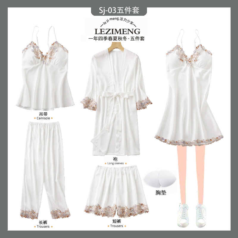 여성용 잠옷 봄, 가을 여름 얼음 실크 섹시한 5 피스 세트 가슴 패드가있는 고급 실크 홈웨어 세트스토어 가기