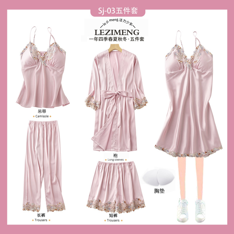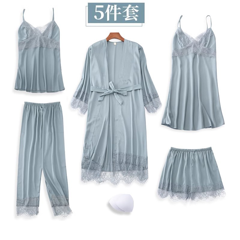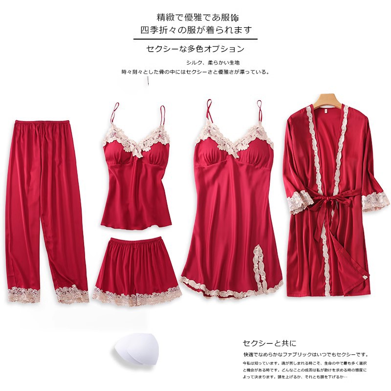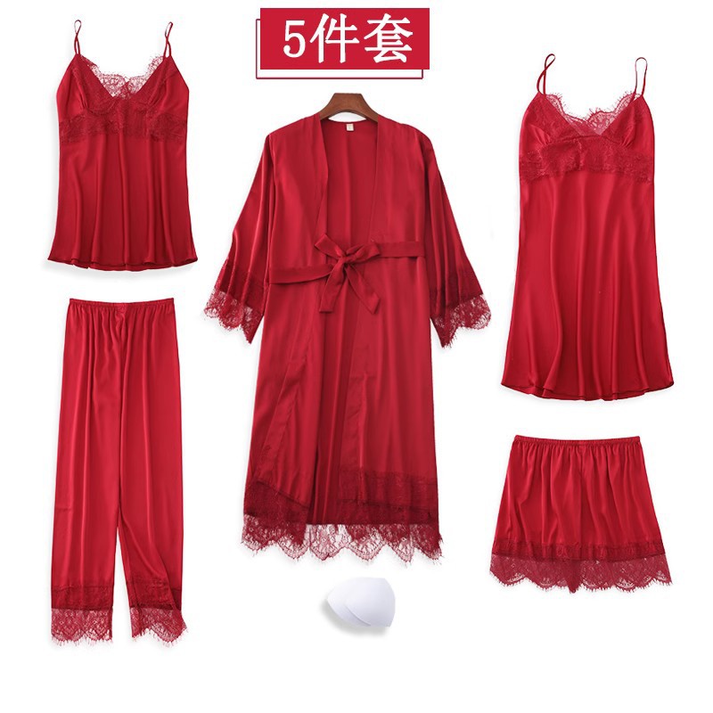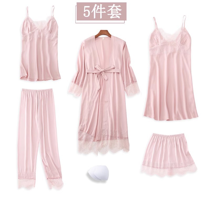 여성용 잠옷 봄, 가을 여름 얼음 실크 섹시한 5 피스 세트 가슴 패드가있는 고급 실크 홈웨어 세트