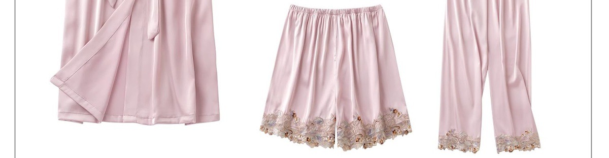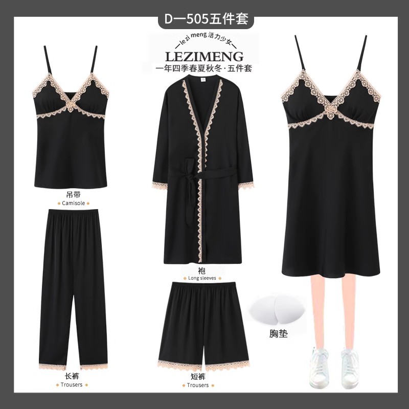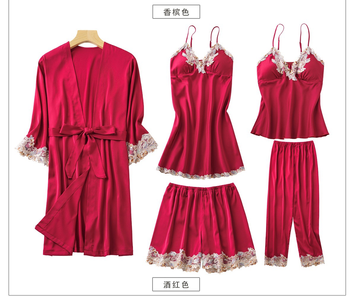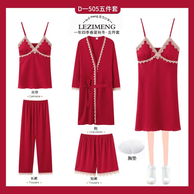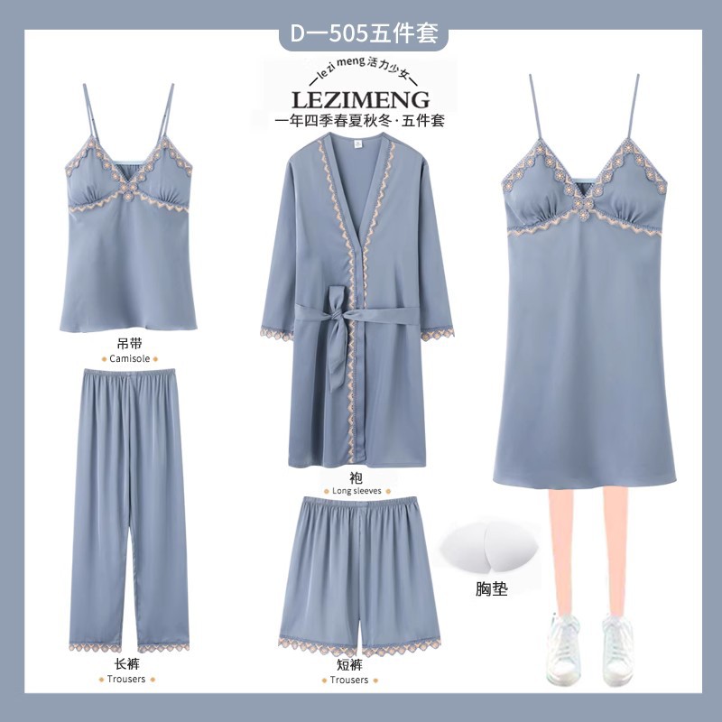여성용 잠옷 봄, 가을 여름 얼음 실크 섹시한 5 피스 세트 가슴 패드가있는 고급 실크 홈웨어 세트