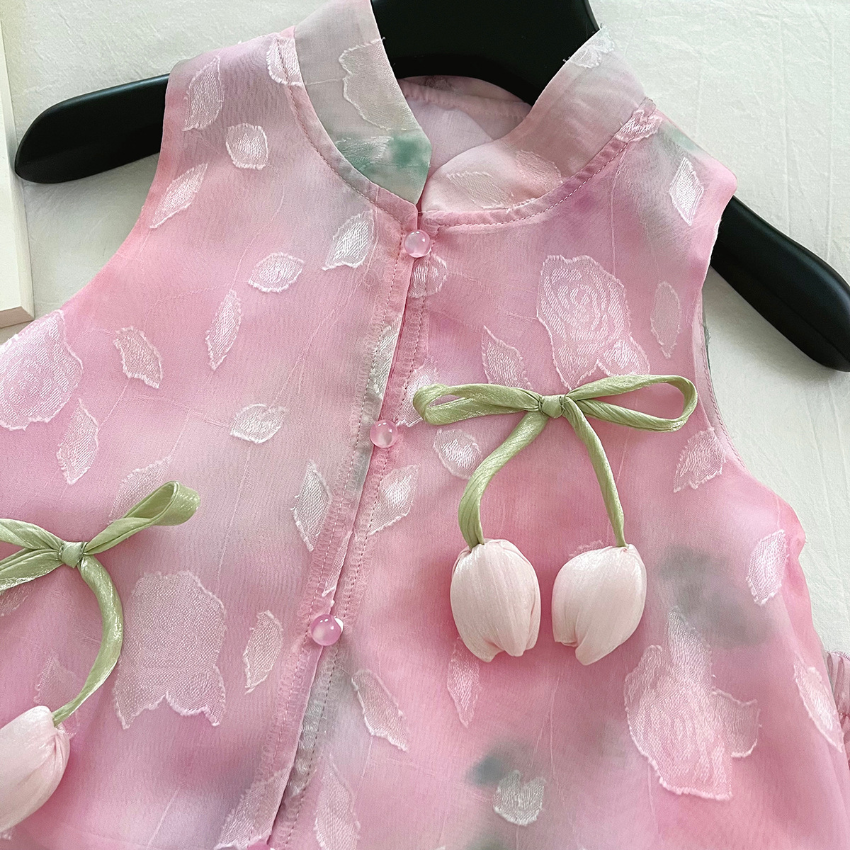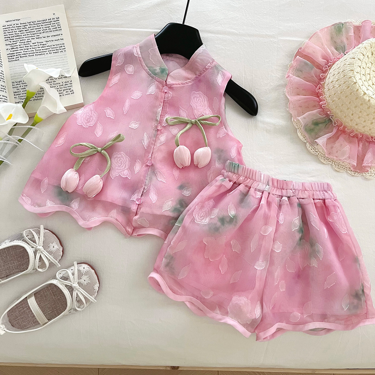 여자 여름 버클 민소매 세트 2025 새로운 여름 얇은 아기의 두 조각 유행 루프 반바지스토어 가기