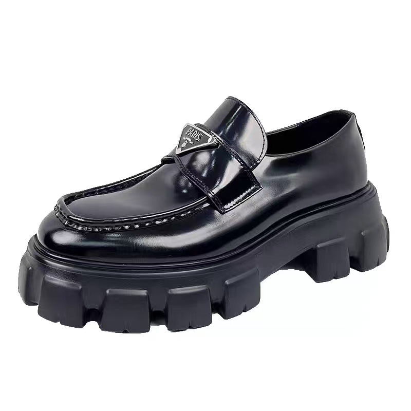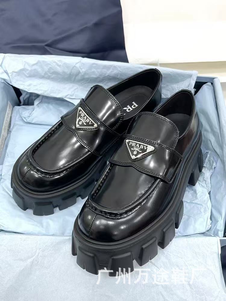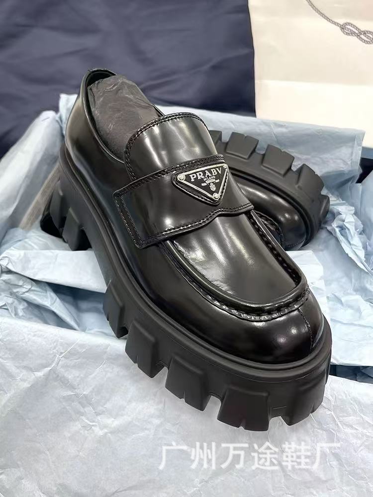 2024년 신상 여성용 로퍼, 천연 가죽 라운드 토 삼각 로고 플랫폼 슈즈, 슬립온 가죽 신발, 키높이 하이힐
