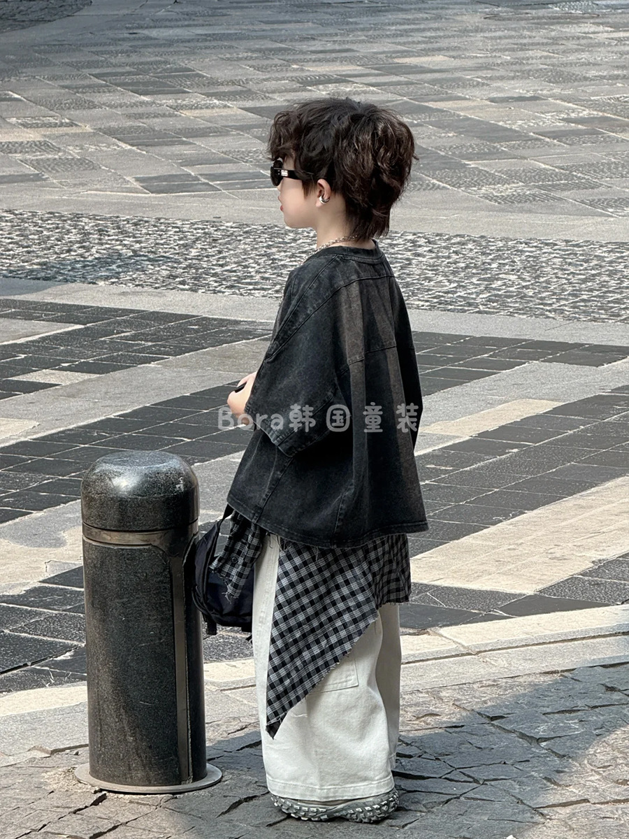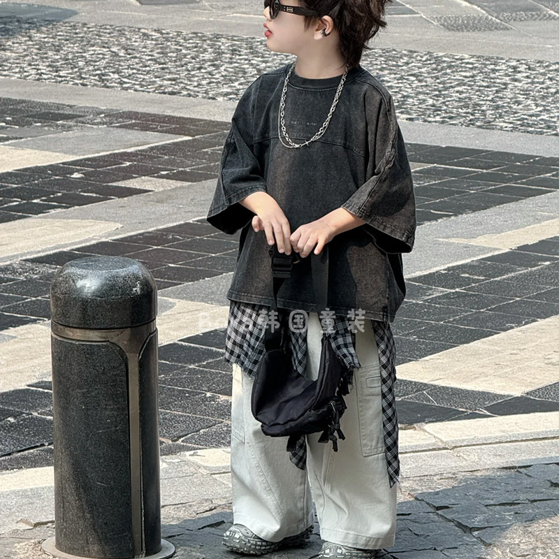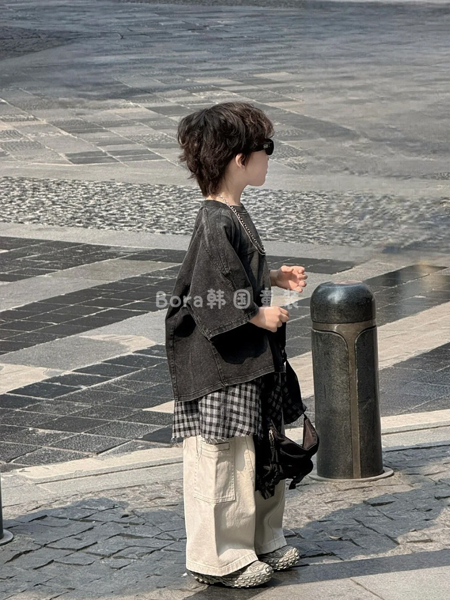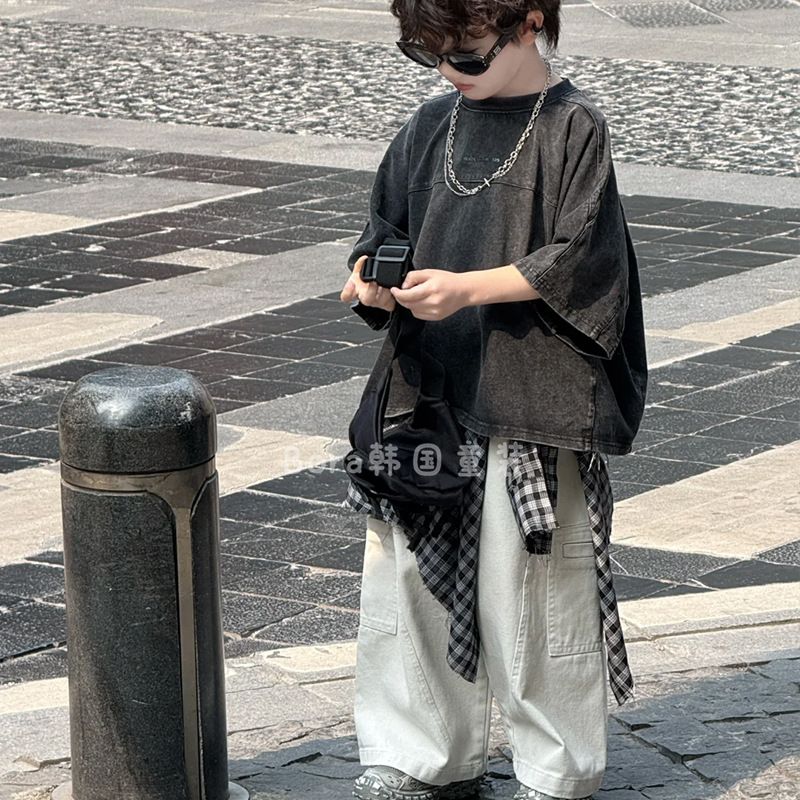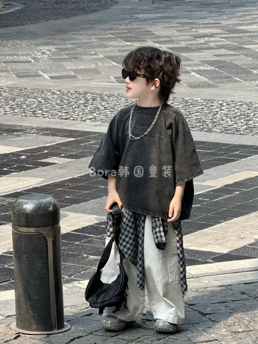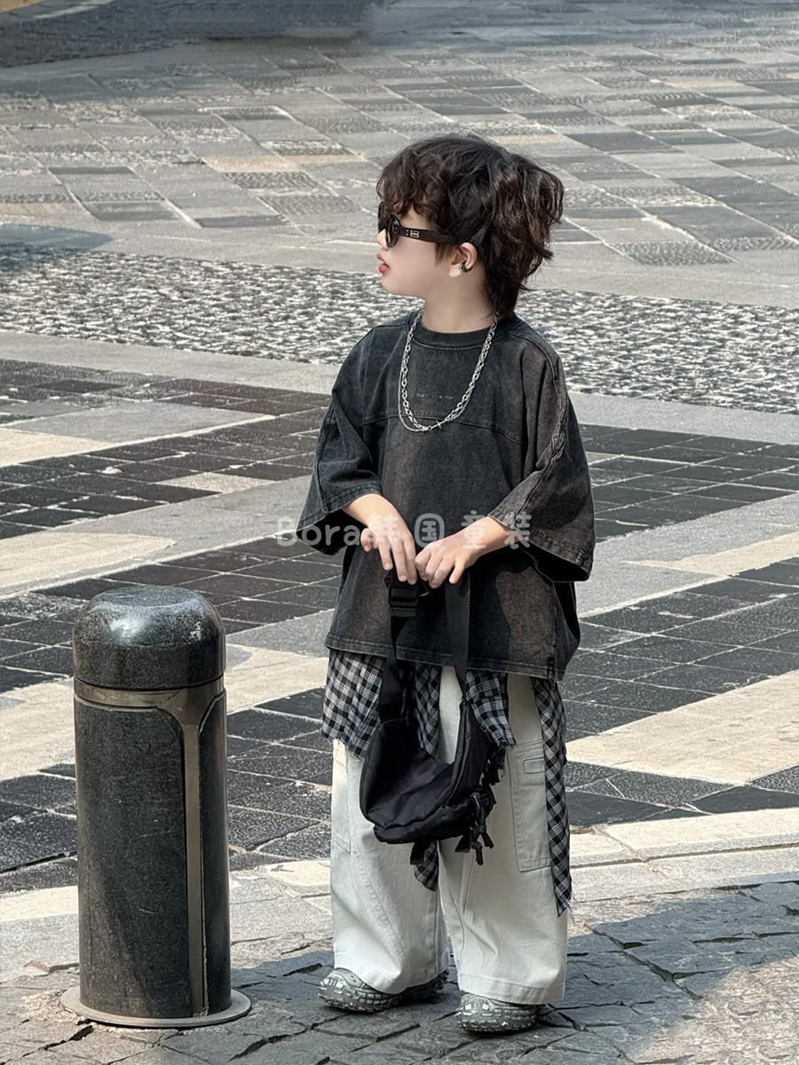 남학생 반팔 티셔츠 어린이 여름 2025 새로운 러피 잘 생긴 스타일 바닥 셔츠 여성 베이비 블랙 올드 슈퍼 쿨 트렌드 3스토어 가기