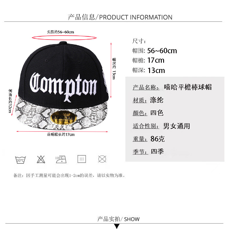 국경 간 인기 판매 유럽과 미국의 콤튼 야구 모자 한국어 버전 맞춤형 힙합 플랫 챙 위장 모자 공장 스팟 배치스토어 가기