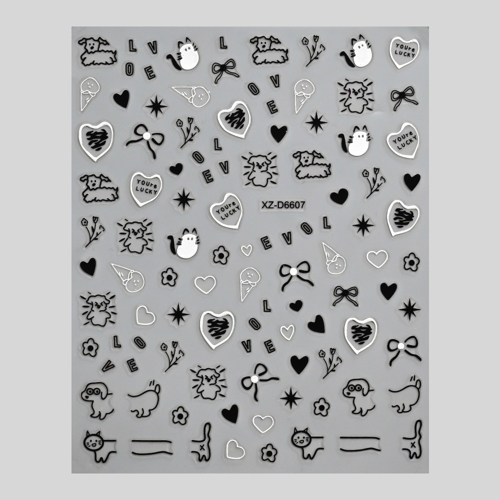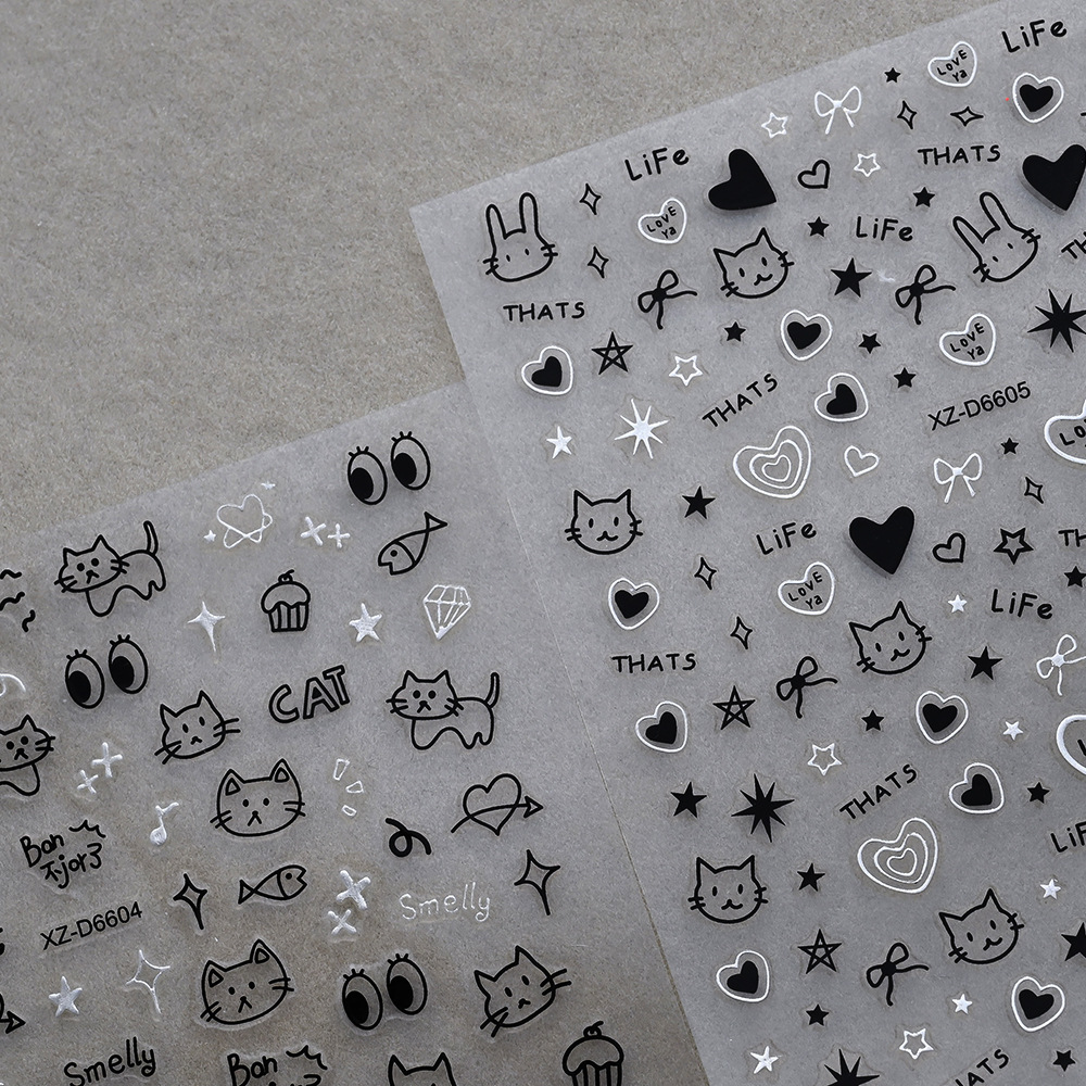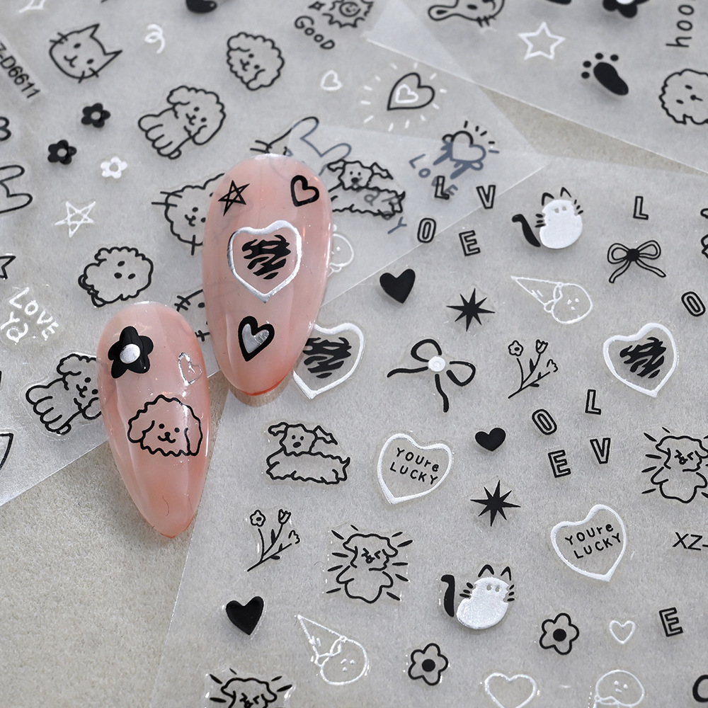 새로운 만화 애완 동물 네일 아트 스티커 블랙 라인 강아지 고양이 귀여운 네일 스티커 접착 자기 접착 네일 아트 스티커