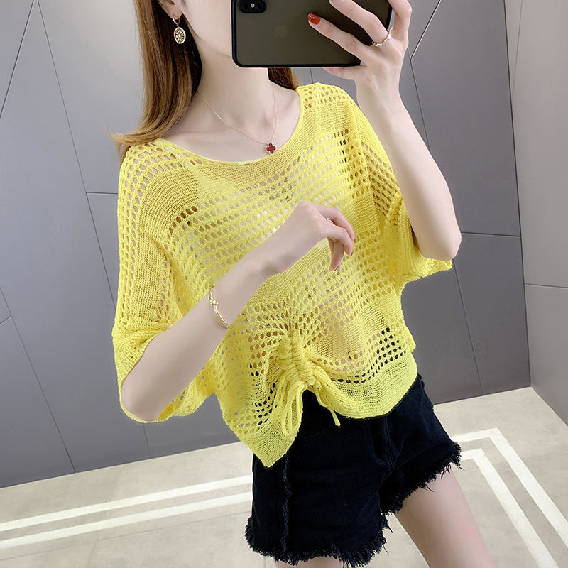 여성용 티셔츠 짧은 끈 아이스 실크 탑 짧은 소매 여성의 얇은 여름 에어컨 셔츠