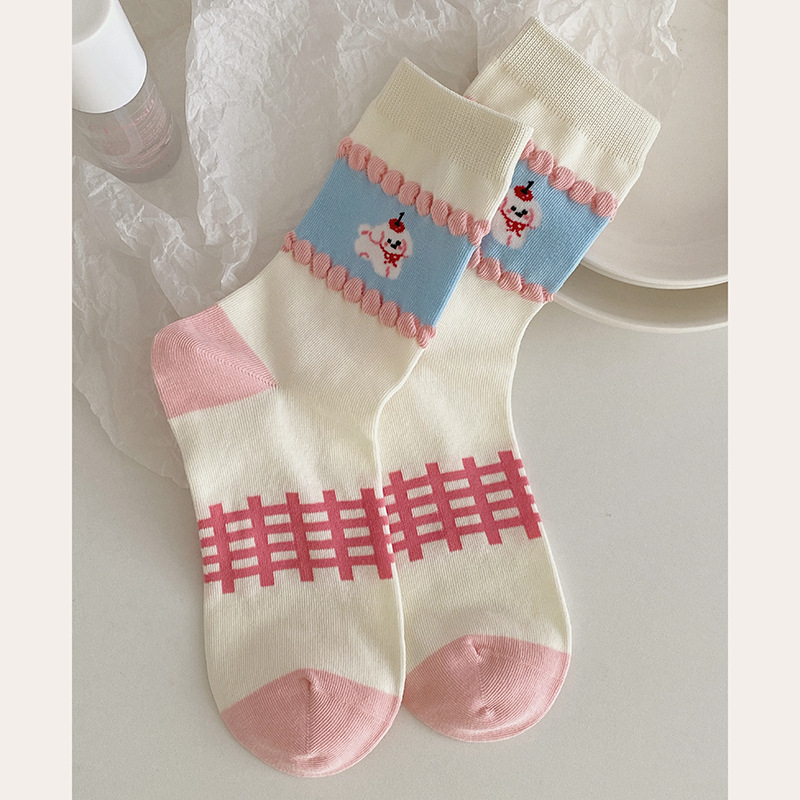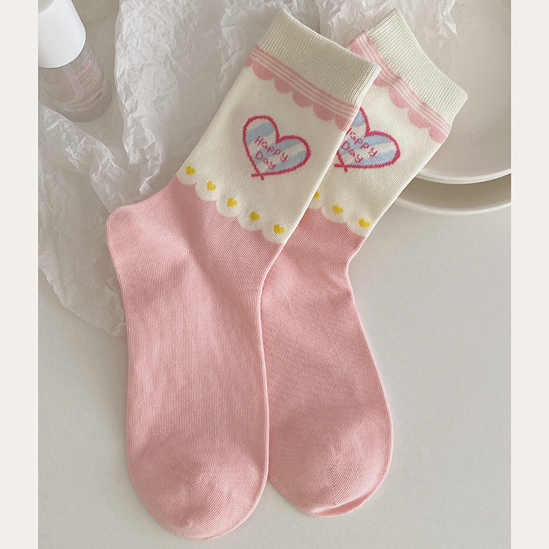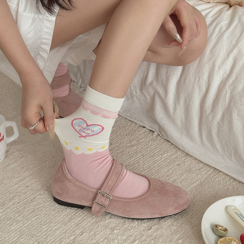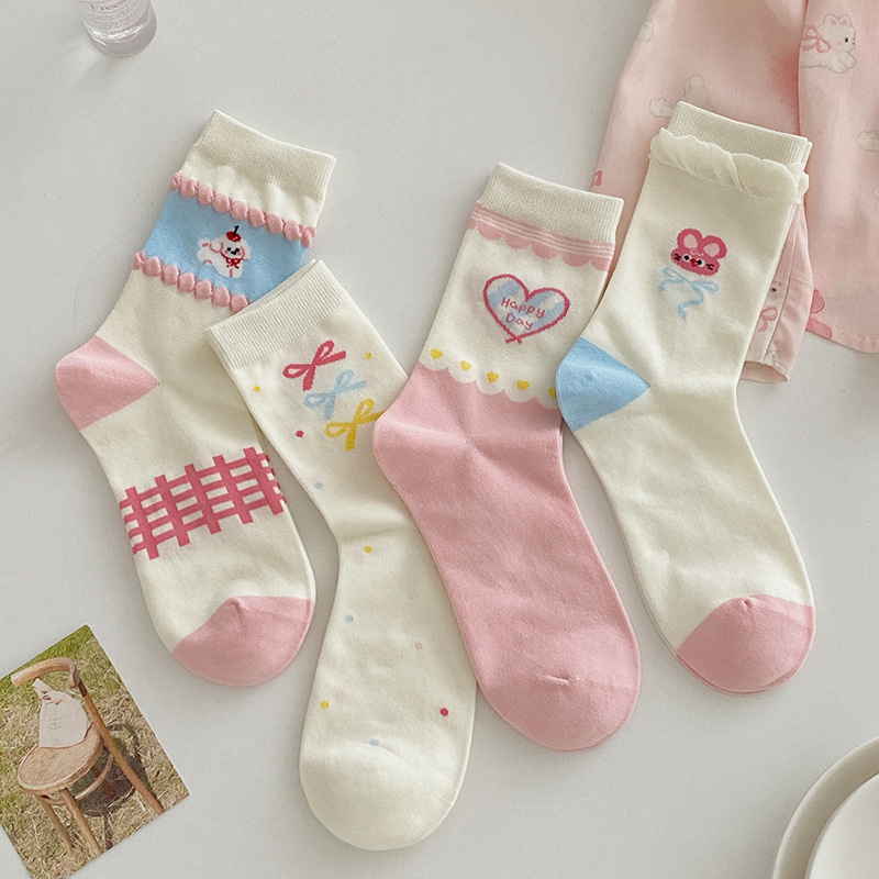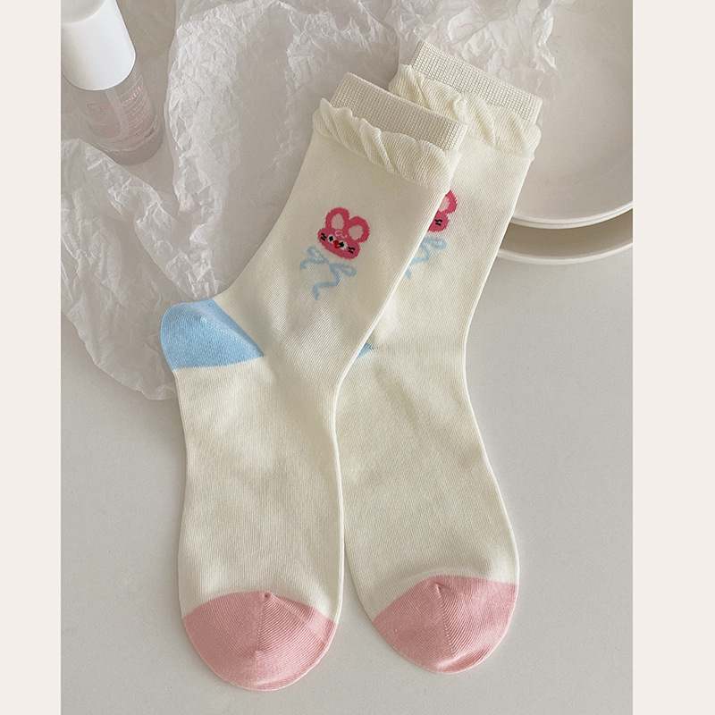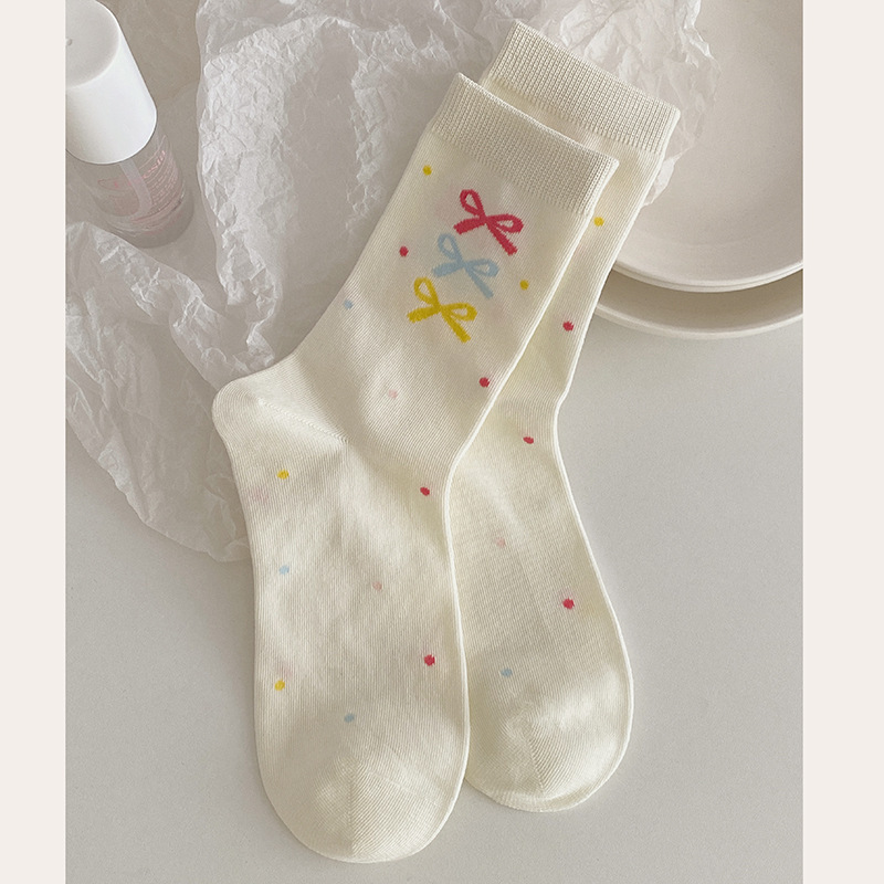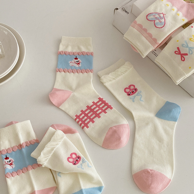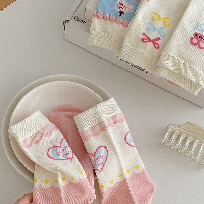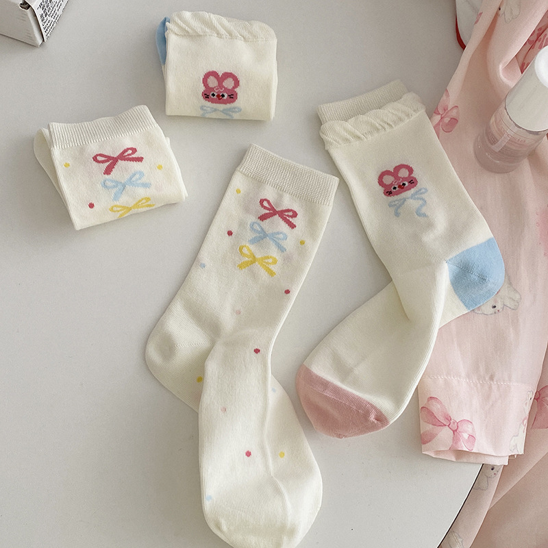 2025년 봄 신상 여성 양말 핑크색 강아지 리본 여성 중목 양말 소녀용 무봉제 레이스 양말 무봉제 헤드스토어 가기
