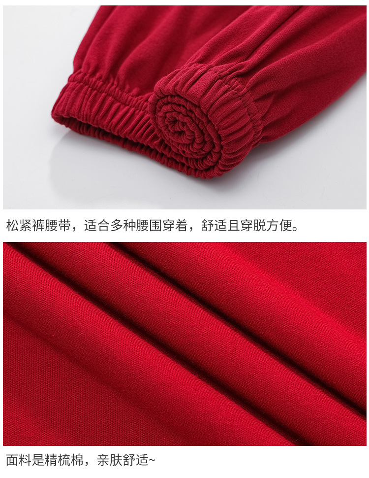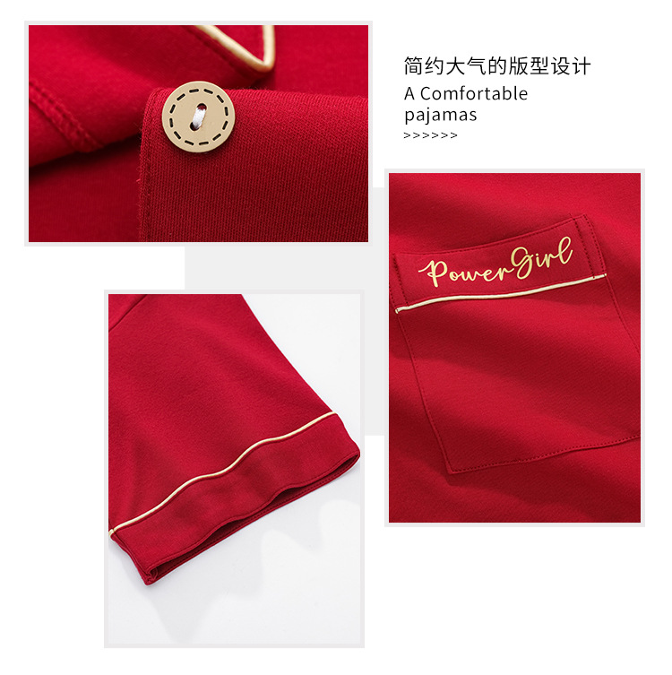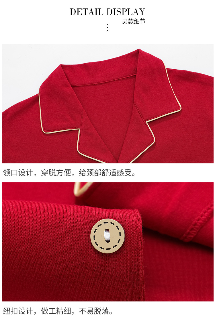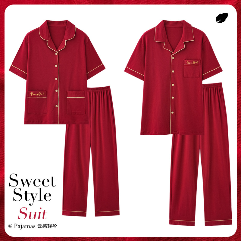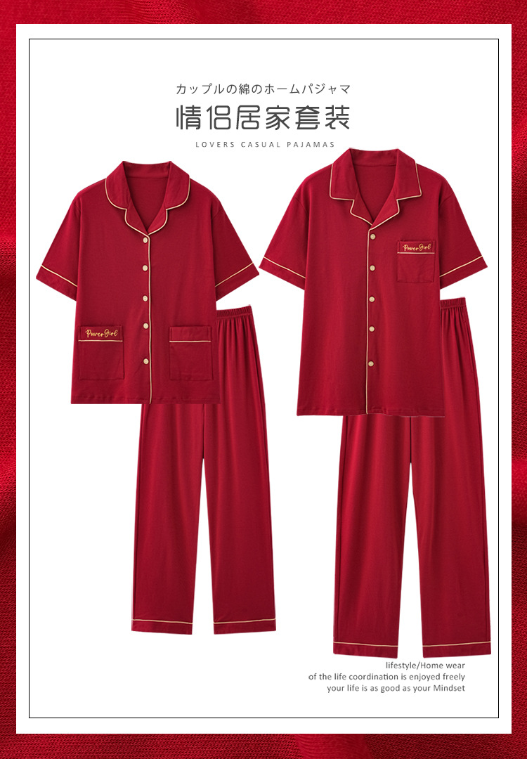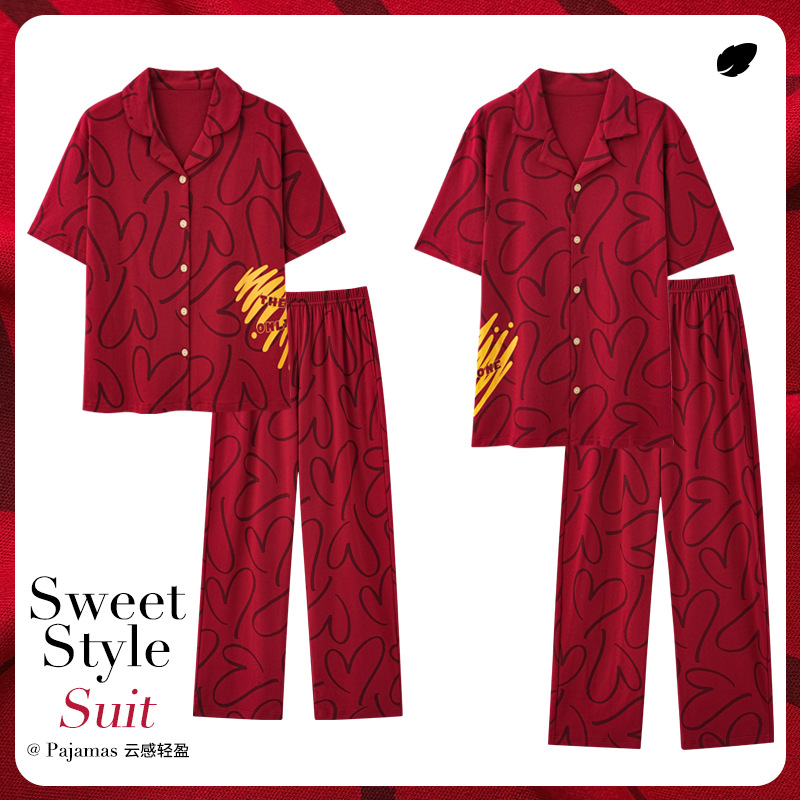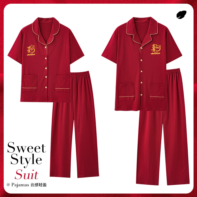 여름 새로운 빨간색 반팔 순수 코튼 커플 잠옷 바지 카디건 정장 결혼식 남성과 여성의 가정복