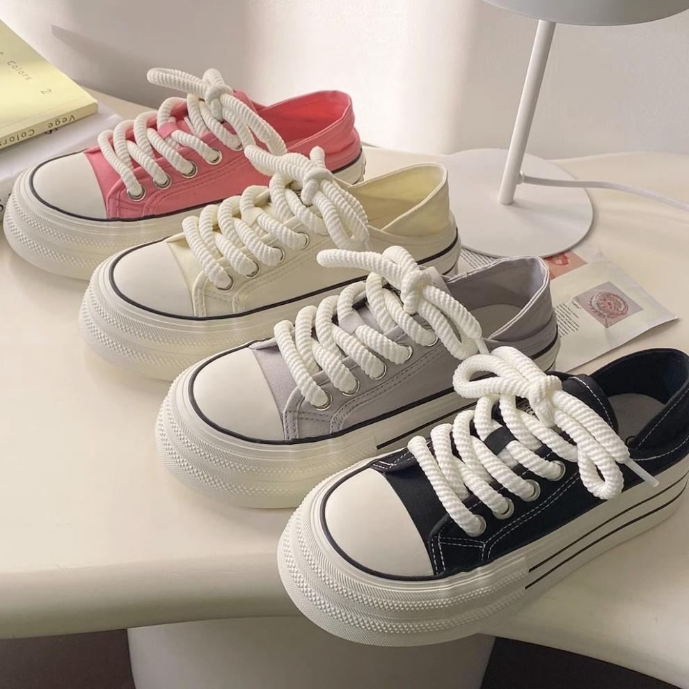 여성을위한 크림 화이트 두꺼운 밑창 투웨어 캔버스 신발 2025 새로운 여름 여성 신발 통기성 하프 슬립 온 화이트 신발스토어 가기