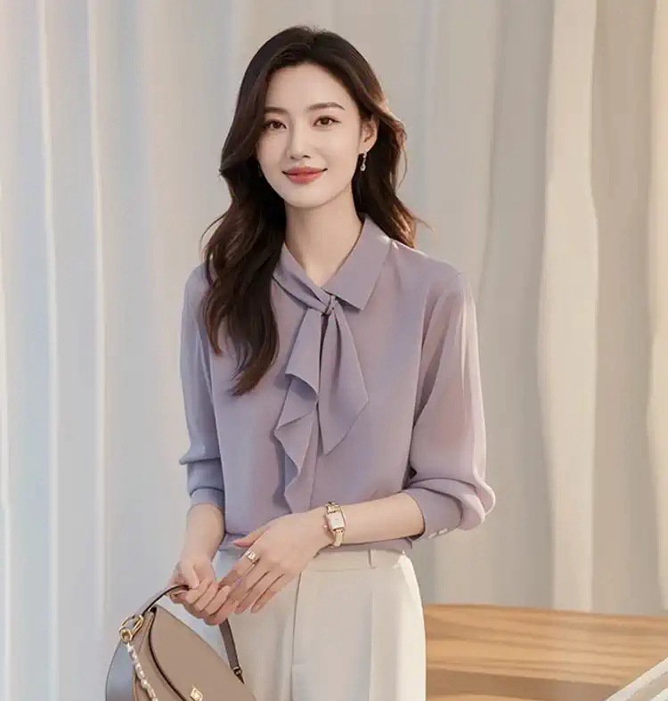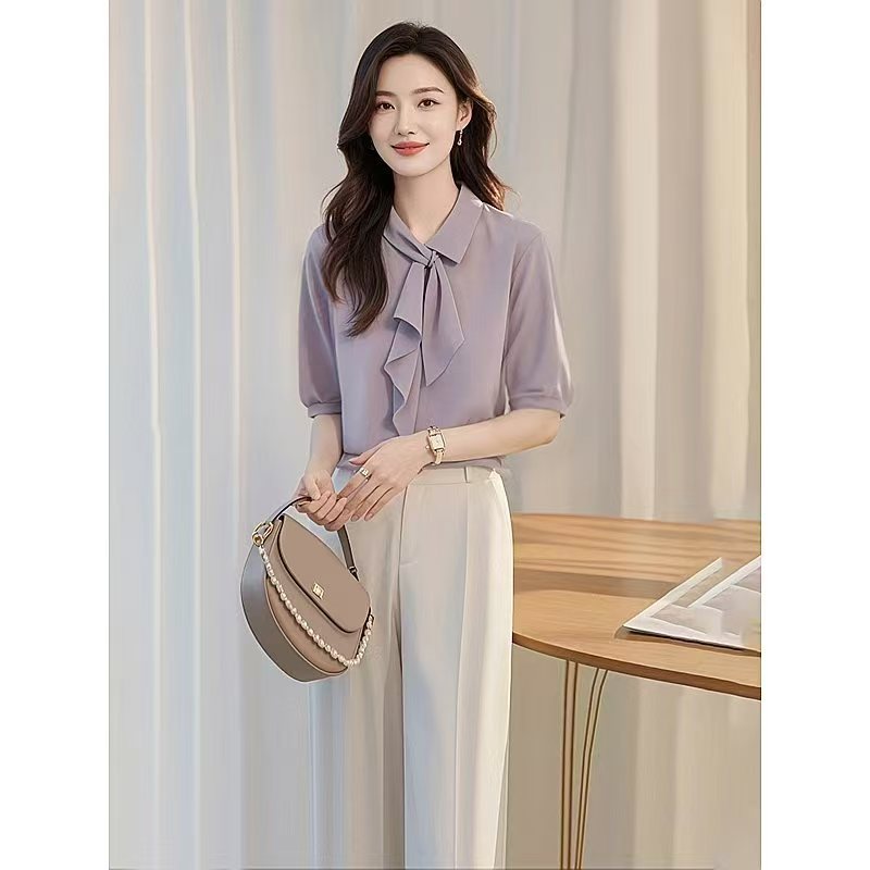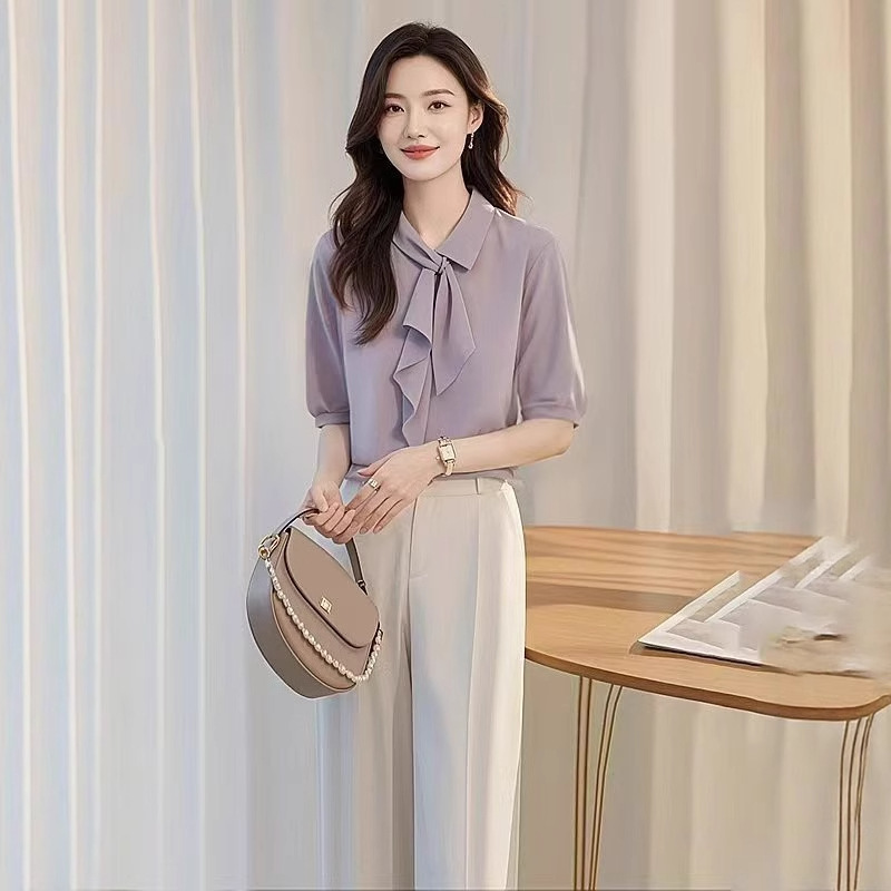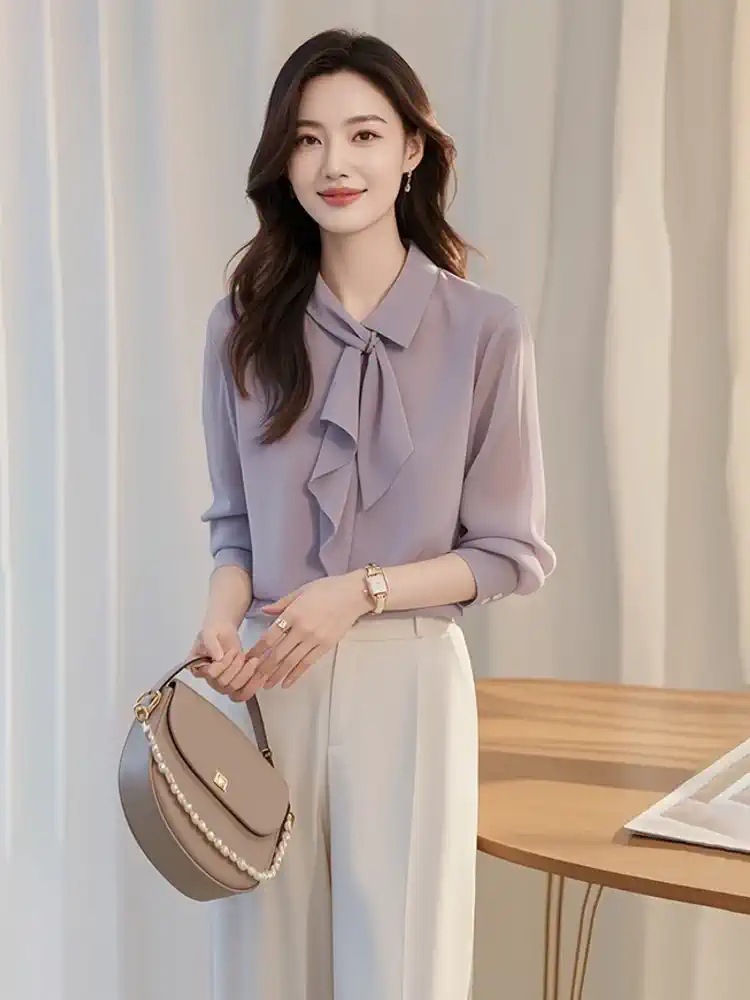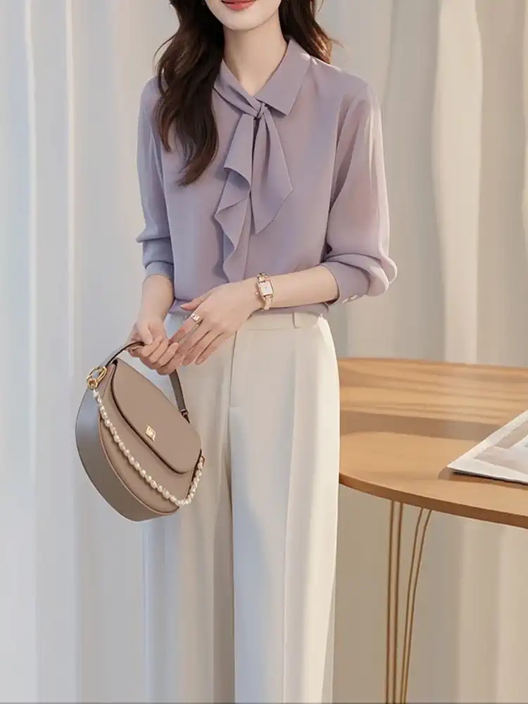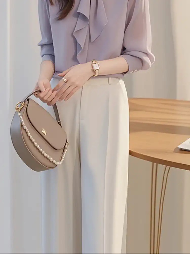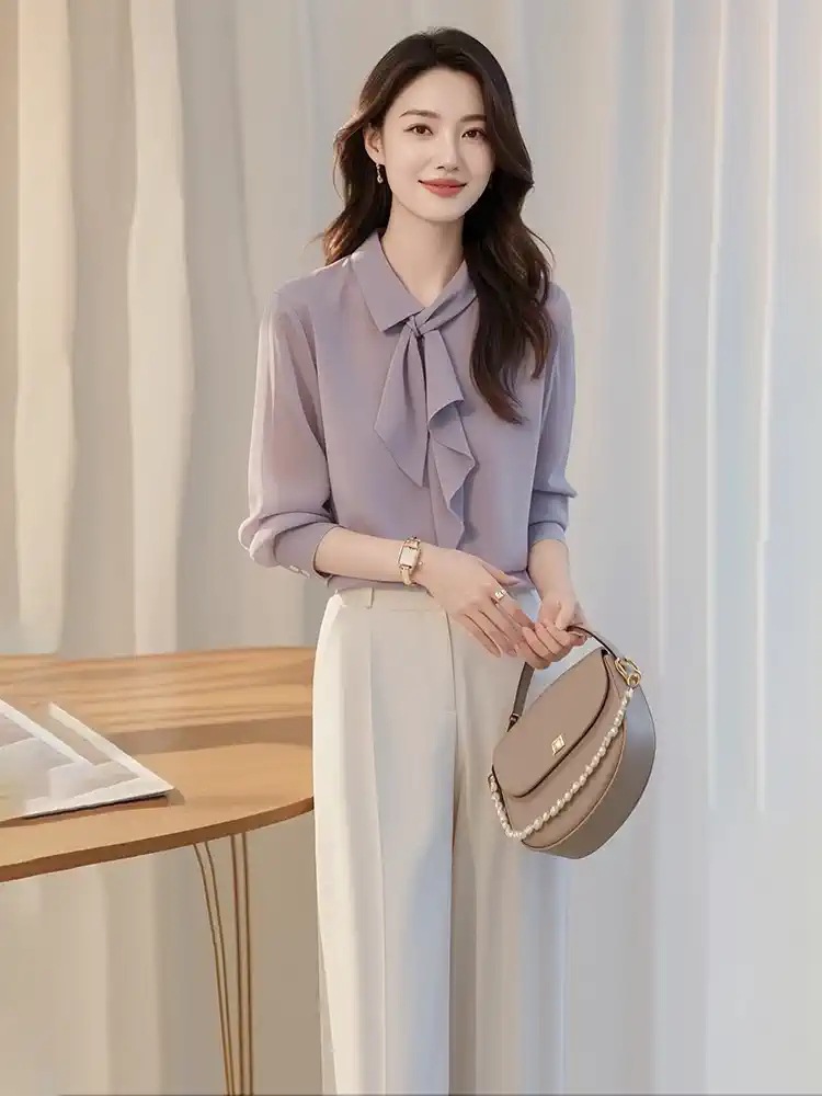 이른 가을 새로운 한국 스타일 세련된 콜드 스타일 독특한 세련된 보라색 셔츠 바지 두 캐주얼 전문 여성 세트스토어 가기