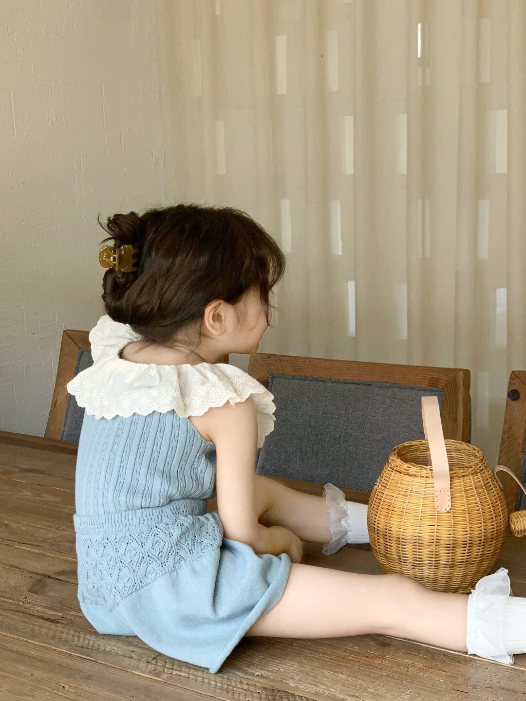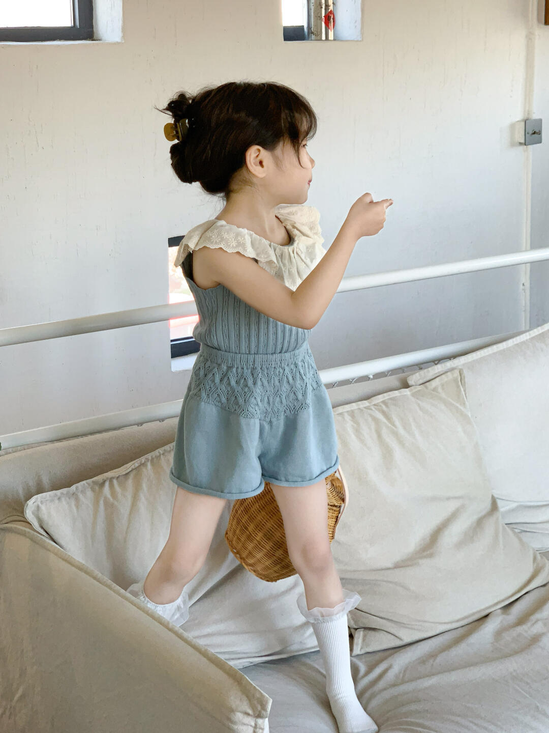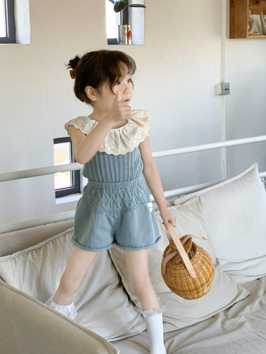 여자 여름 달콤한 스타일 레이스 인형 칼라 블루 니트 크로 셰 뜨개질 민소매 탑 조끼 + 반바지 세트
