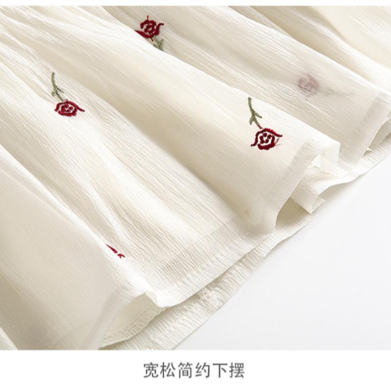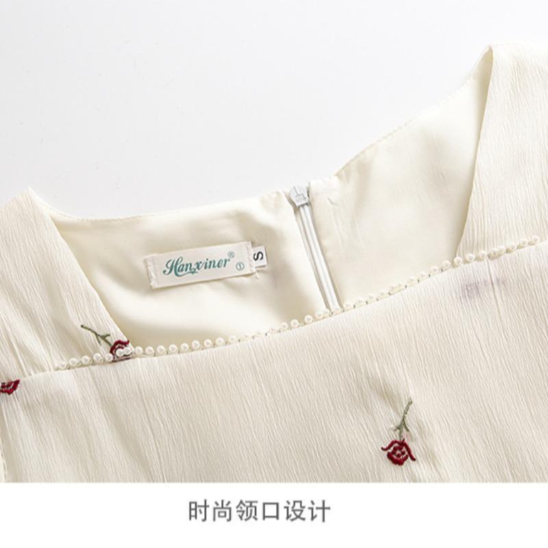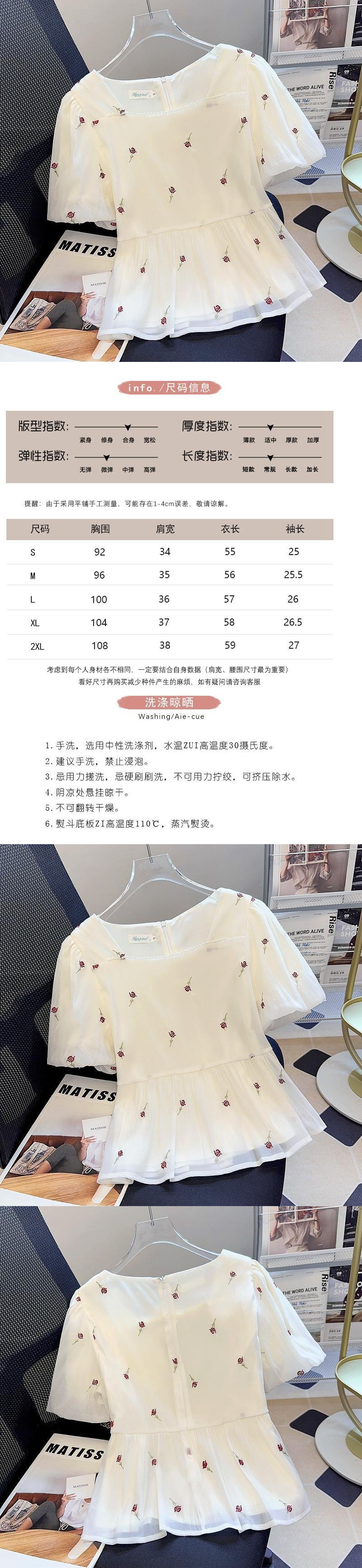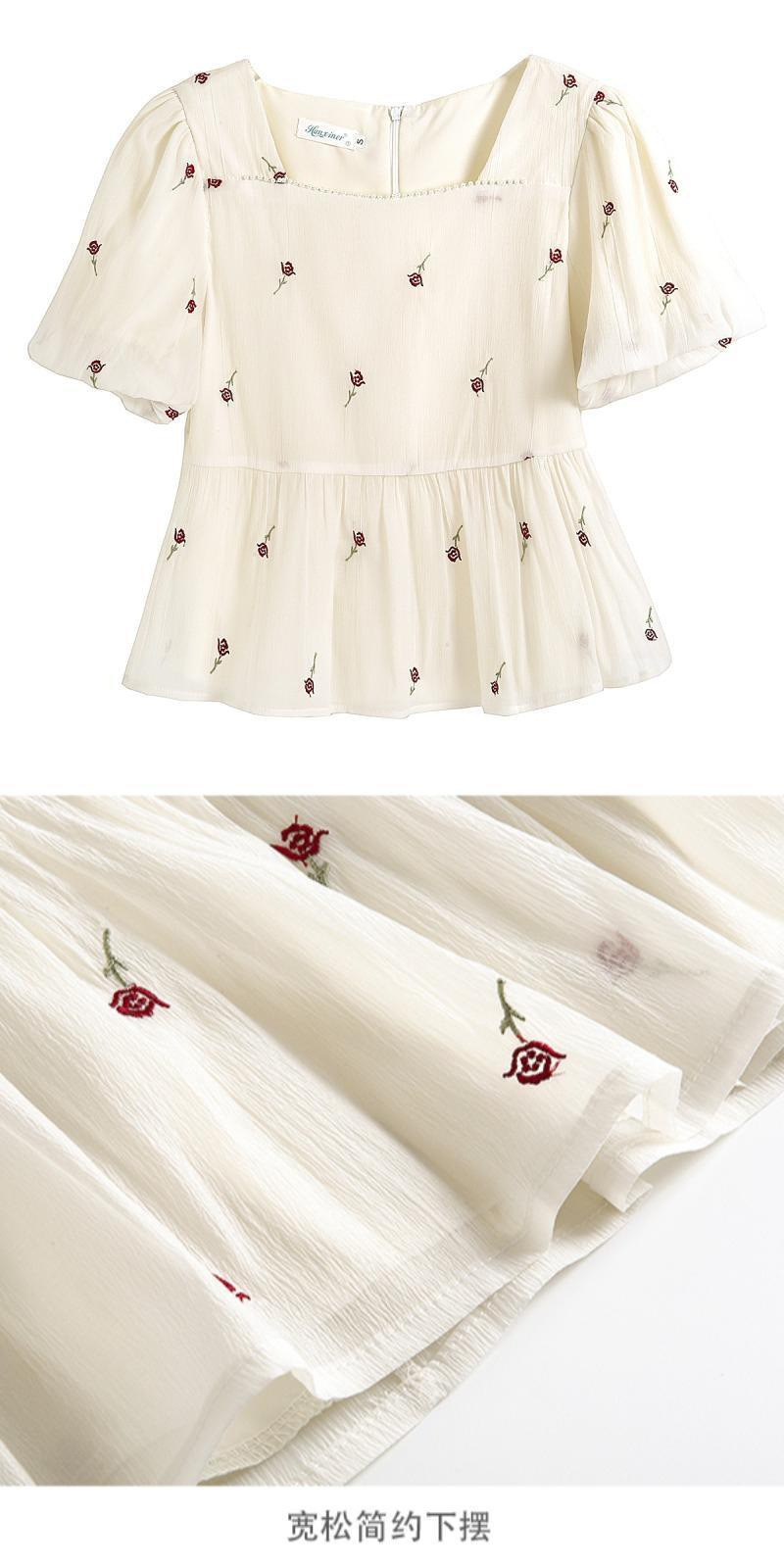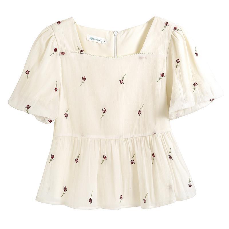 2024 여름 스퀘어 넥 꽃 자수 퍼프 슬리브 쉬폰 셔츠 여성 반팔 탑 짧은 스타일 프렌치 스타일스토어 가기