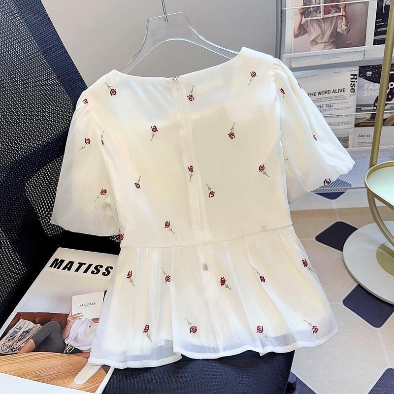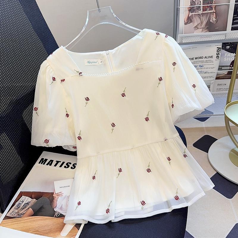 2024 여름 스퀘어 넥 꽃 자수 퍼프 슬리브 쉬폰 셔츠 여성 반팔 탑 짧은 스타일 프렌치 스타일