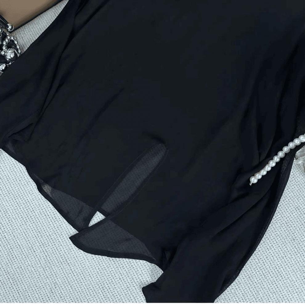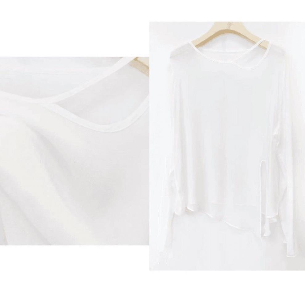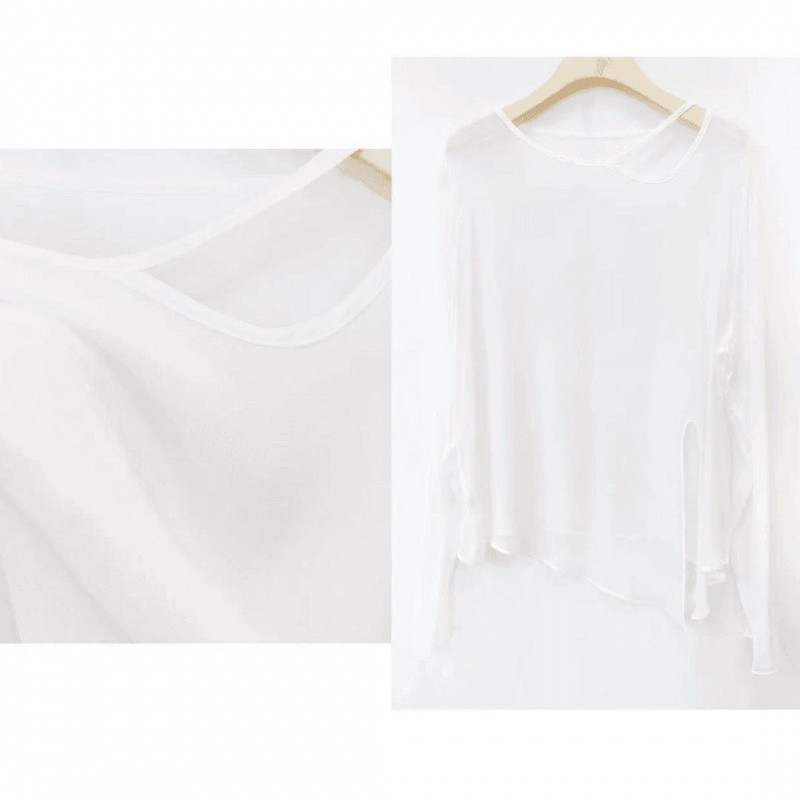 여름 블랙 브이넥 불규칙한 살짝 비치는 자외선 차단 블라우스 여성용 대형 긴팔 티셔츠 디자인 틈새 얇은 탑