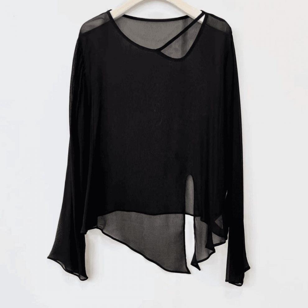 여름 블랙 브이넥 불규칙한 살짝 비치는 자외선 차단 블라우스 여성용 대형 긴팔 티셔츠 디자인 틈새 얇은 탑스토어 가기