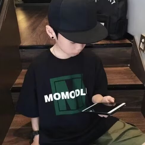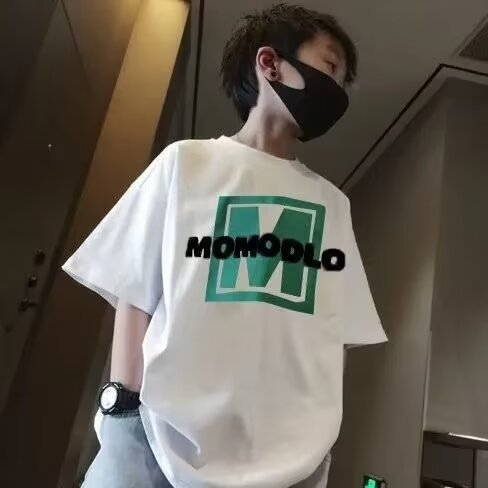 소년 티셔츠 반팔 어린이 여름 2024 새로운 잘 생긴 편지 인쇄 탑 소년 반팔 티셔츠