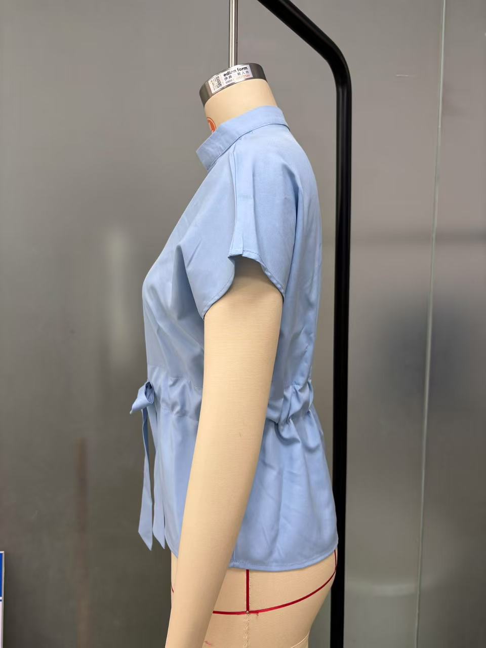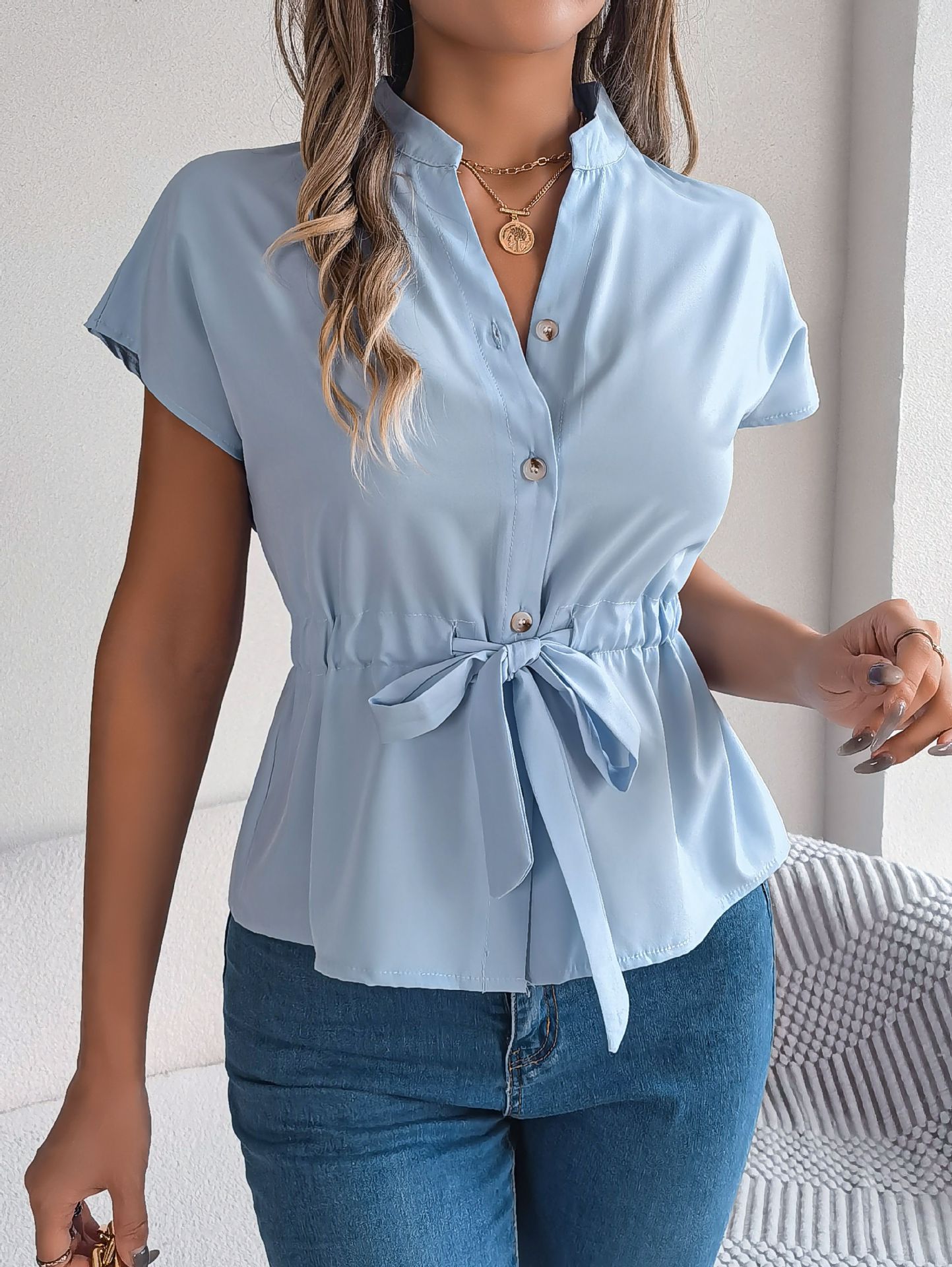2025 여름 아마존 크로스보더 셔츠 반팔 쉬폰 브이넥 버튼 셔츠 우아한 벨트 스타일 여성 의류스토어 가기