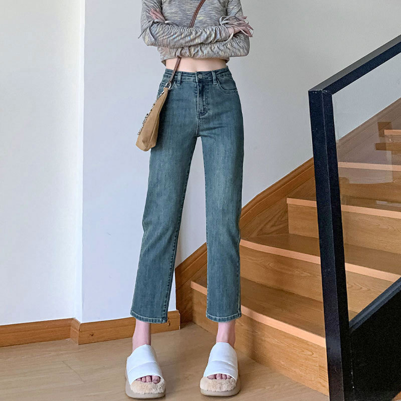 스트레치 작은 스트레이트 레그 청바지 여성용 틈새 슬림 핏 그린 라벨 디자인 높은 허리 자른 배 모양의 빈티지 연기 튜브 바지스토어 가기