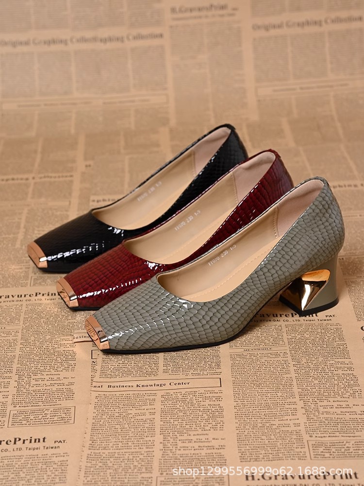 여성용 뱀 무늬 금속 철제 토우 펌프스, 봄, 가을 프렌치 스타일, 두꺼운 굽, 다재다능하고 편안한 중간 굽의 작은 가죽 신발