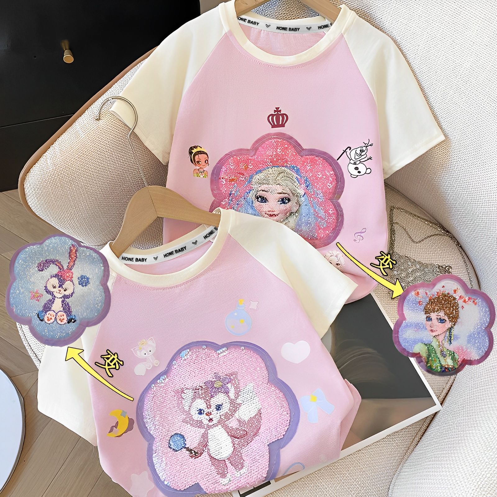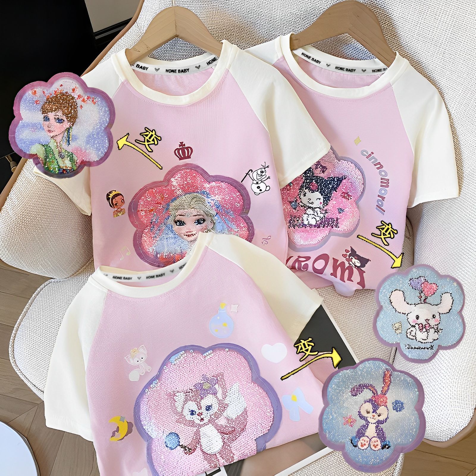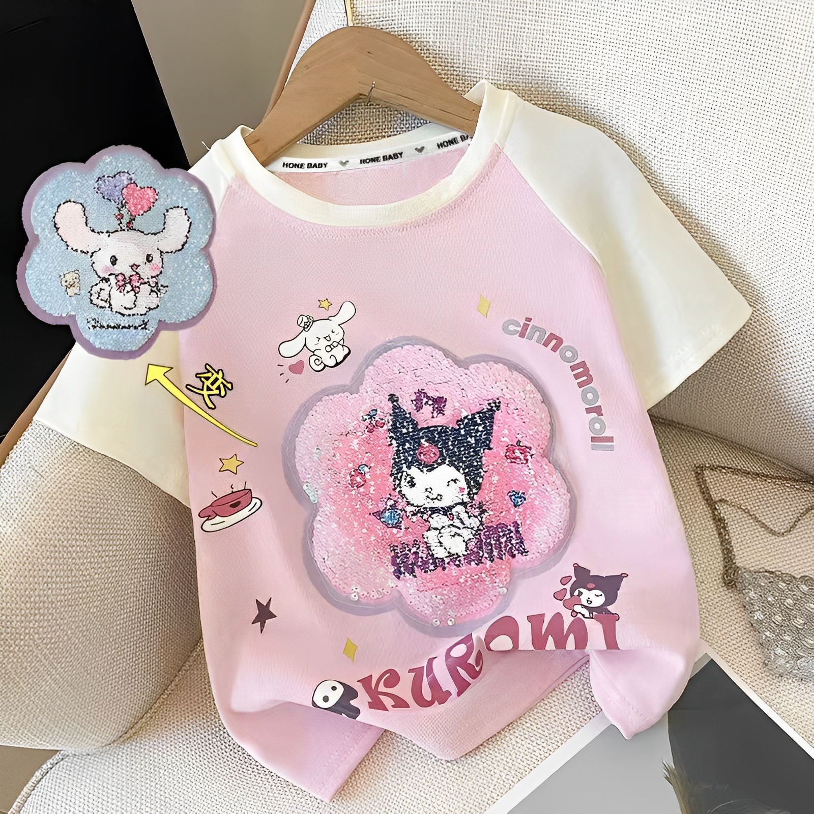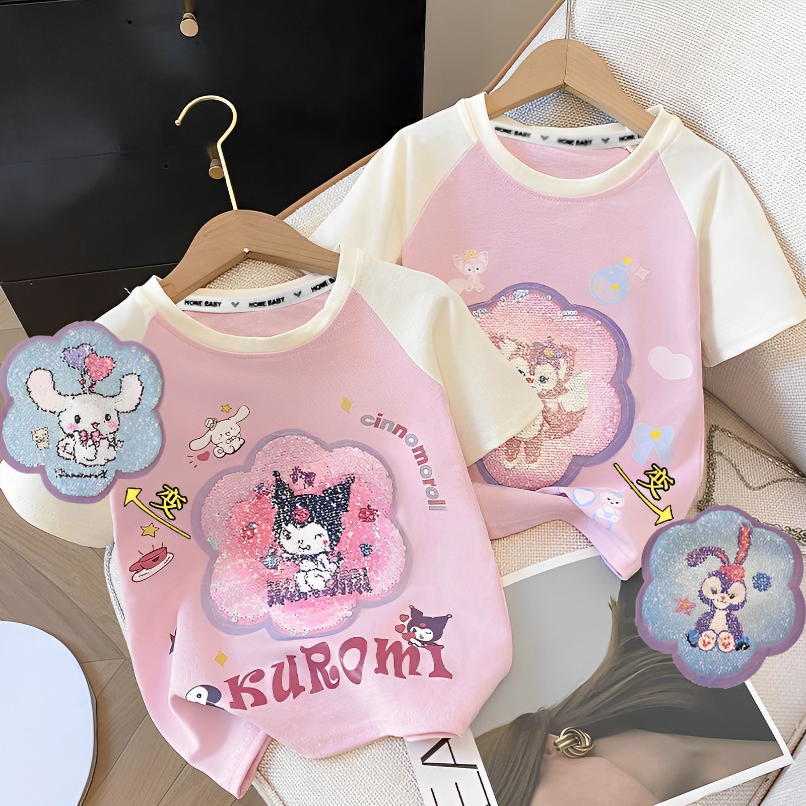 아동복 쿠로미 아동 티셔츠 여름 순면 여아 반팔 티셔츠 색상 변경 스팽글 패턴 라글란 탑