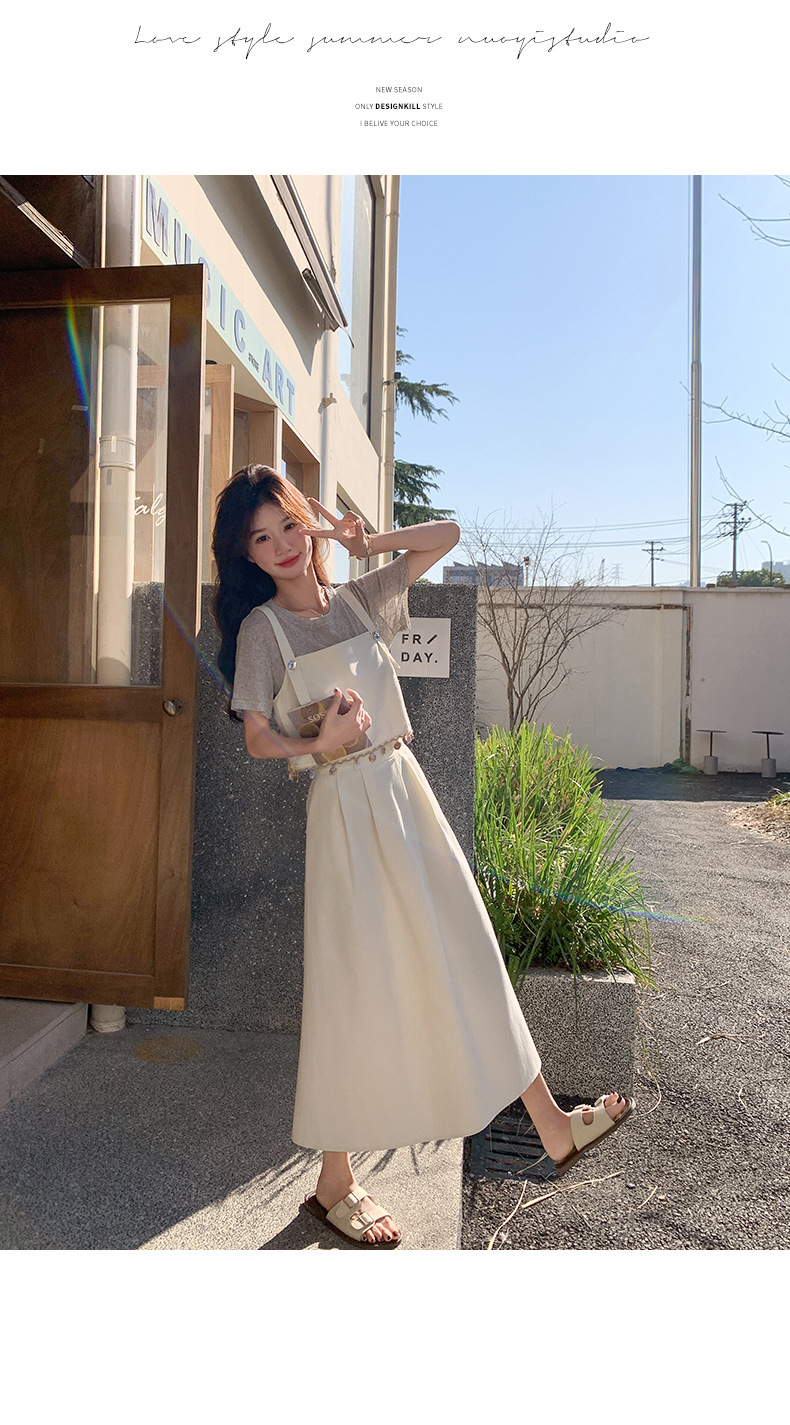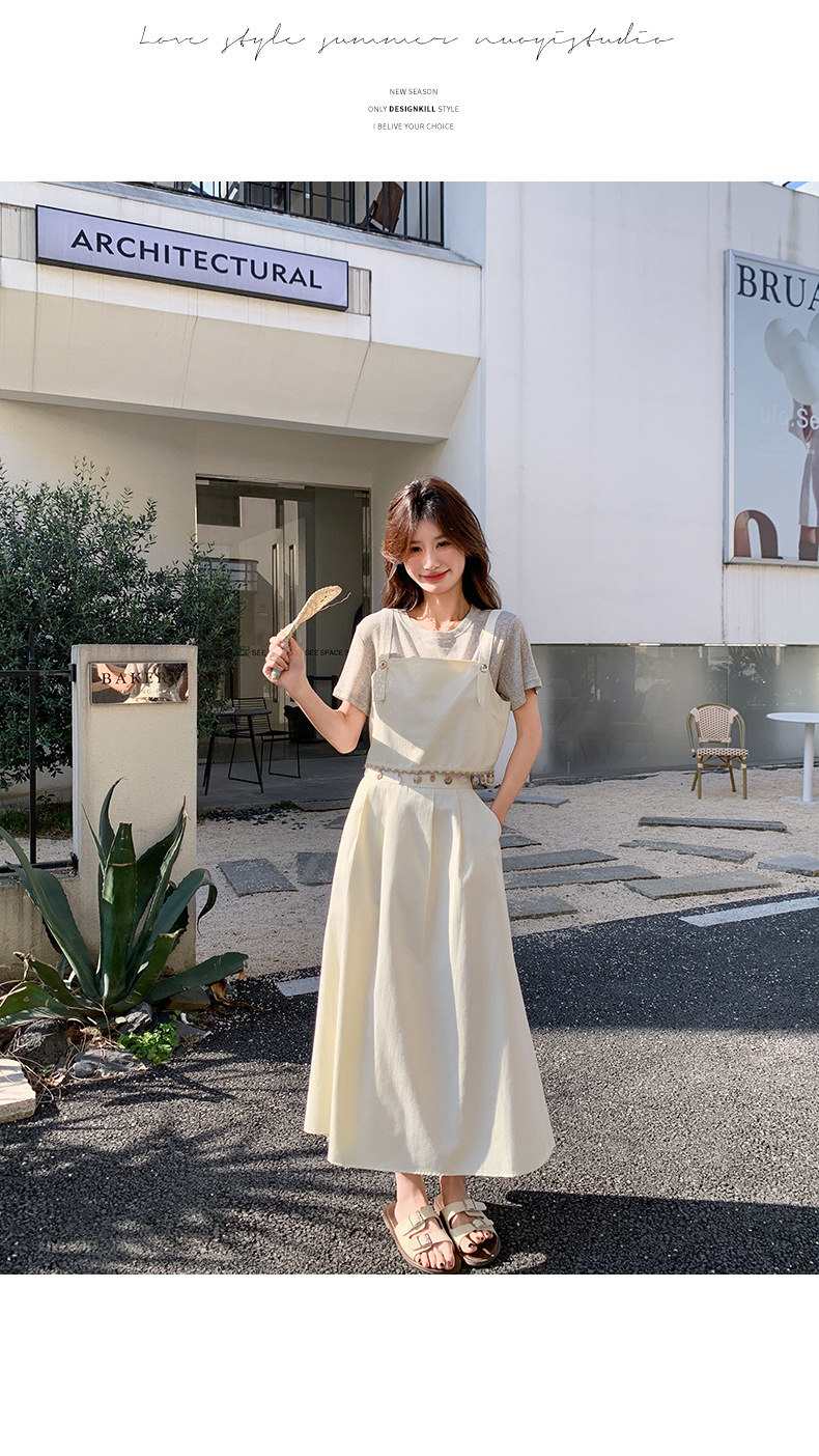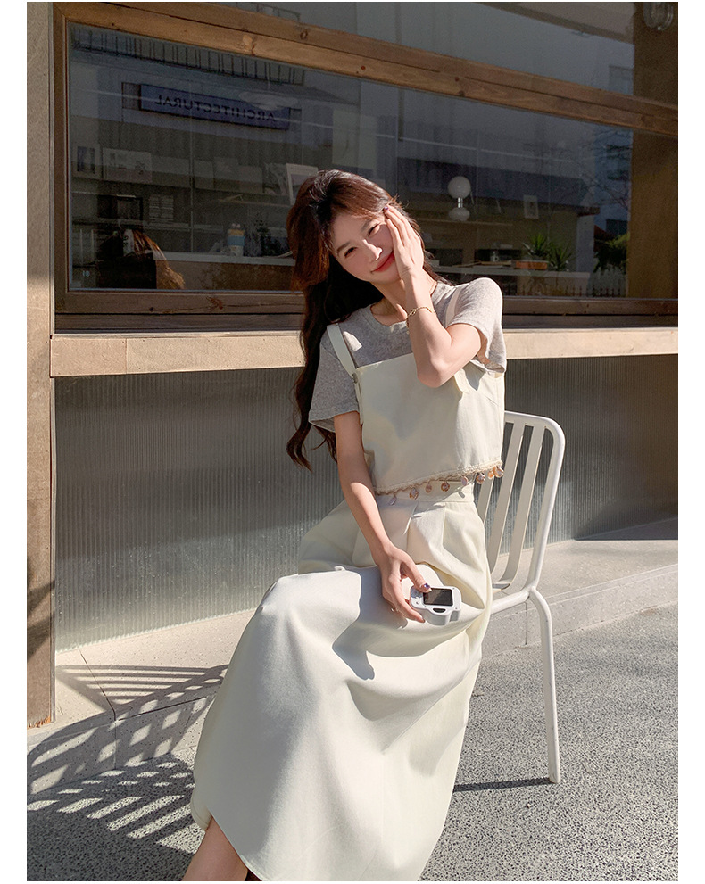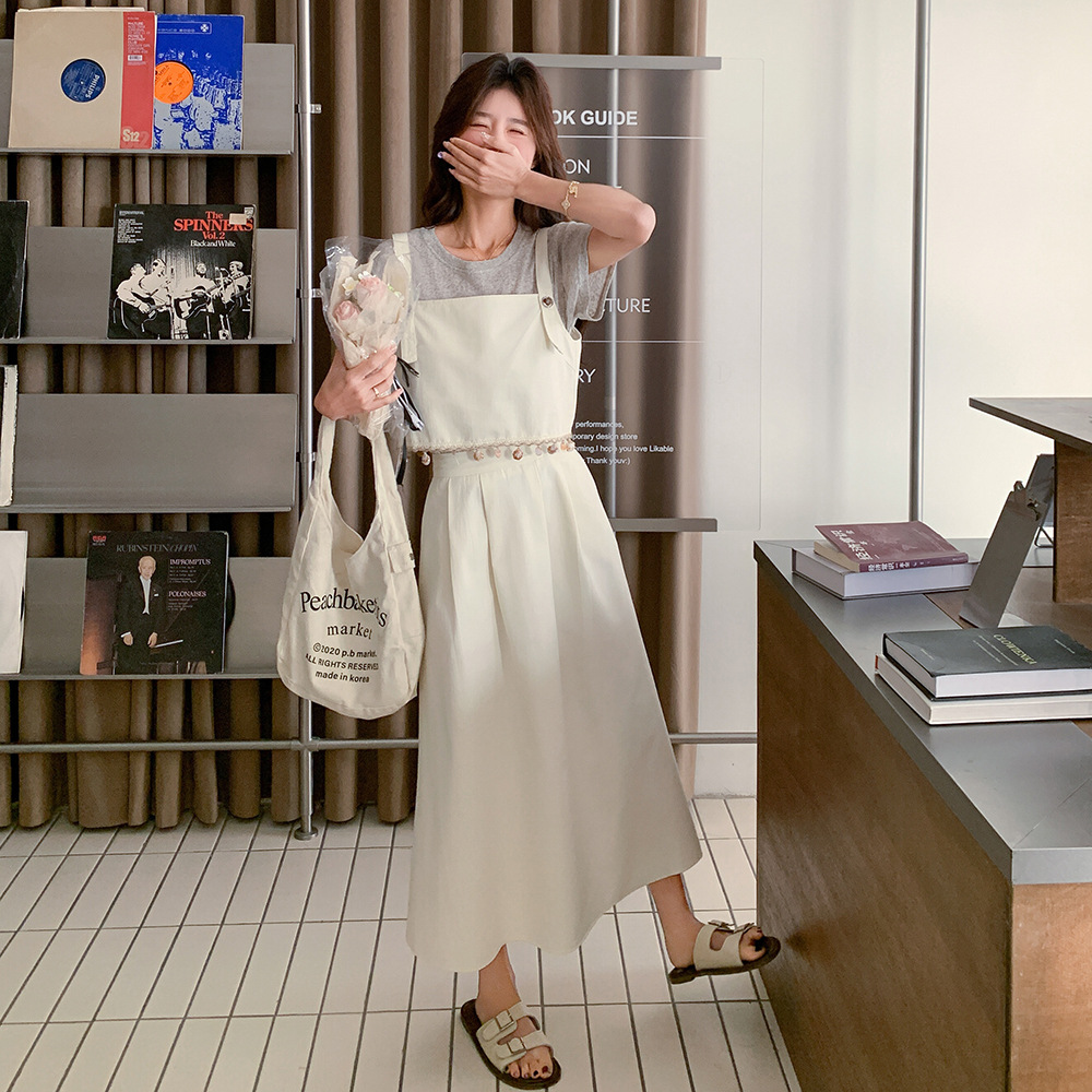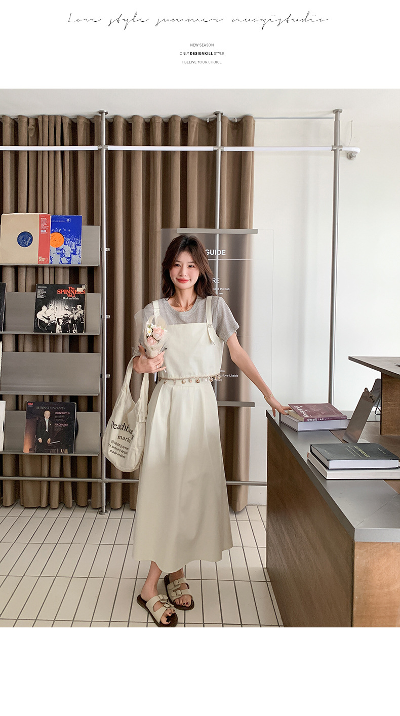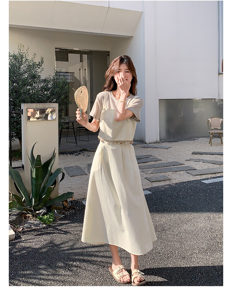 리얼 샷 2025 여름 새로운 한국식 기질 올 매치 슬림 스트랩 라운드 넥 티셔츠 스커트 3 피스 세트