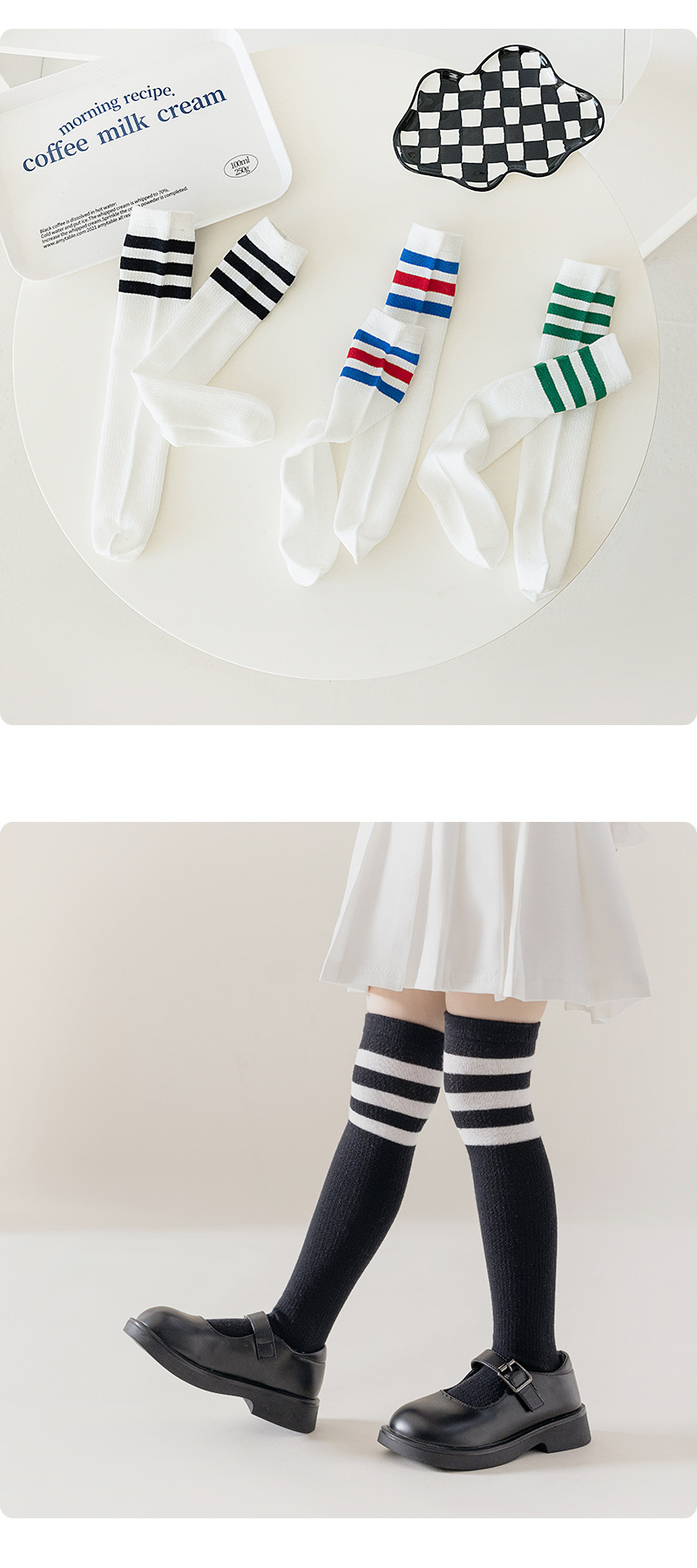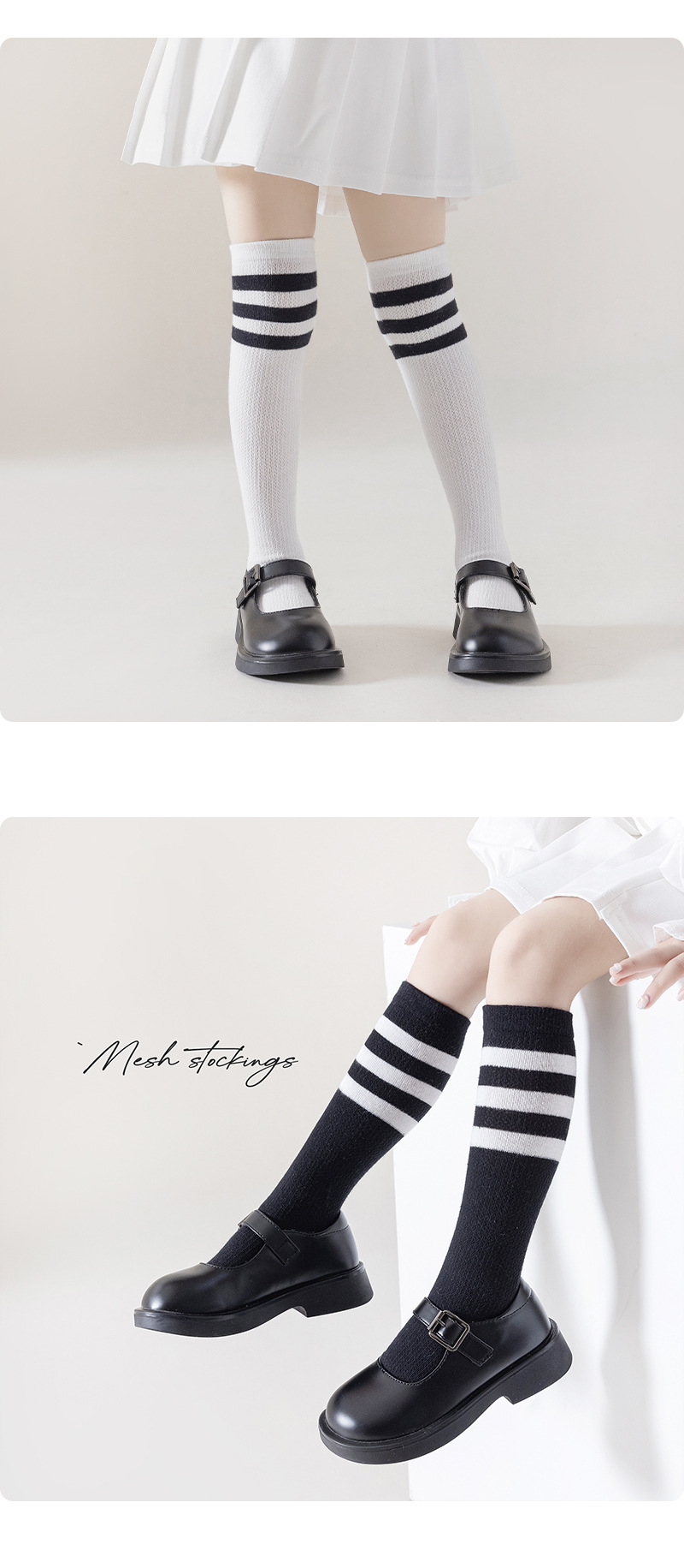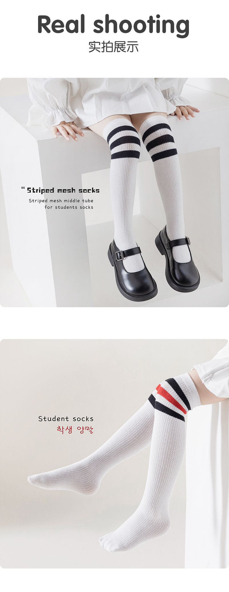 메쉬 학생면 양말 2025 여름 새로운 평행 바 줄무늬 소년 소녀 종아리 무릎 양말 어린이 양말 도매