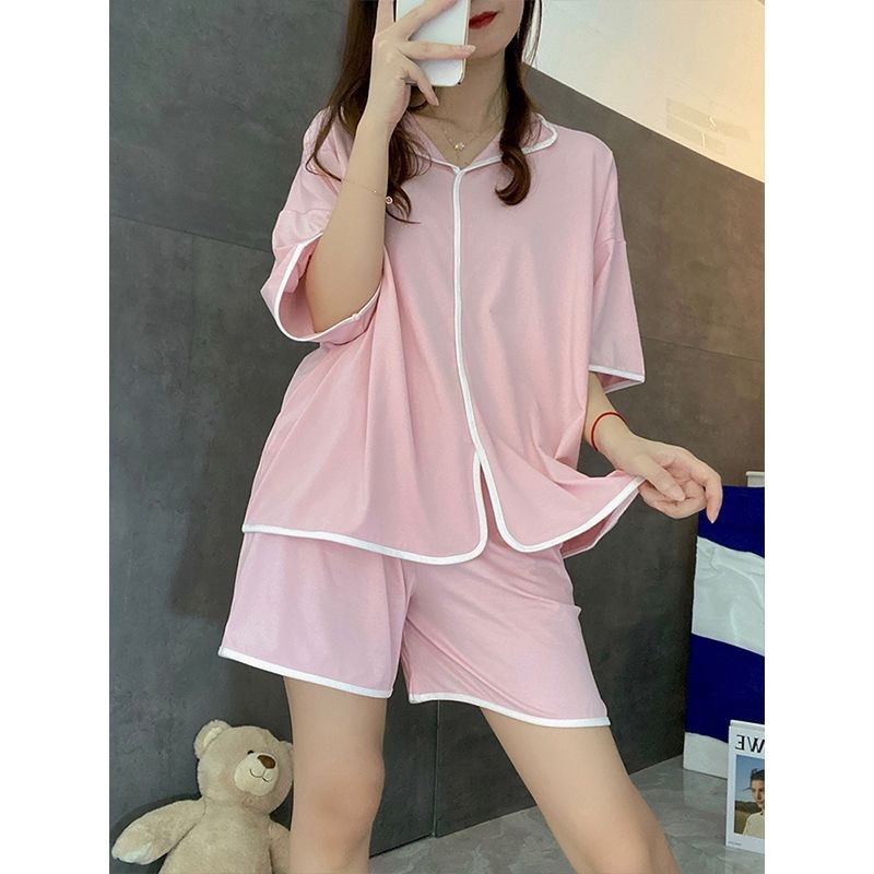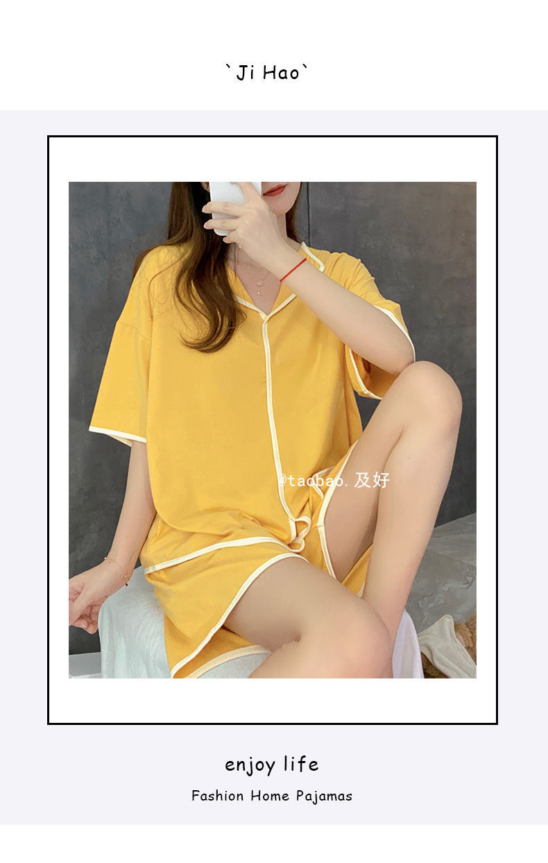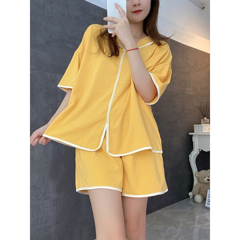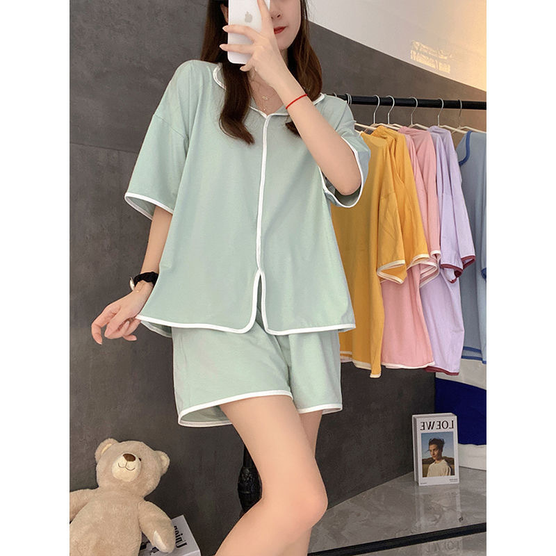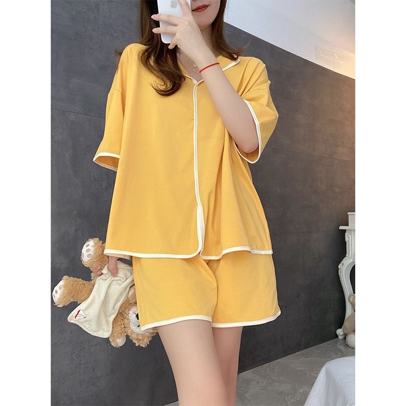 코튼 파자마 여성 여름 반팔 반바지 세트 느슨한 여름 솔리드 컬러 얇은 캐주얼 홈 의류 일본식 의류스토어 가기