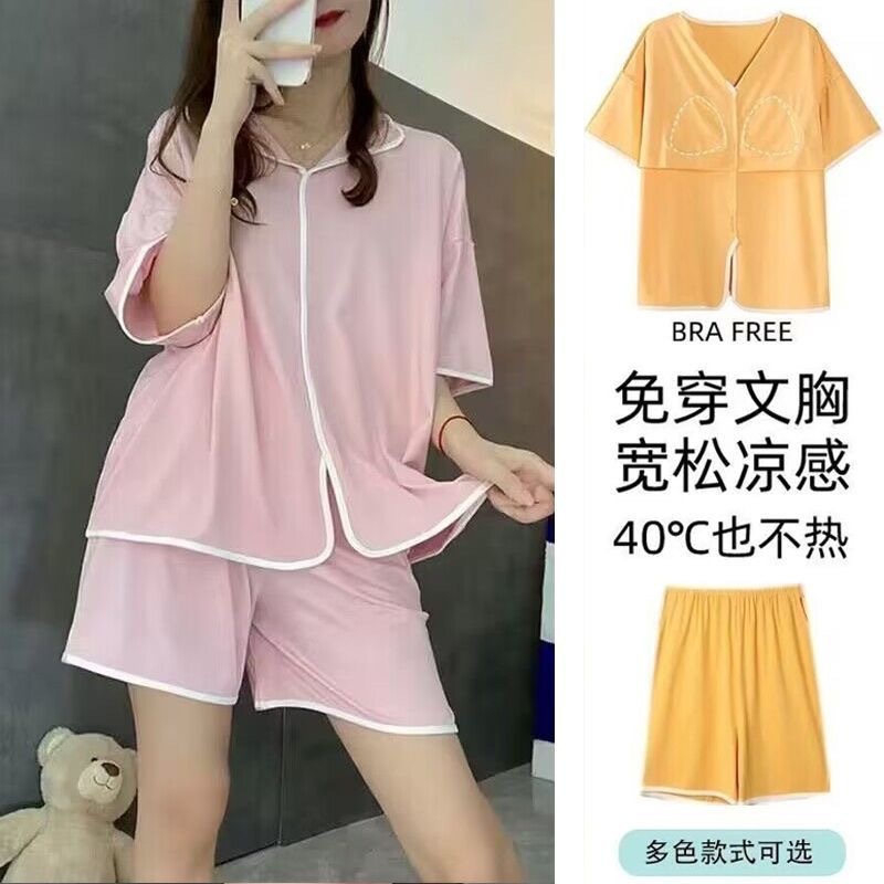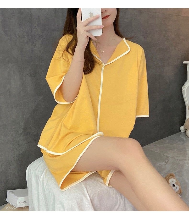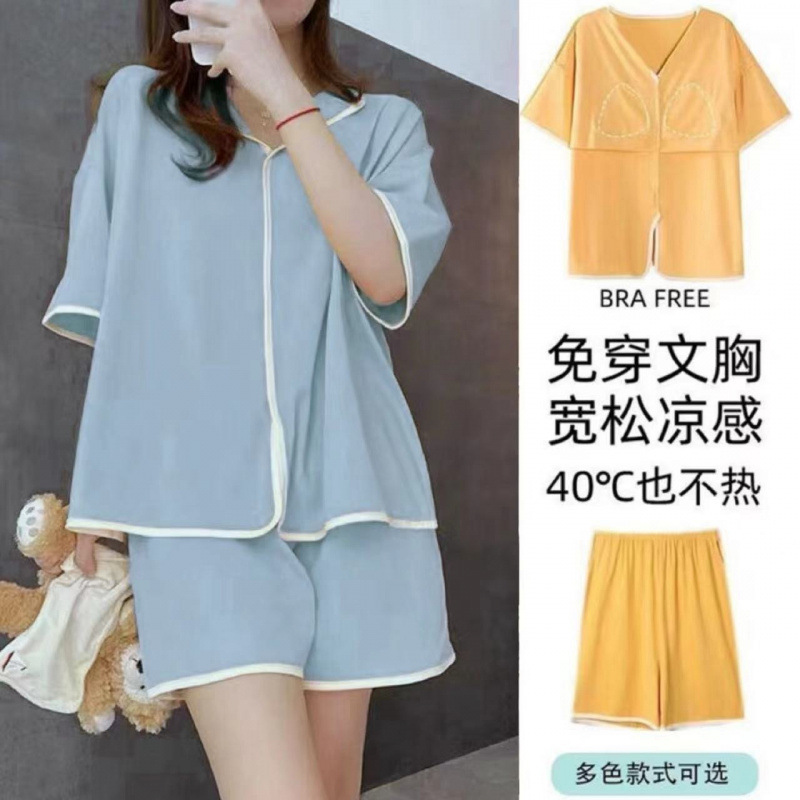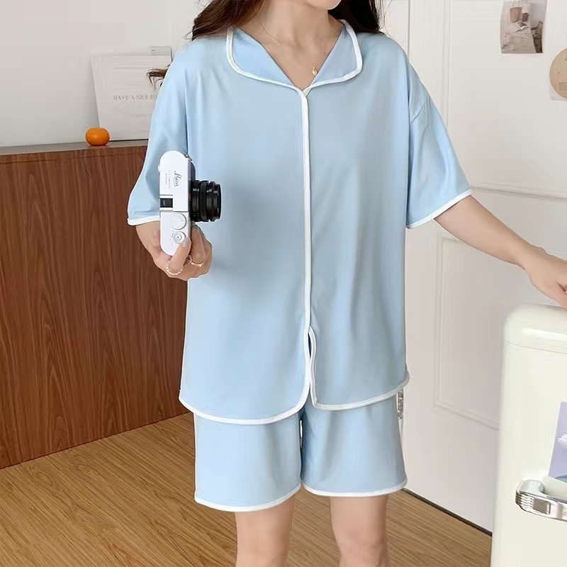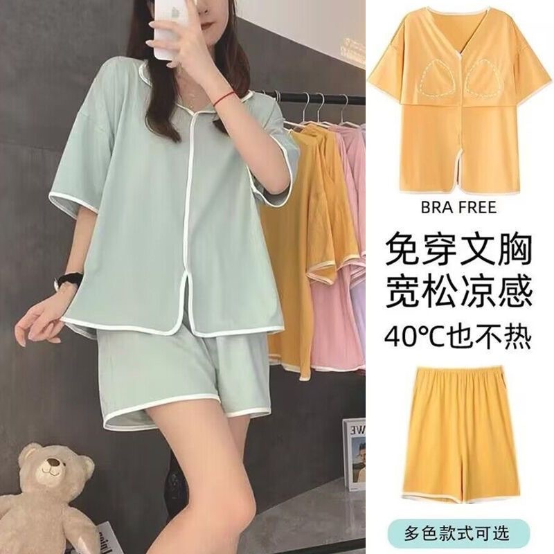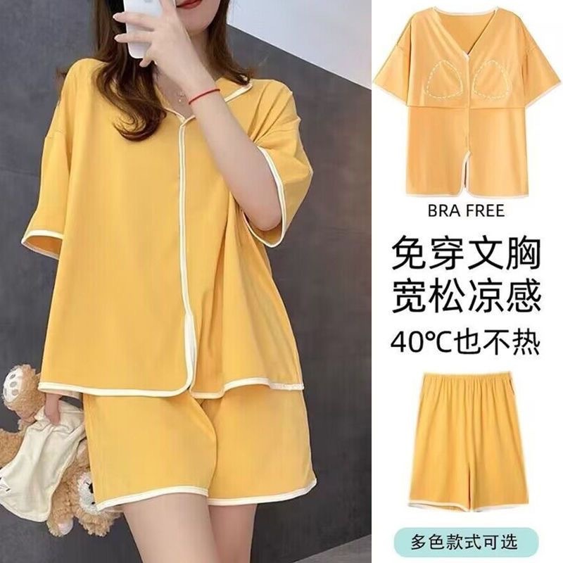 코튼 파자마 여성 여름 반팔 반바지 세트 느슨한 여름 솔리드 컬러 얇은 캐주얼 홈 의류 일본식 의류스토어 가기