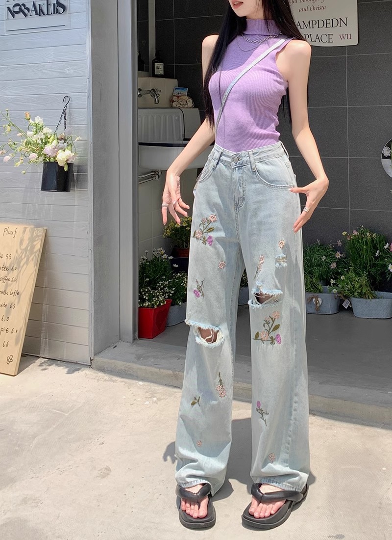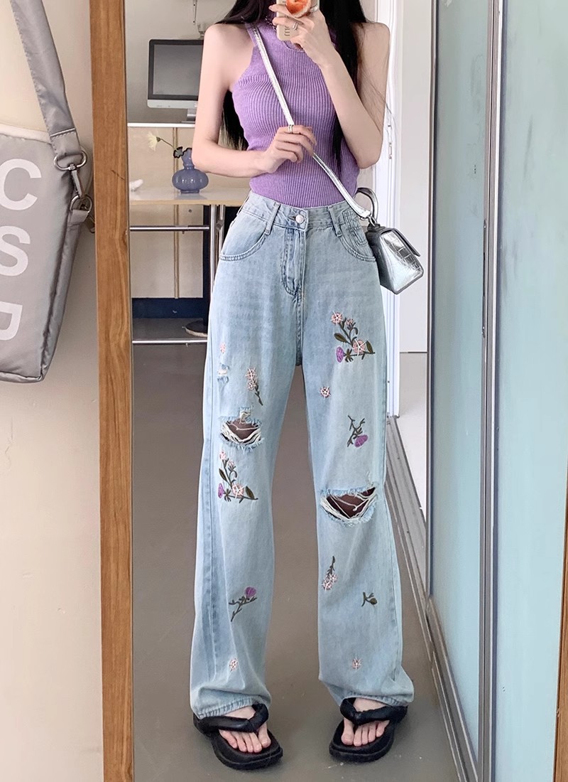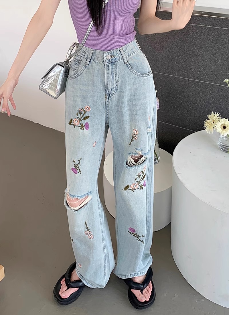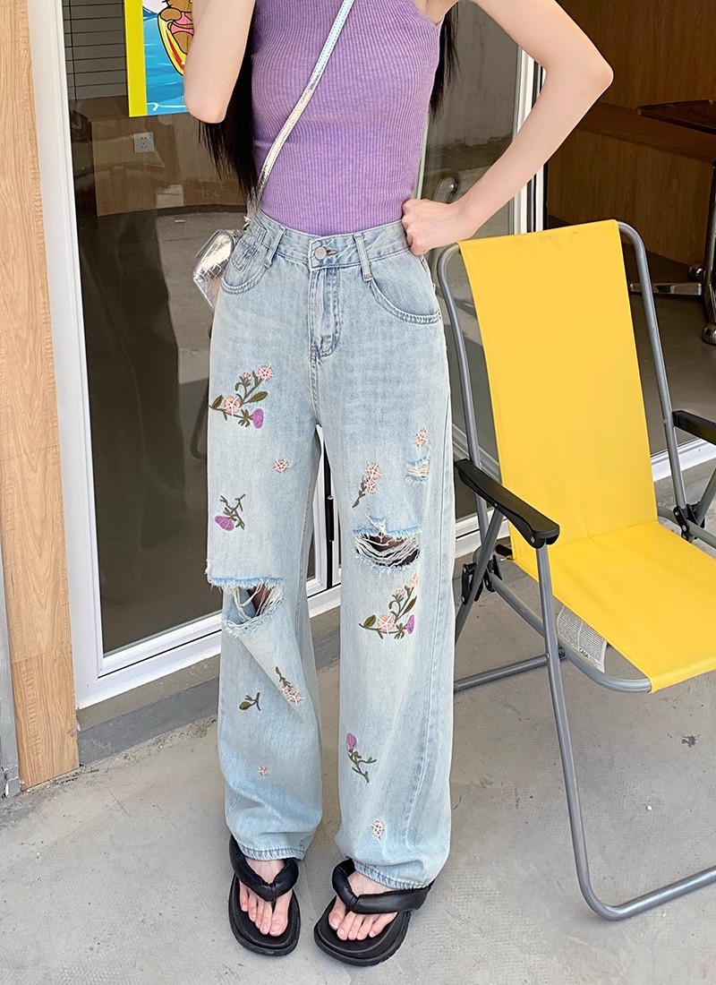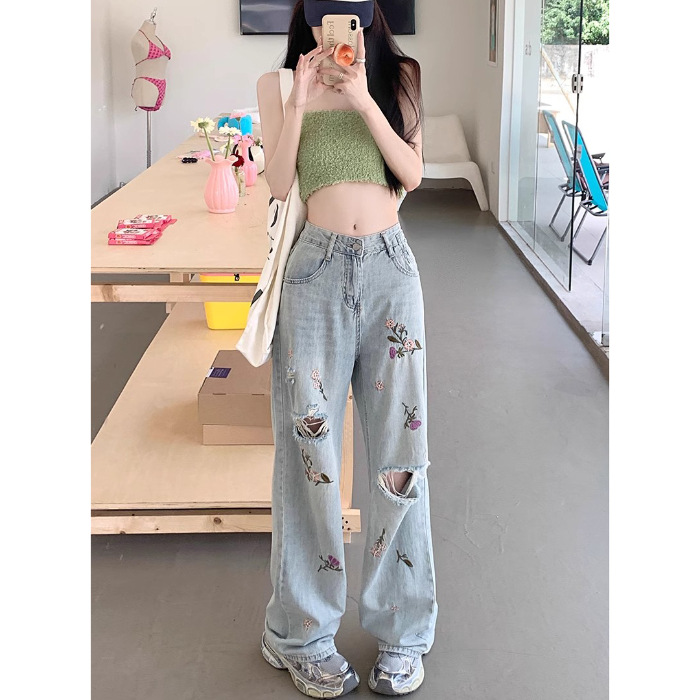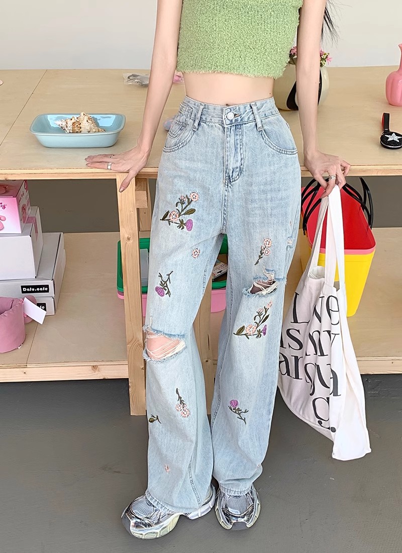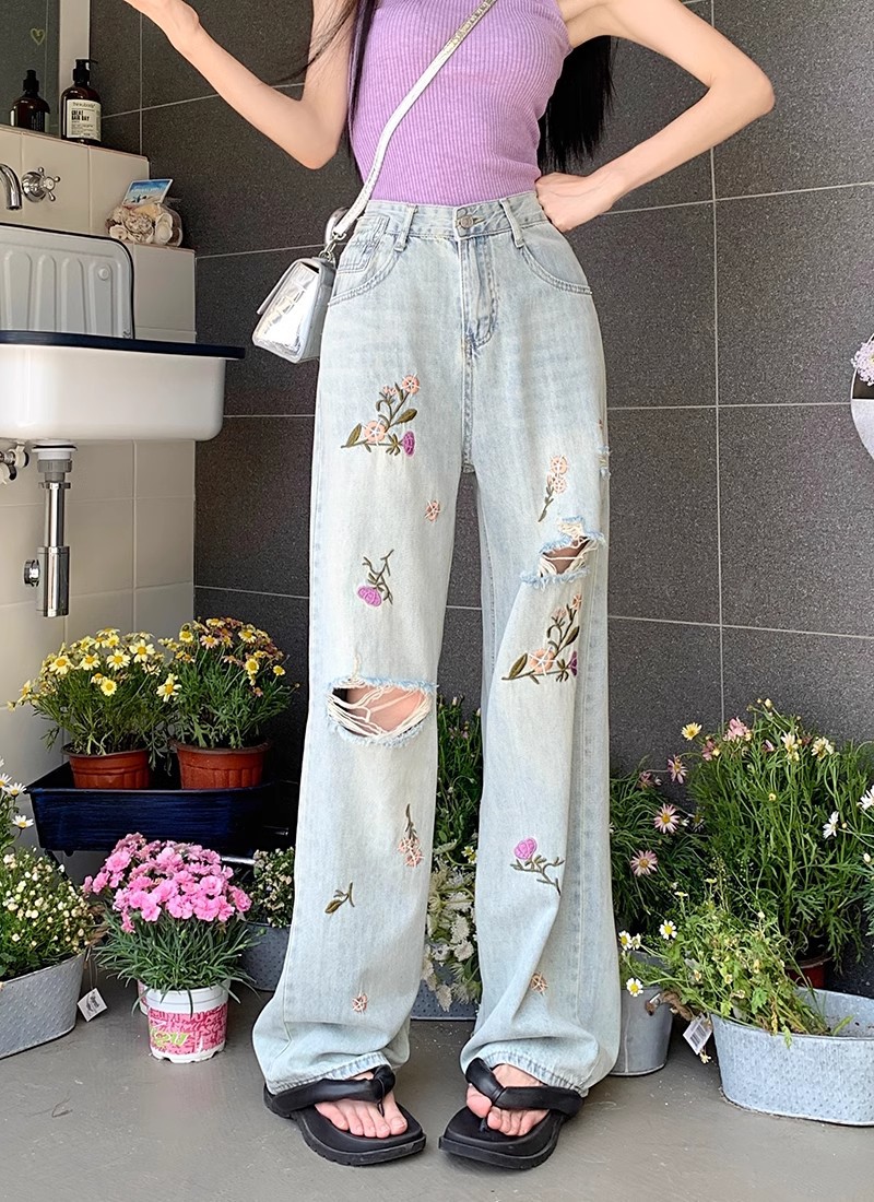 무거운 의무 꽃 자수 찢어진 넓은 다리 청바지 여성의 2024 여름 높은 허리 슬리밍 디자인 센스 스트레이트 바지스토어 가기