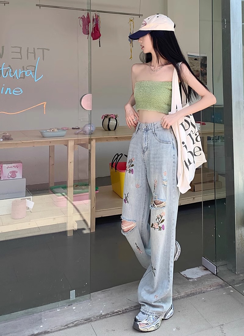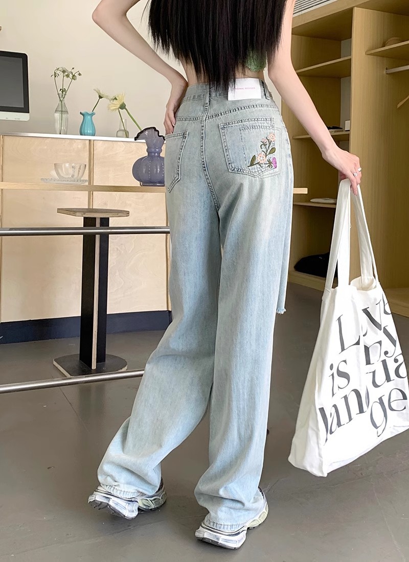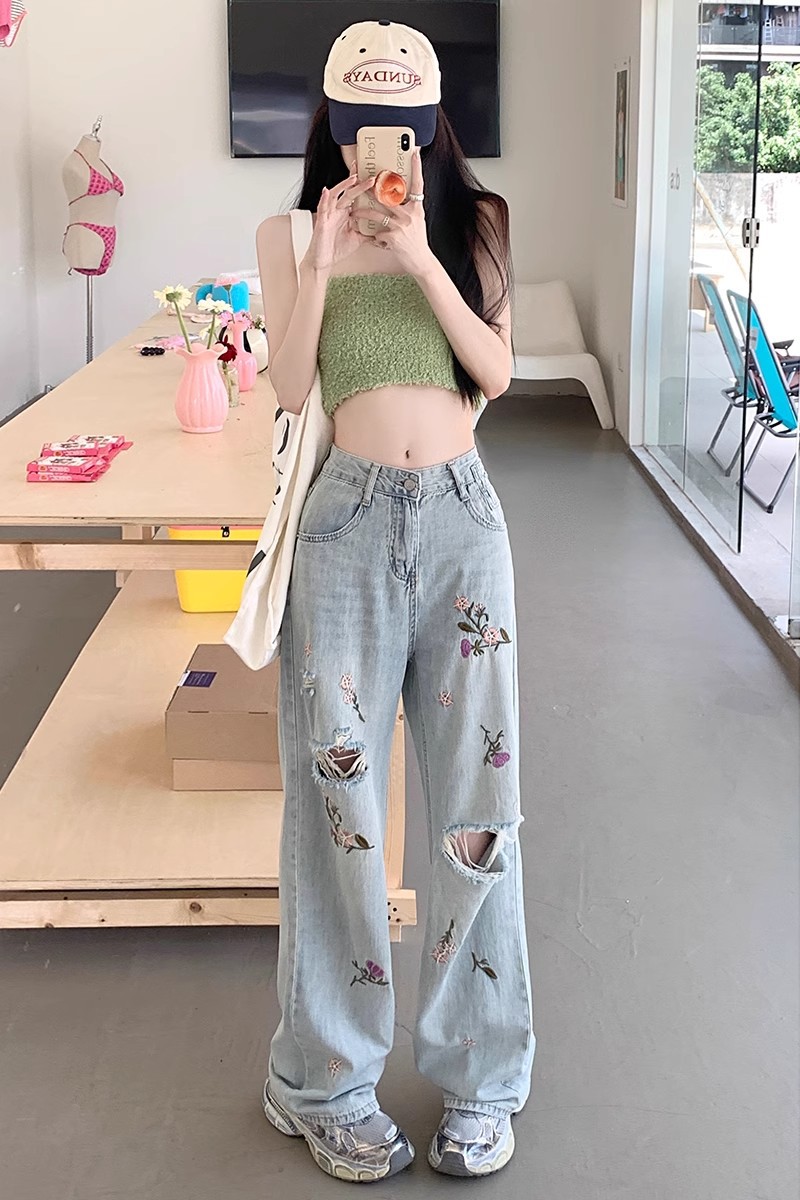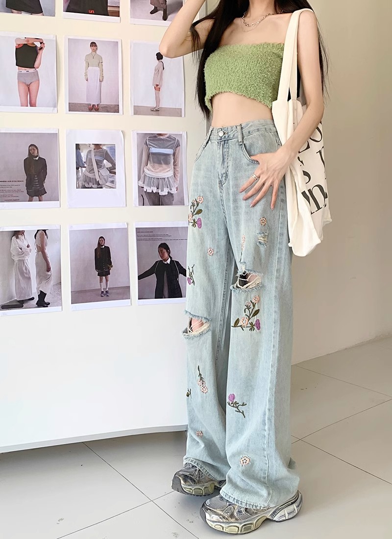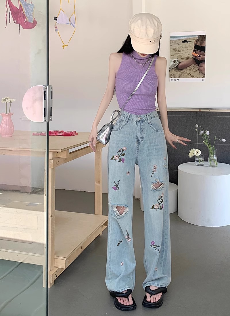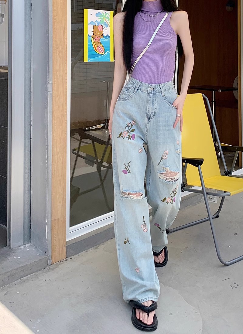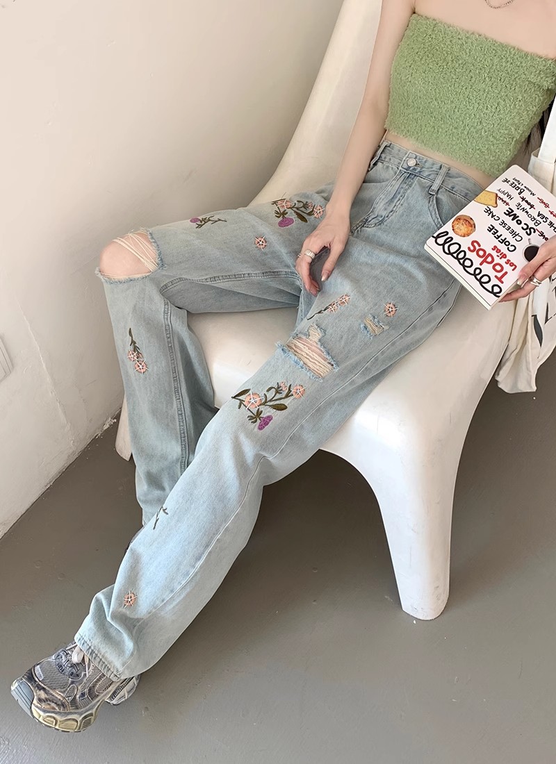 무거운 의무 꽃 자수 찢어진 넓은 다리 청바지 여성의 2024 여름 높은 허리 슬리밍 디자인 센스 스트레이트 바지스토어 가기