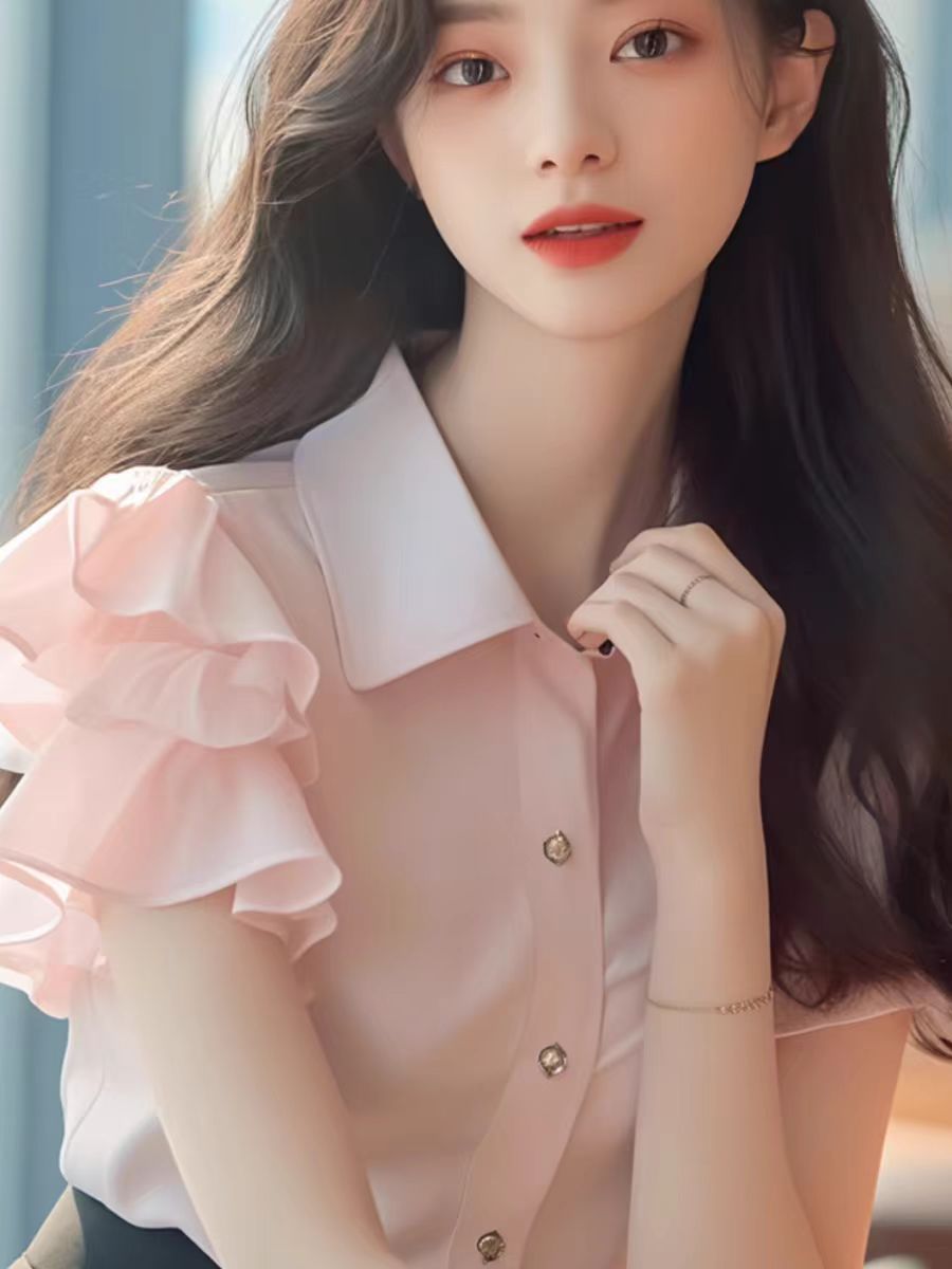 유럽의 아름다운 패션 캐주얼 기질 높은 감각 슈퍼 잘 생긴 탑 블루 프릴 짧은 소매 셔츠 여성의 여름